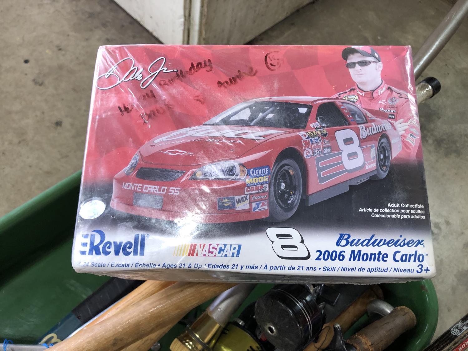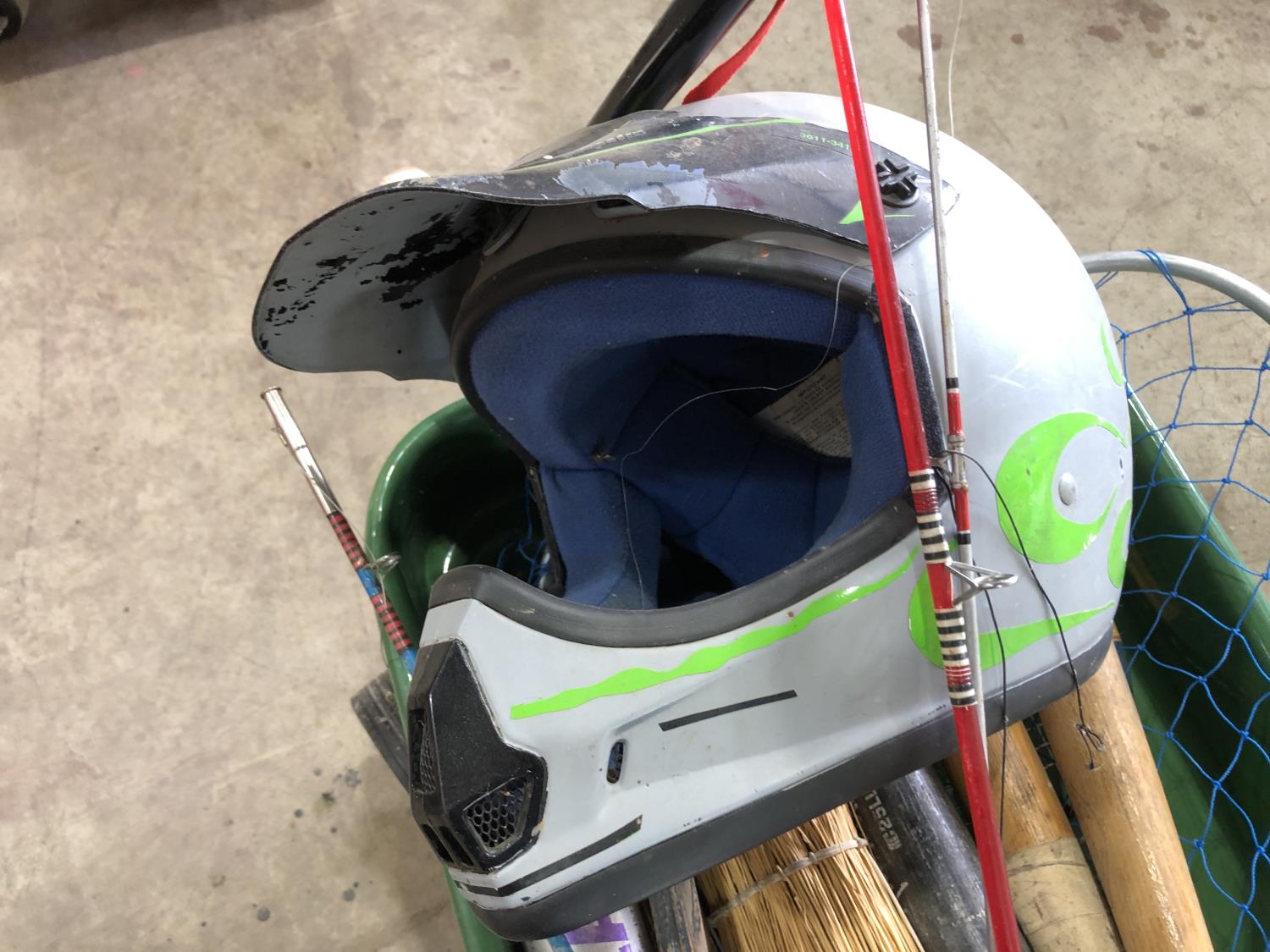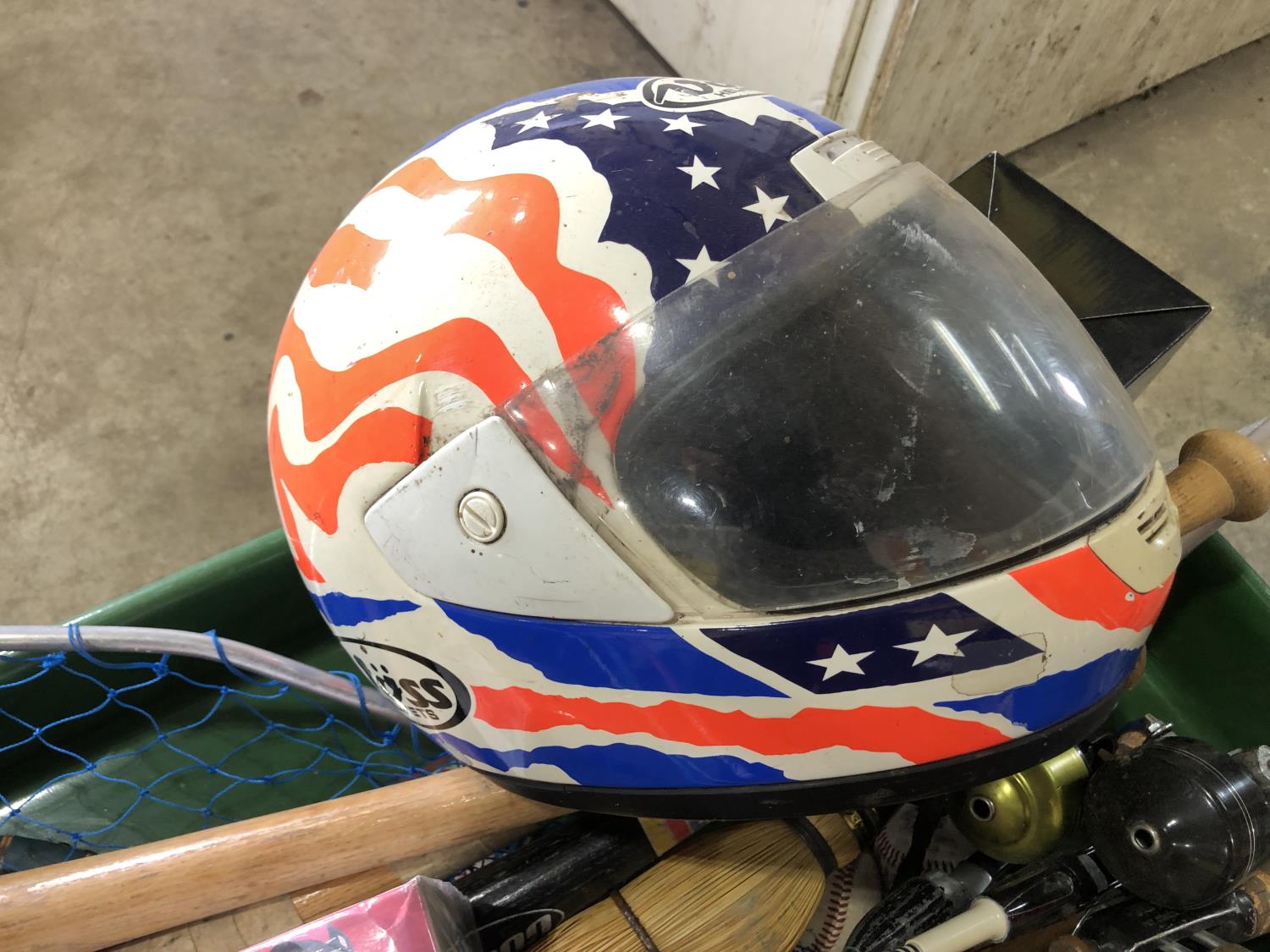 (6) baseball bats, hockey stick, broom, (2) bike helmets, mini football (unused), (2) baseballs, Revel Nascar model car (unused), fishing net & (3) rods, tennis racket