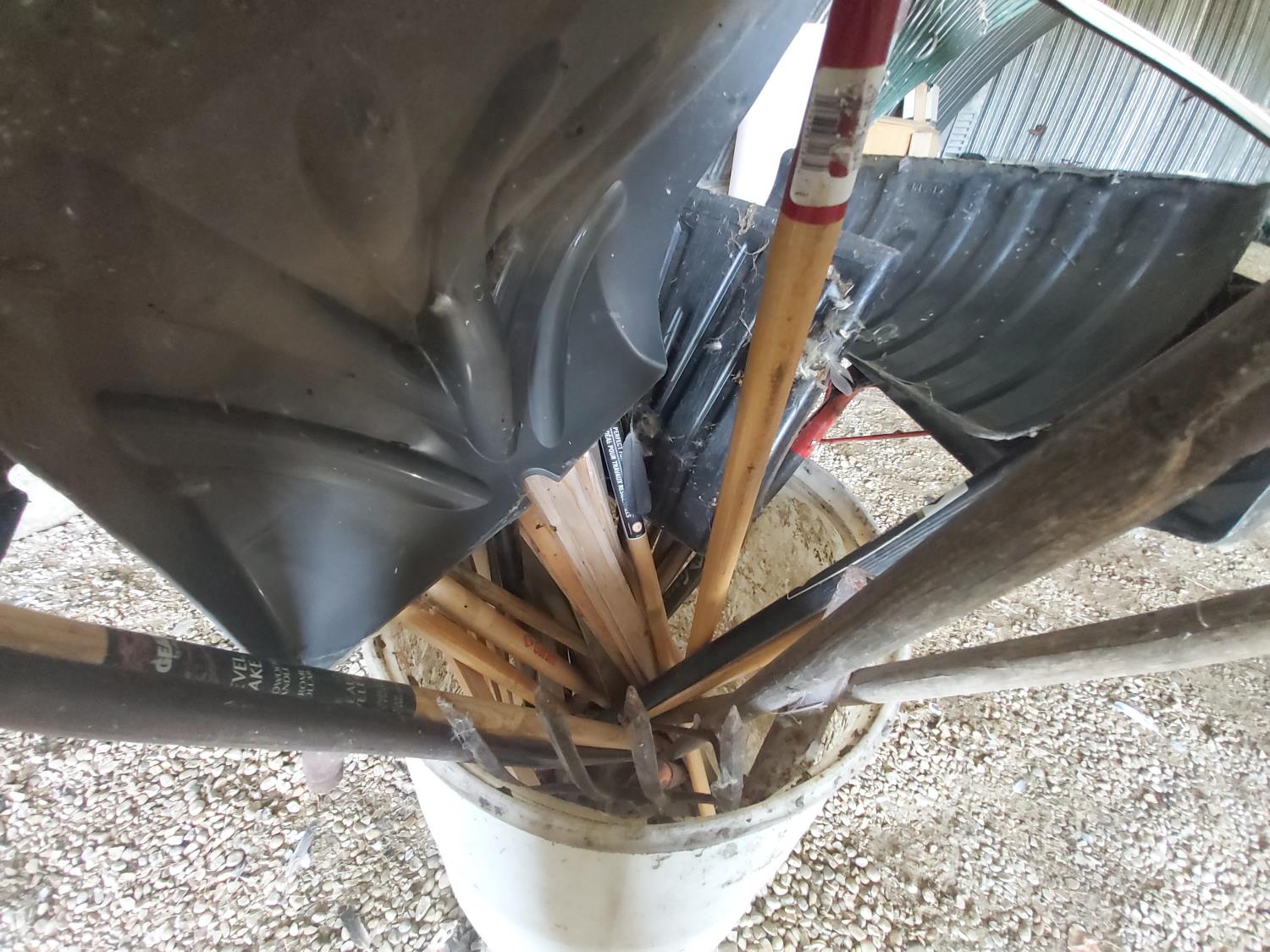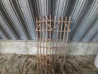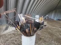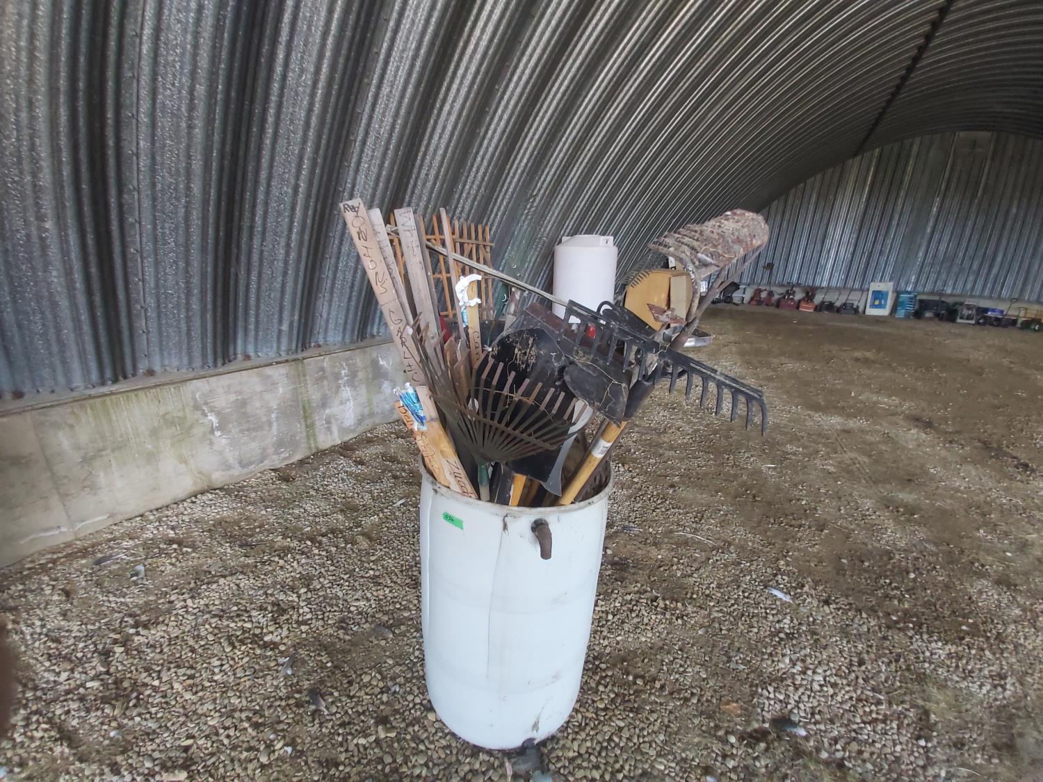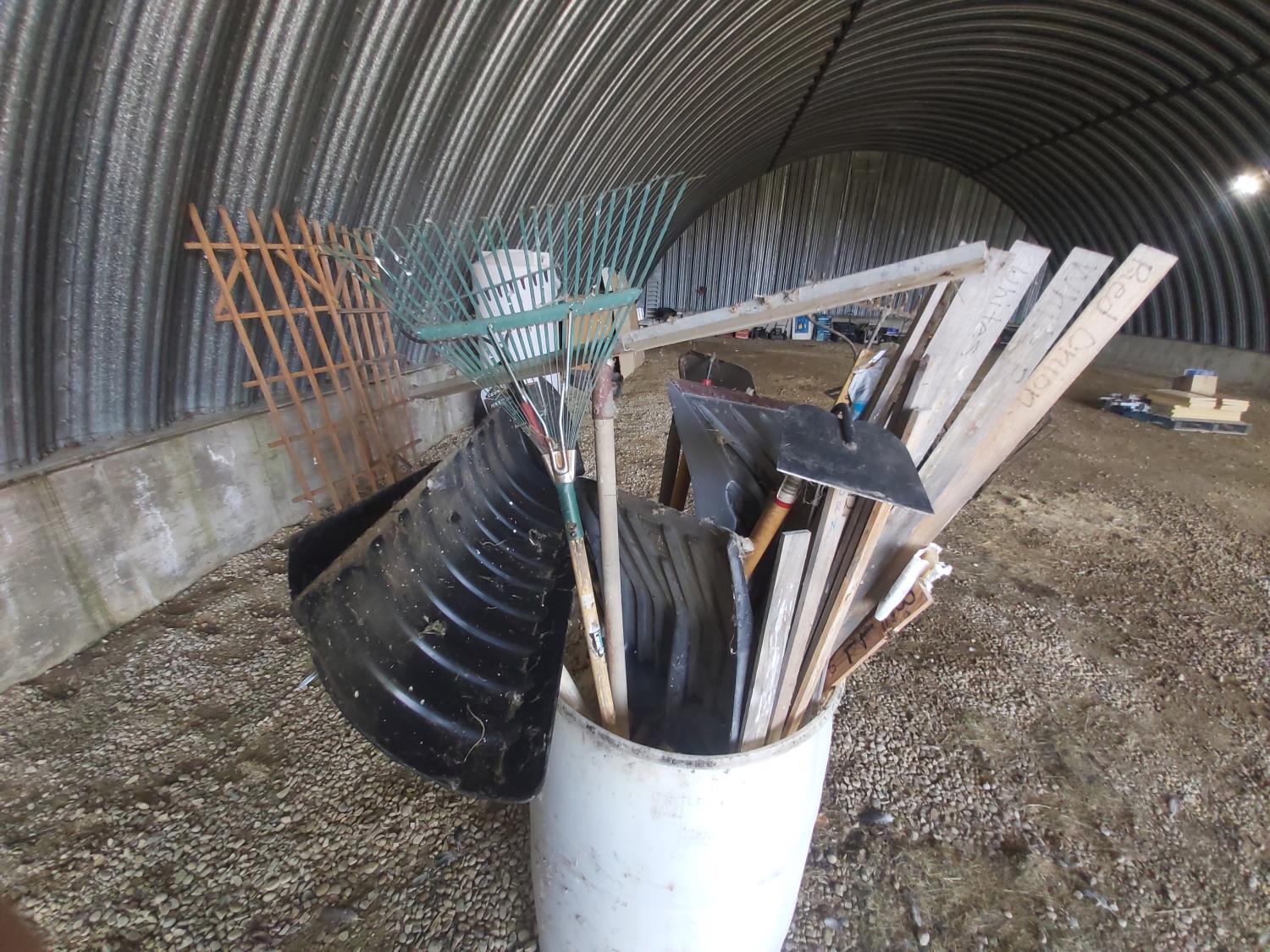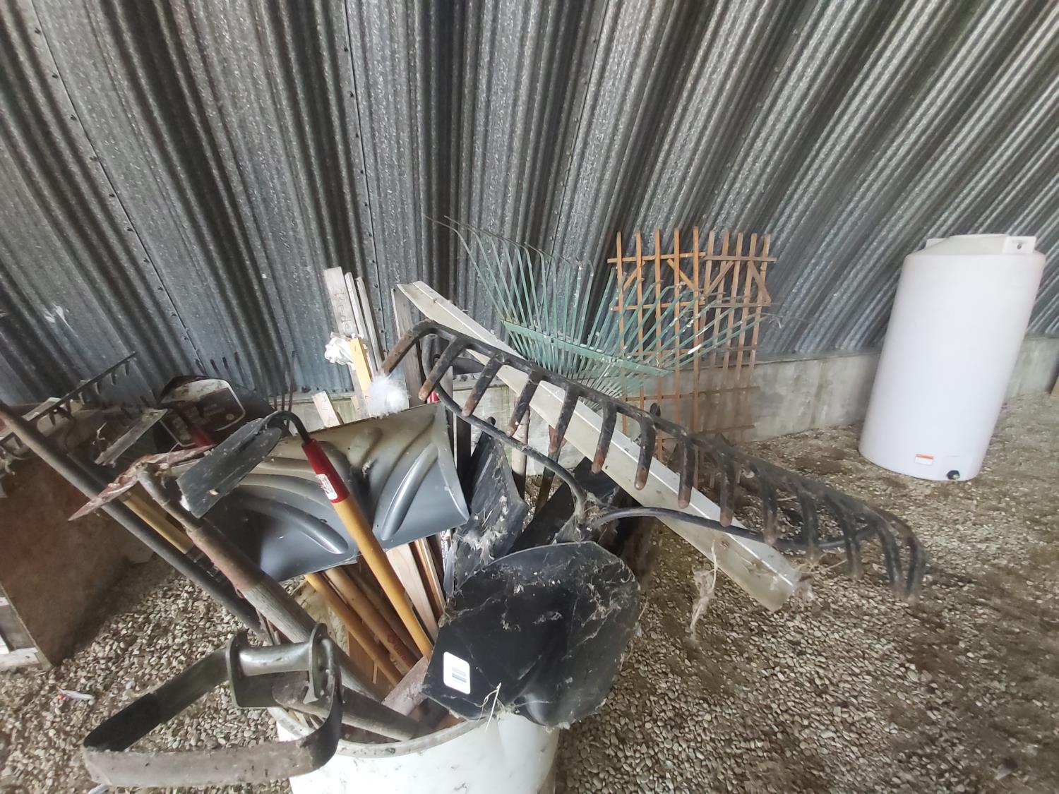 quantity of tools, rain barrel, (2) wooden trellis 72 x 24 inches