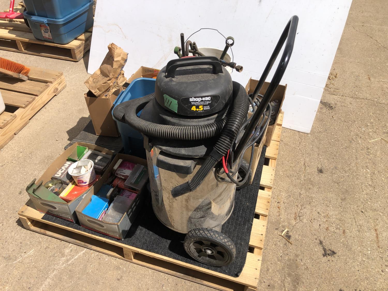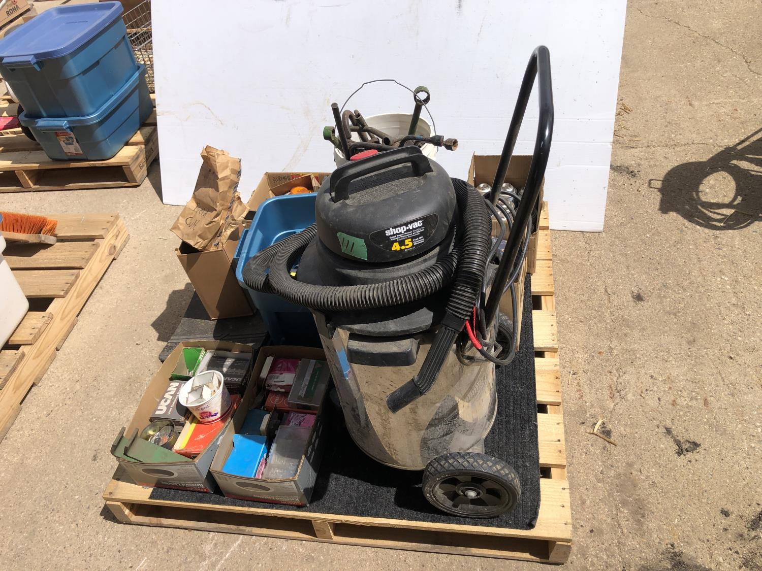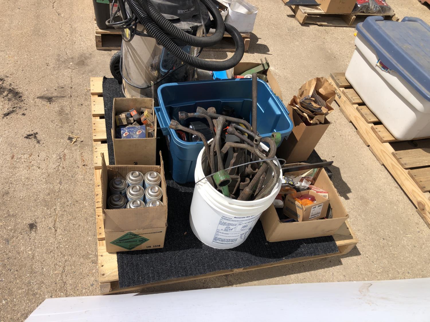 4.5 HP shop vac, (11) cans of freon, assorted bearings, assorted tire irons, various marker lights, various fasteners, o-ring kits, (4) Black & Decker flashlights (unused), (2) power bars (unused)
