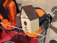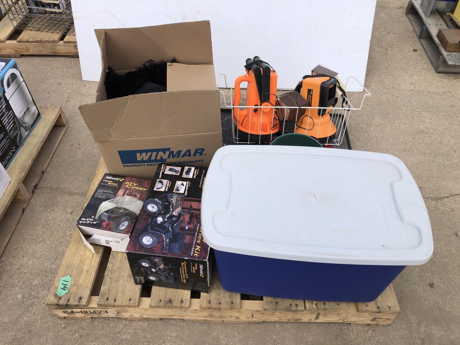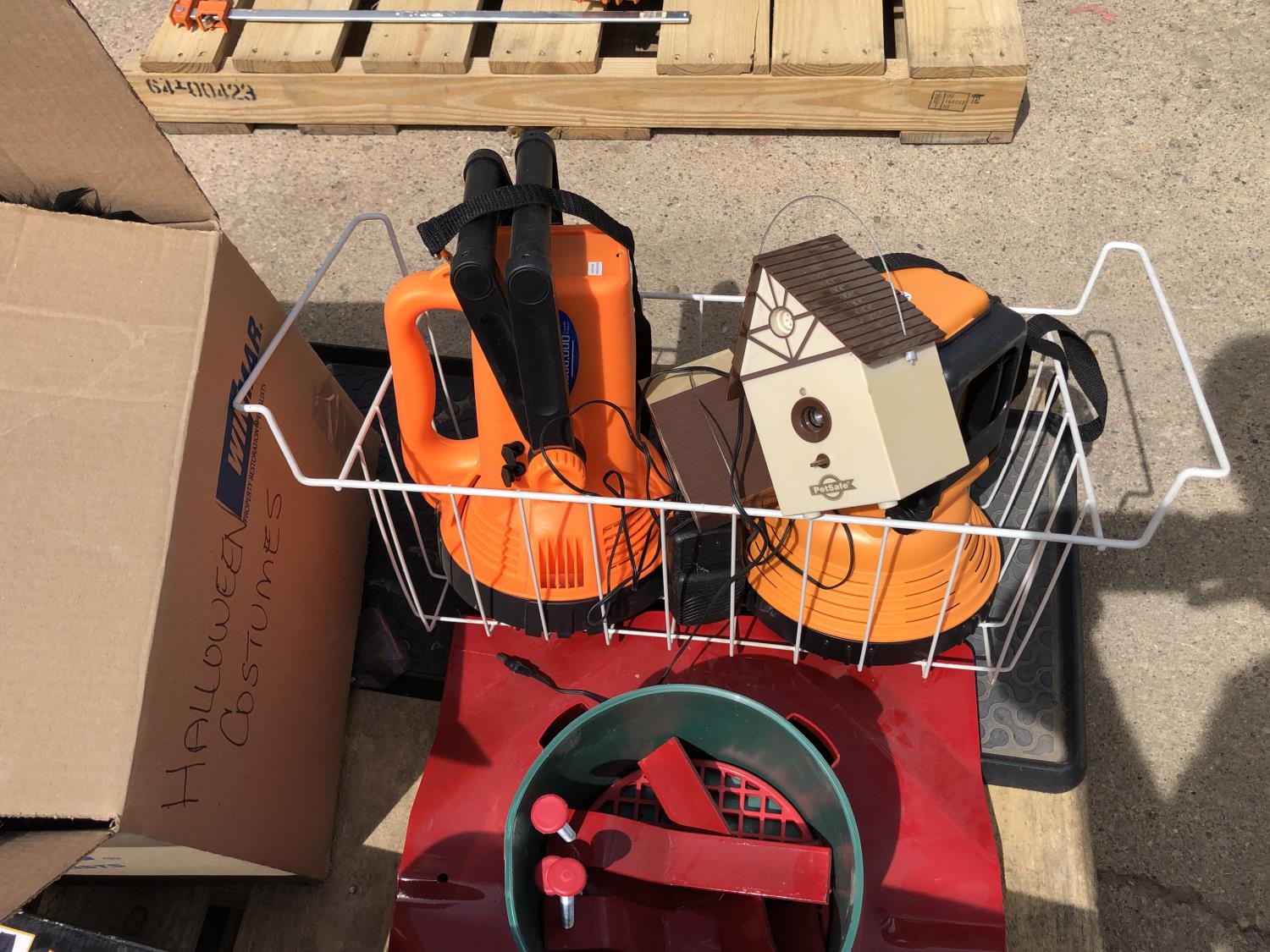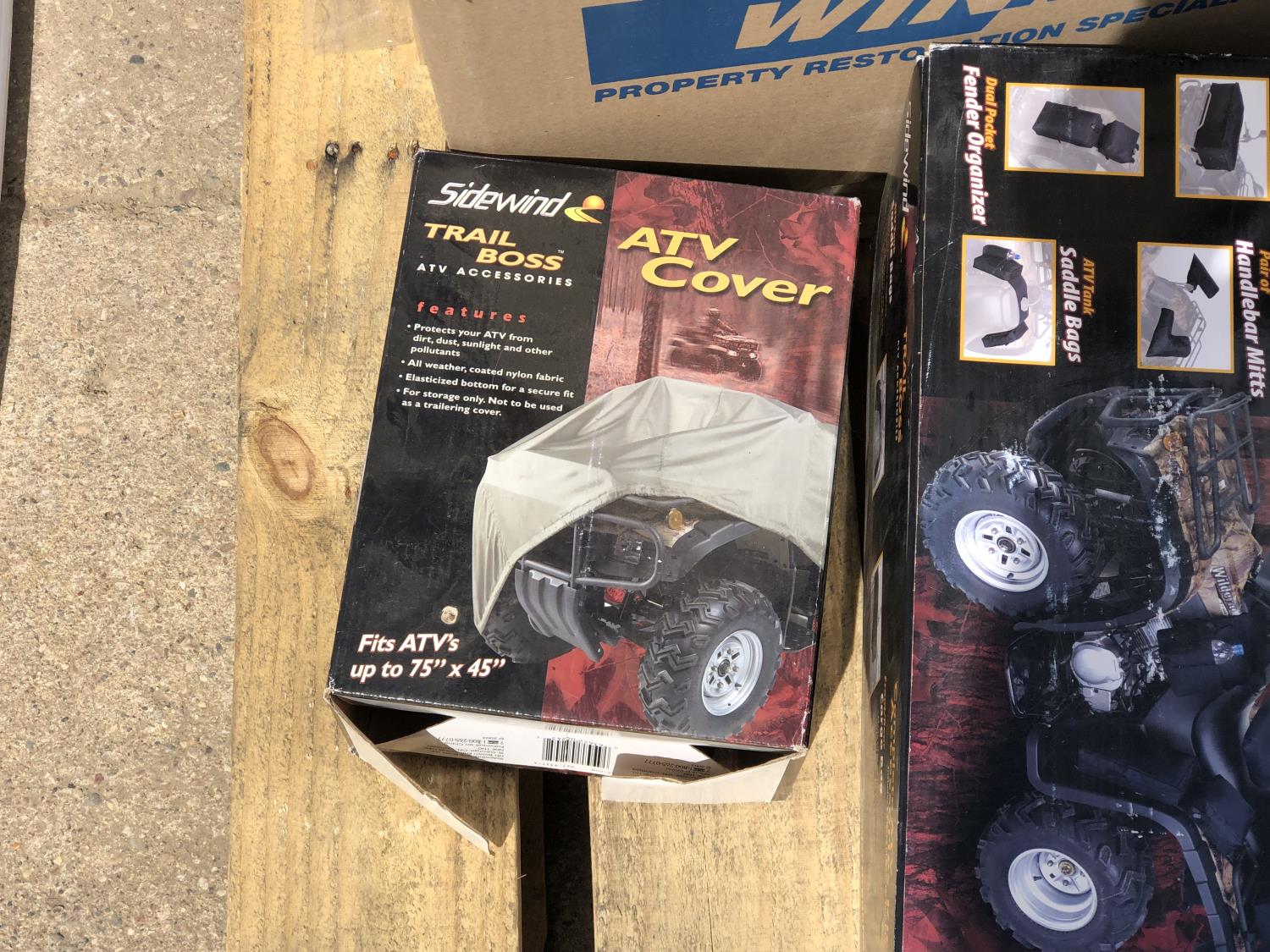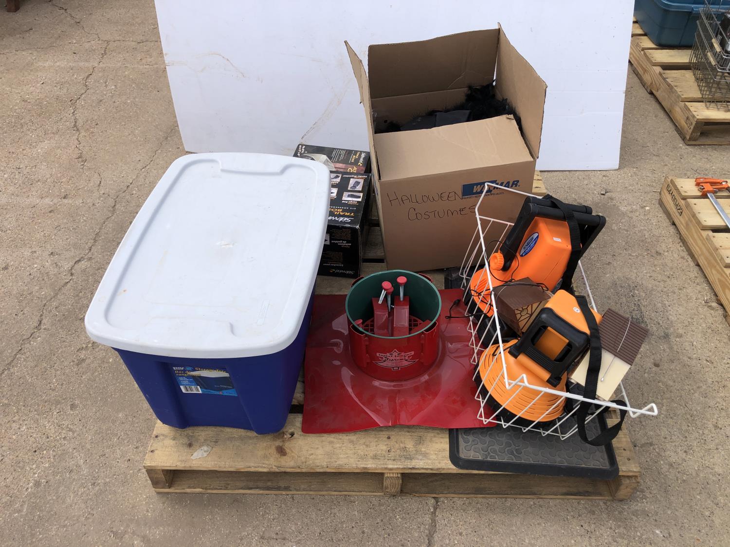 ATV cover and accessory kit (unused), X-mas lights, tree stand, 1,000,000 candle power flash light, Halloween costumes, motion sensor alarm