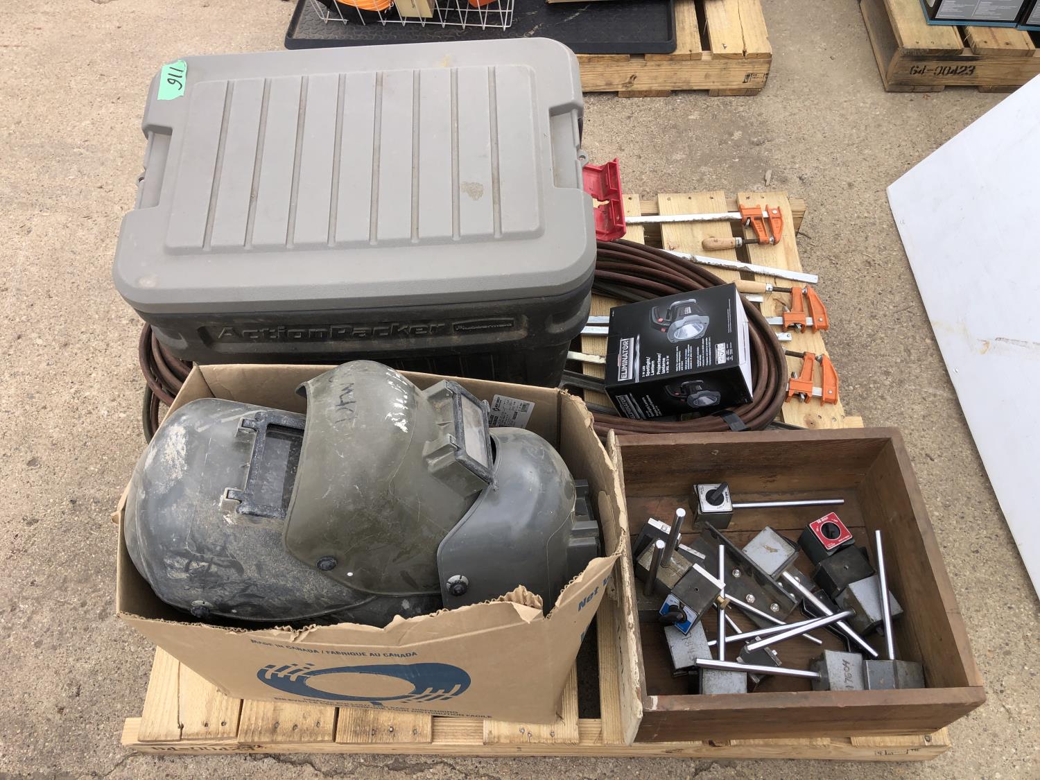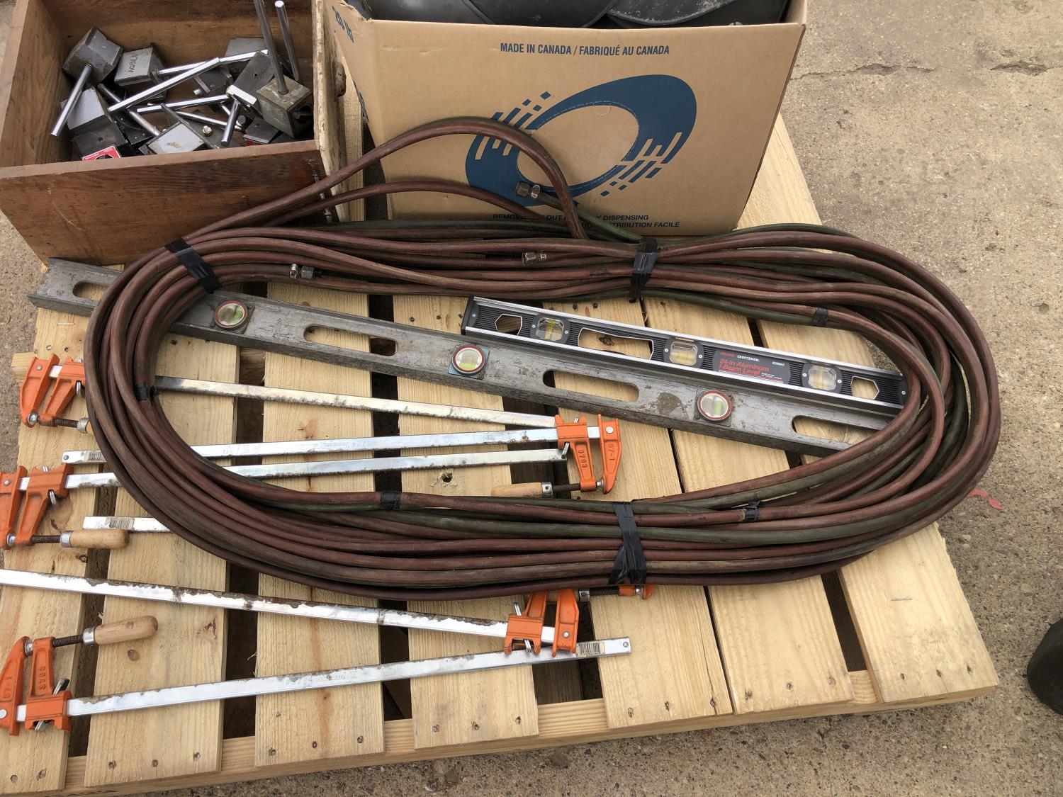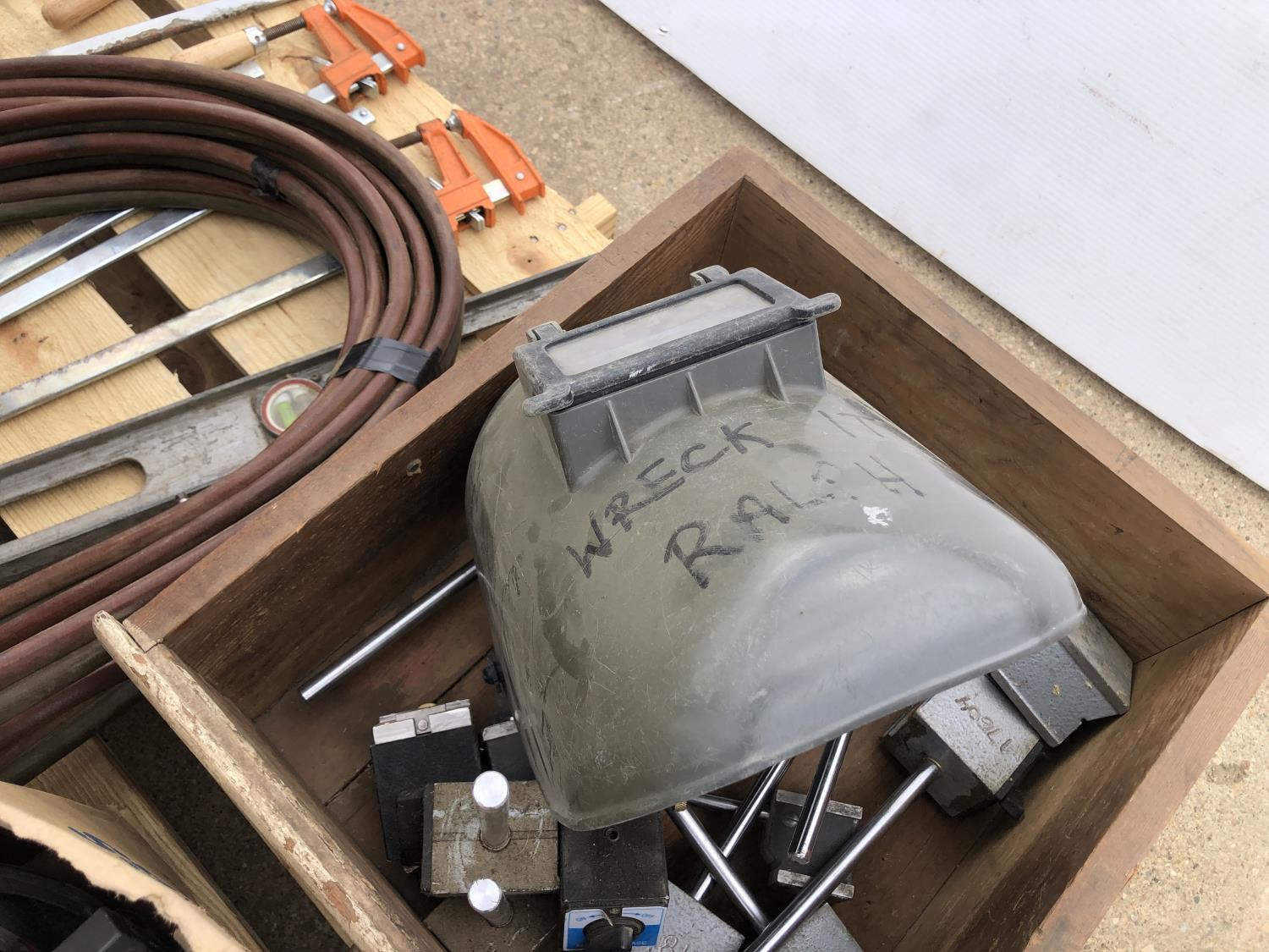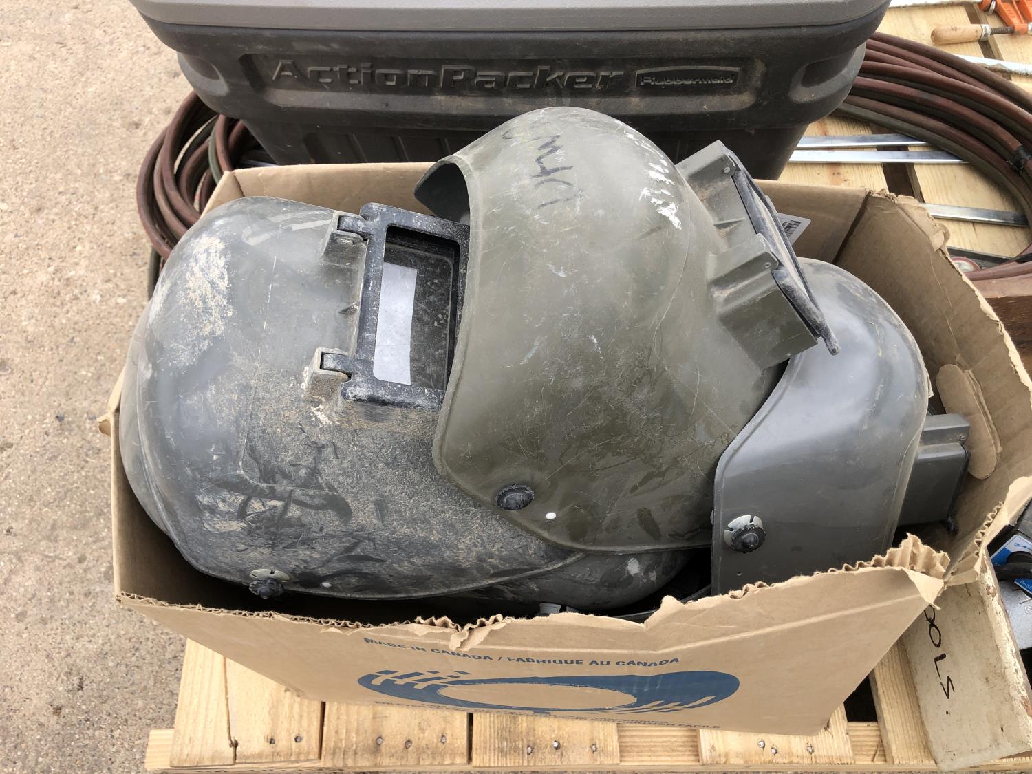 welding helmets, magnetic dial gauge, acetylene/oxygen hose, clamps, flashlight (unused) welder, 3W LED spotlight, 4 ft level, 2 ft level