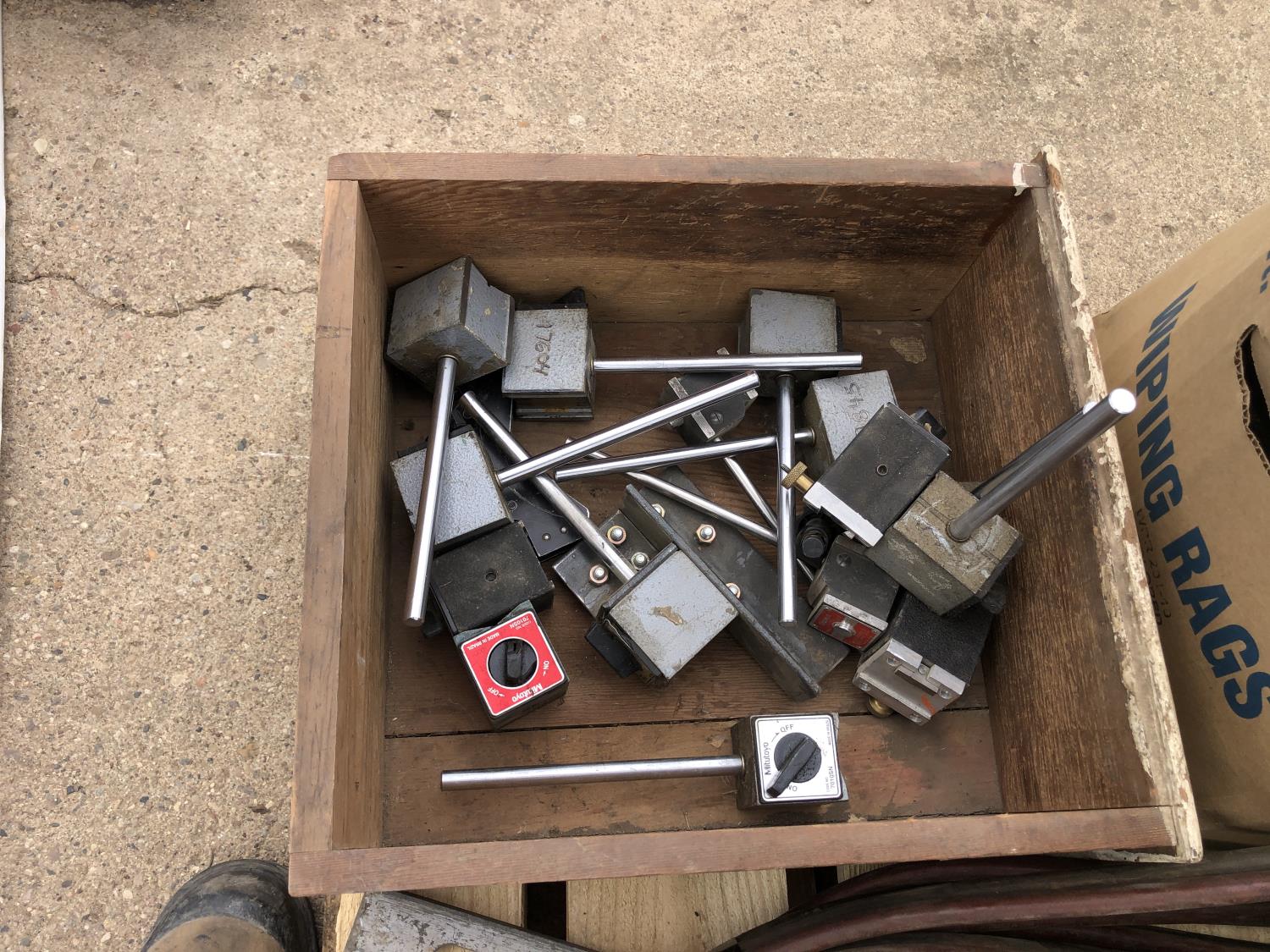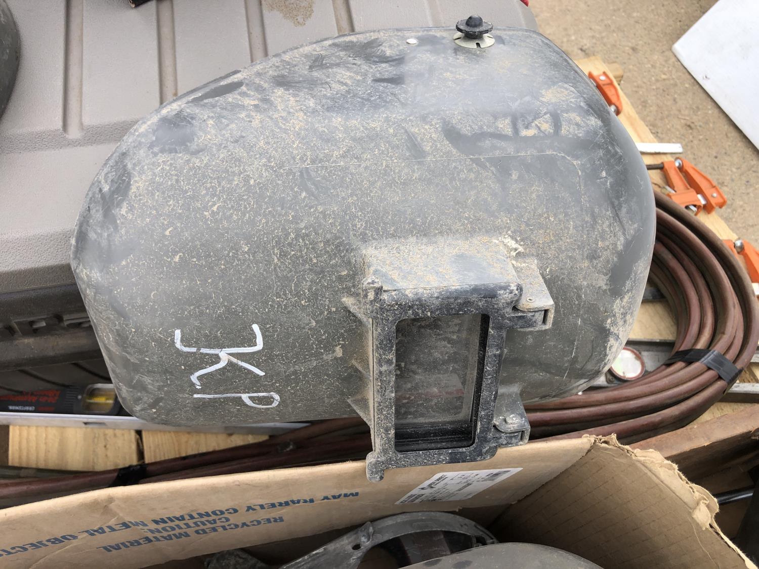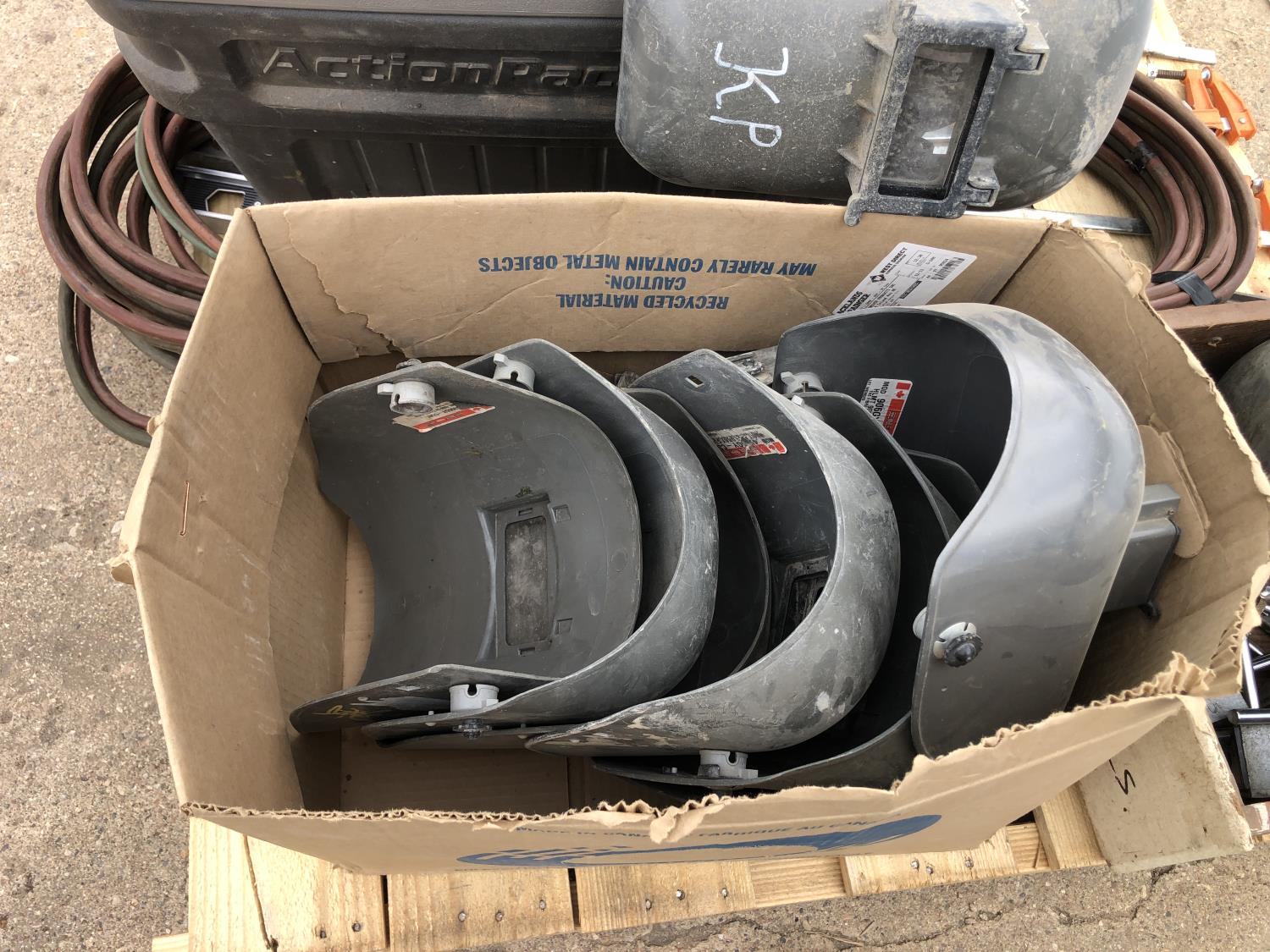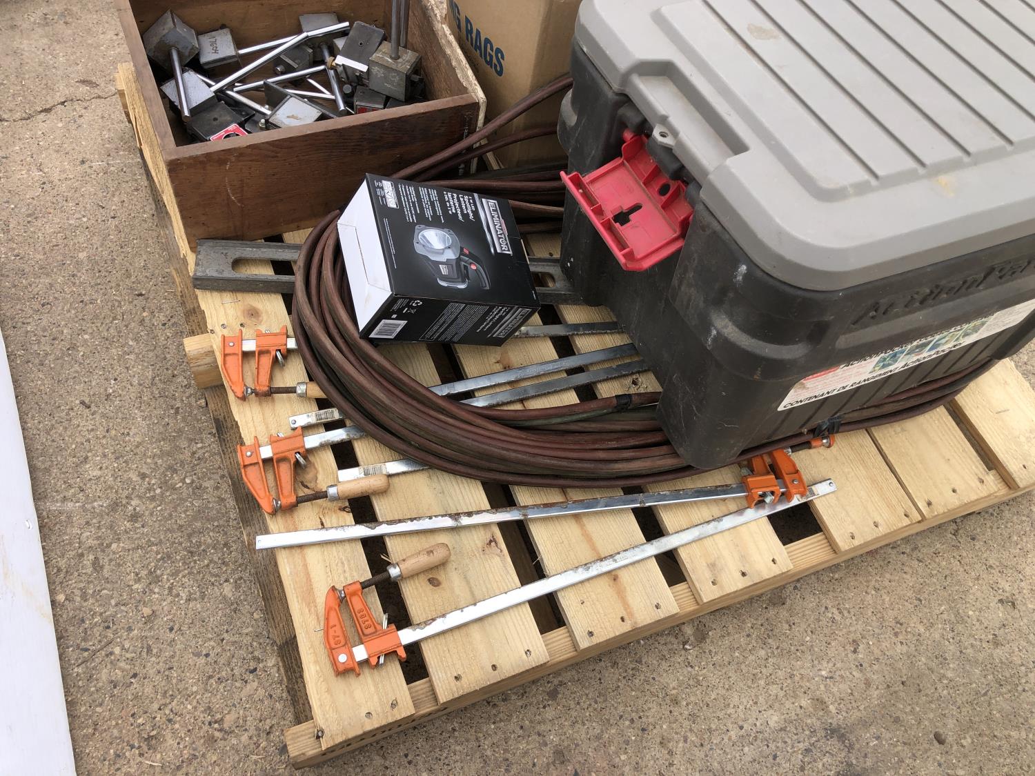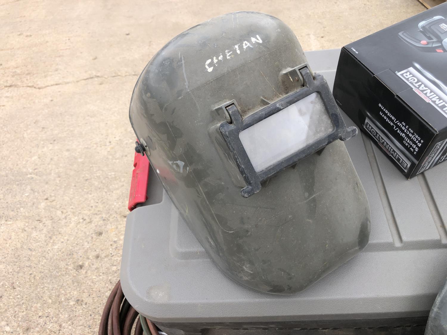 welding helmets, magnetic dial gauge, acetylene/oxygen hose, clamps, flashlight (unused) welder, 3W LED spotlight, 4 ft level, 2 ft level