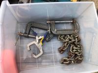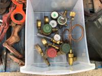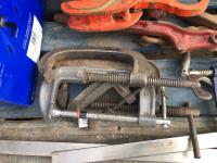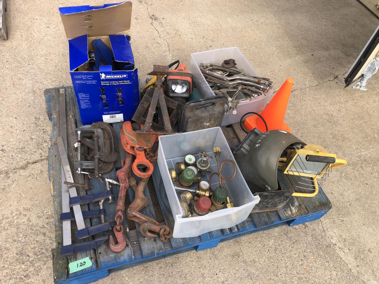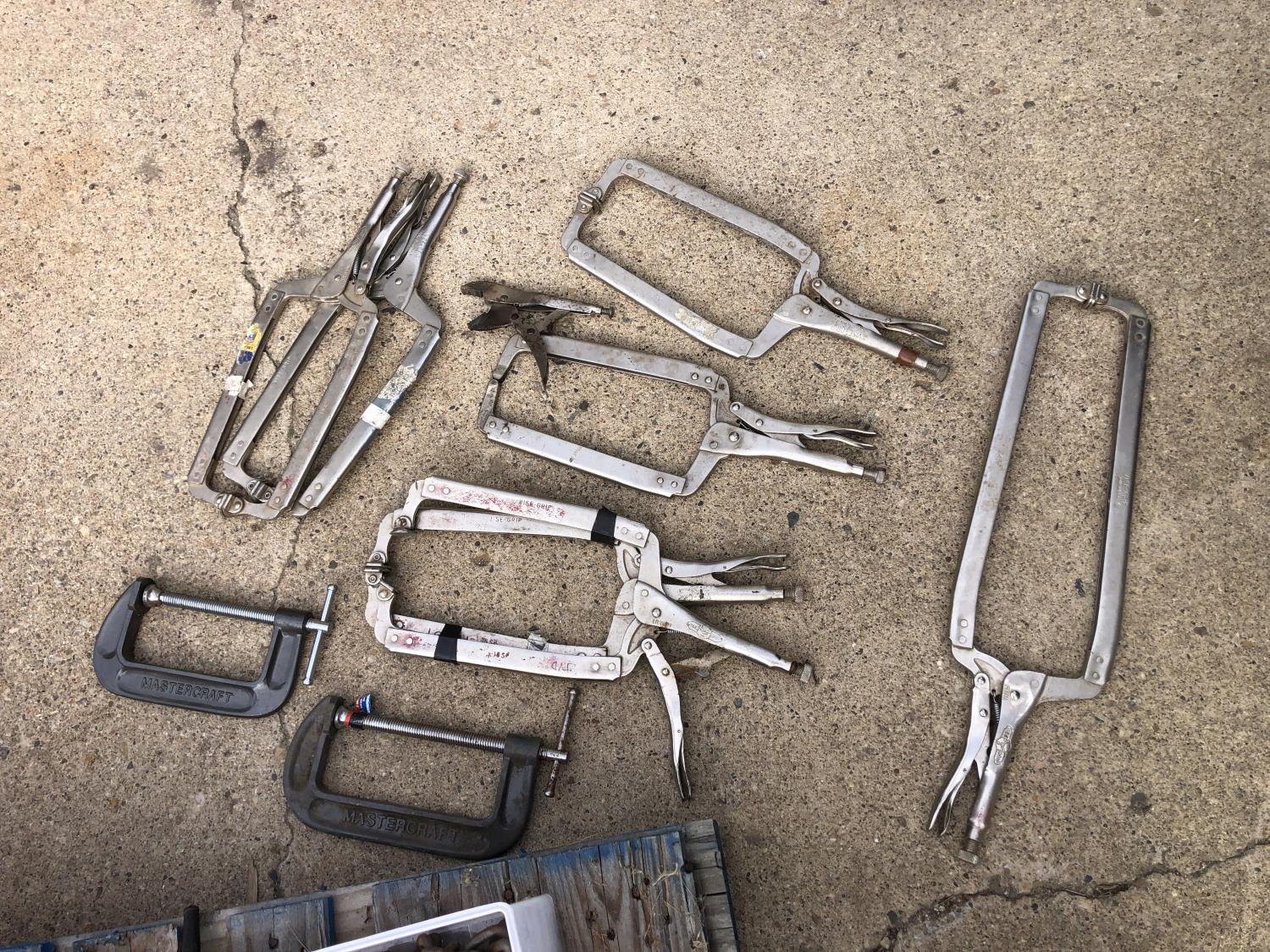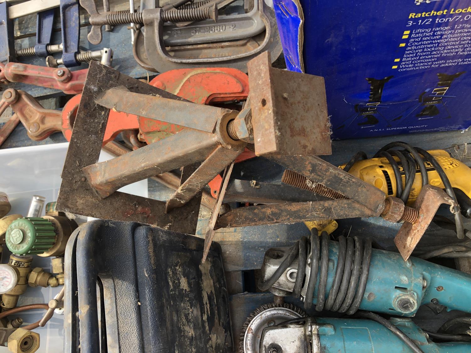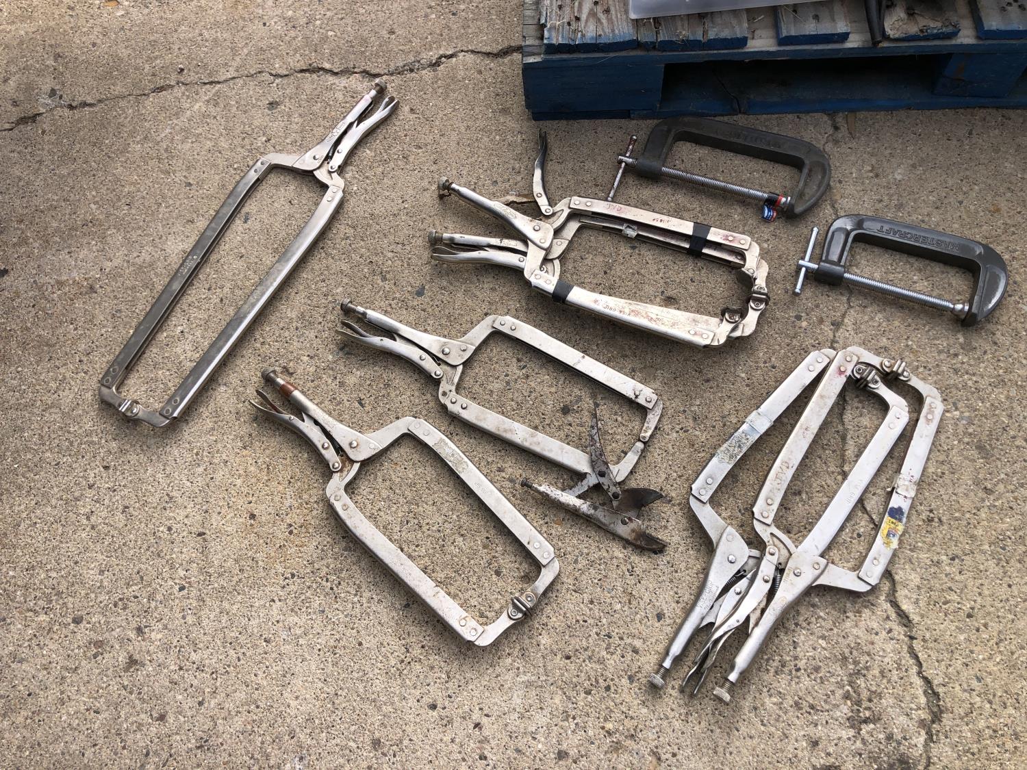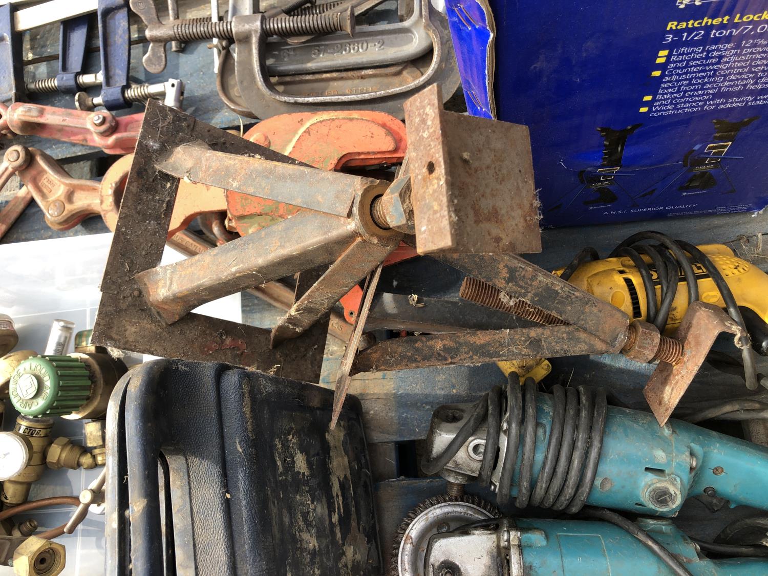 regulators, welding mask (no head band), flood light, (8) C-clamps, (2) 31/2 ton jack stands unused, (2) angle grinders, (2) large clamps, drill, plate clamp, assortment of vice grip clamps, 6 ton bottle jack, plate clamp