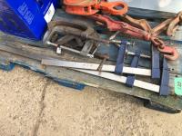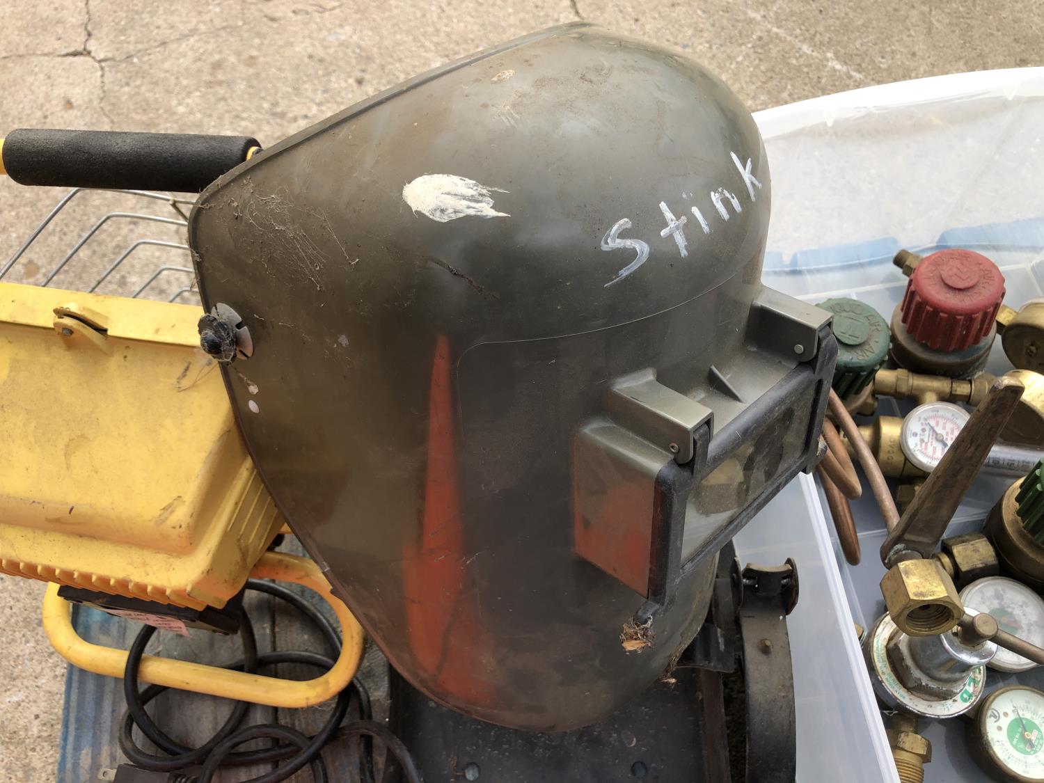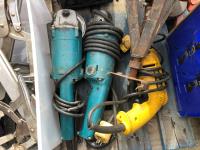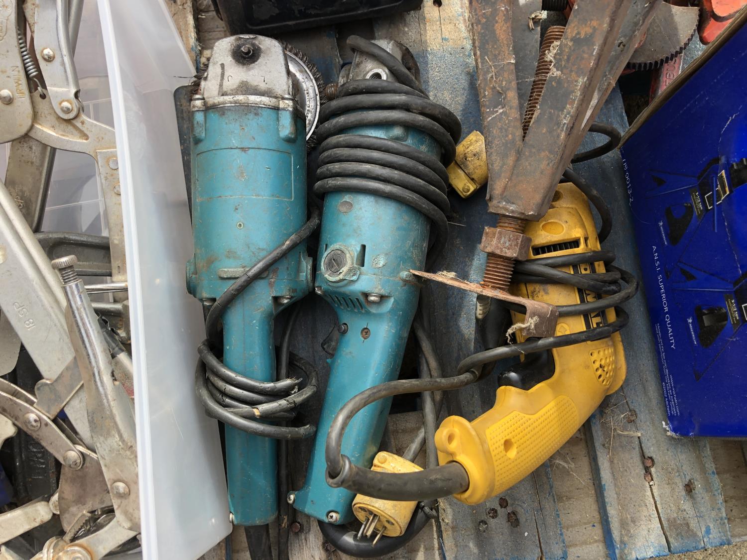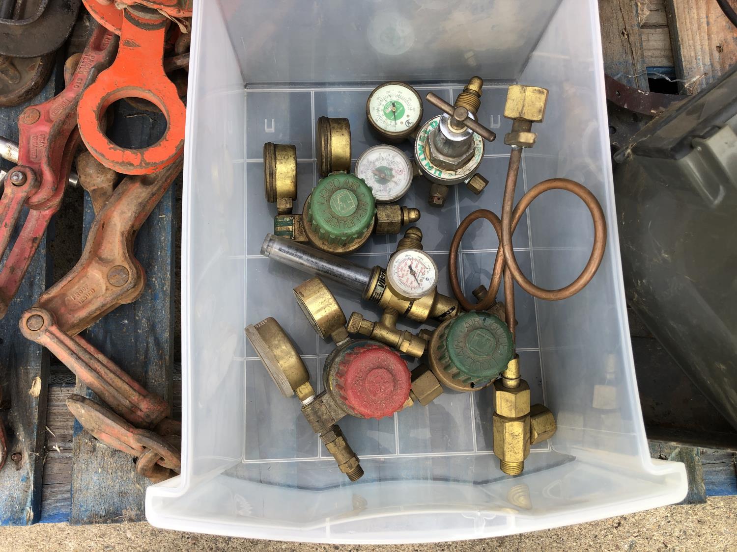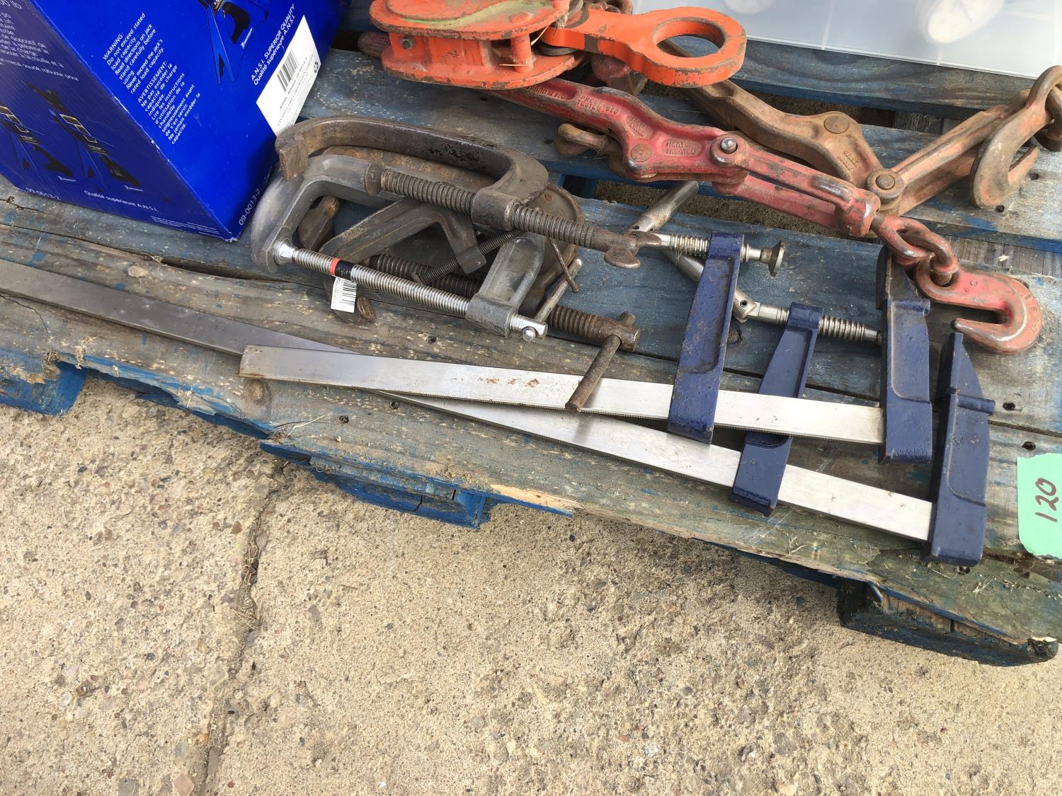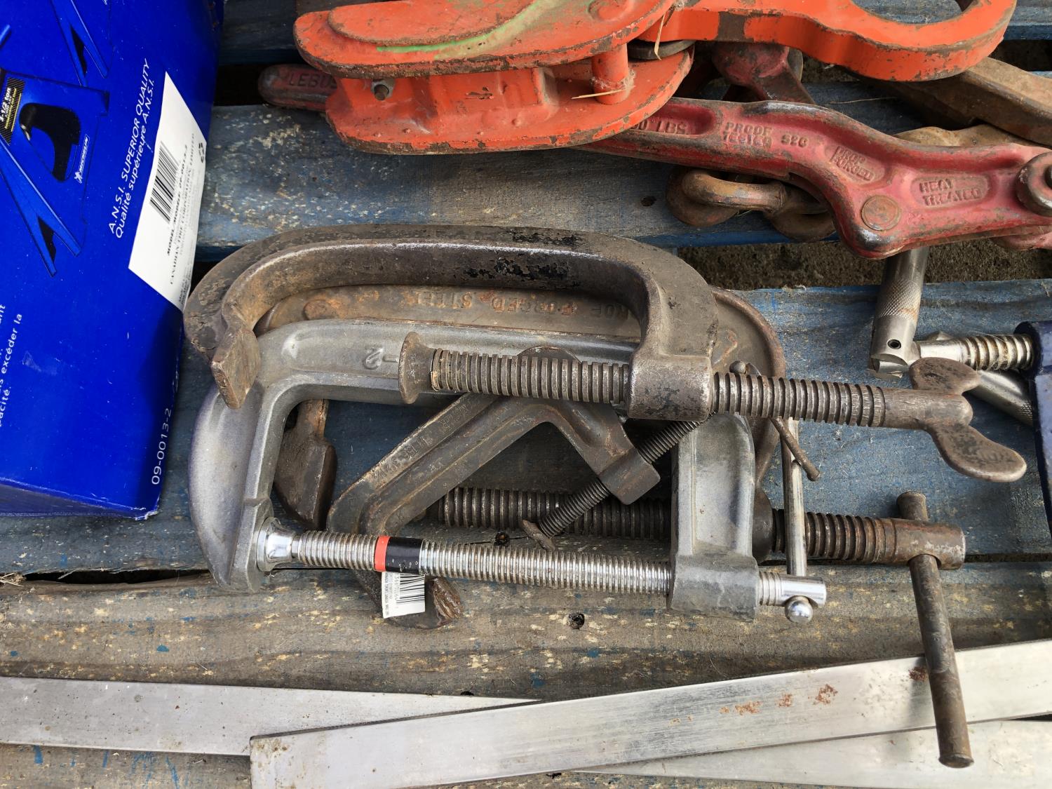 regulators, welding mask (no head band), flood light, (8) C-clamps, (2) 31/2 ton jack stands unused, (2) angle grinders, (2) large clamps, drill, plate clamp, assortment of vice grip clamps, 6 ton bottle jack, plate clamp