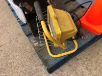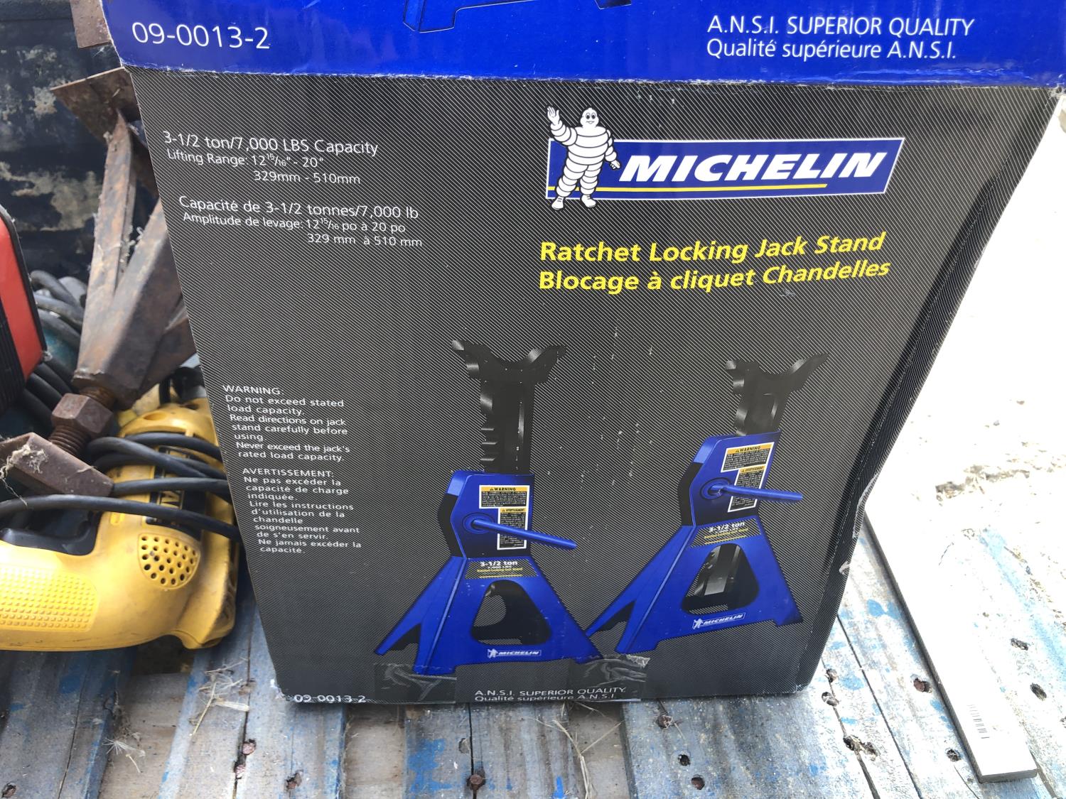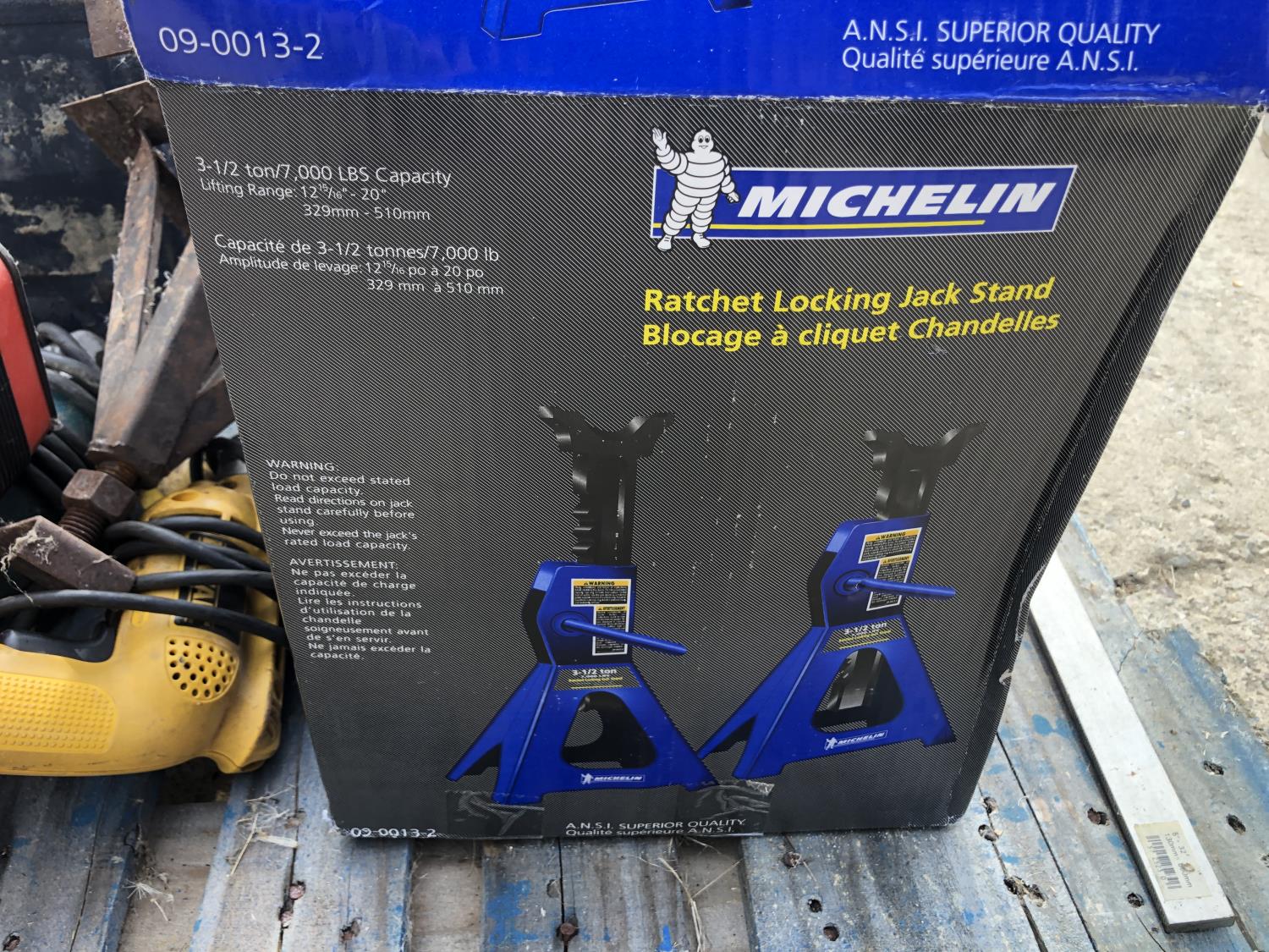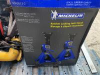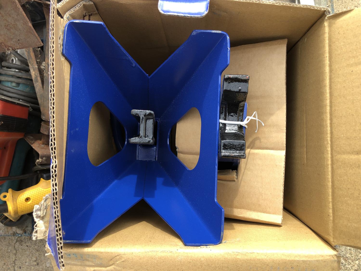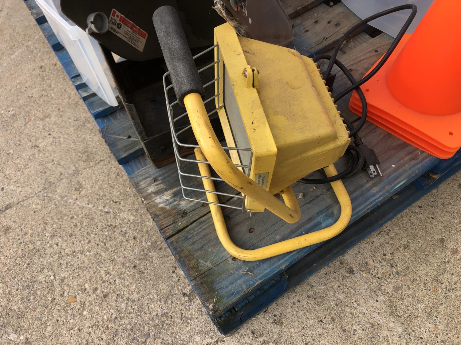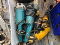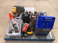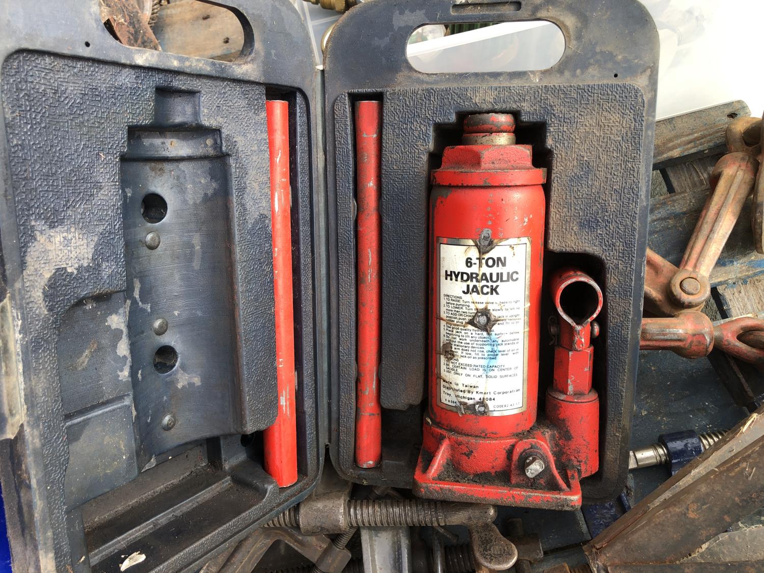 regulators, welding mask (no head band), flood light, (8) C-clamps, (2) 31/2 ton jack stands unused, (2) angle grinders, (2) large clamps, drill, plate clamp, assortment of vice grip clamps, 6 ton bottle jack, plate clamp