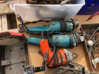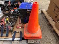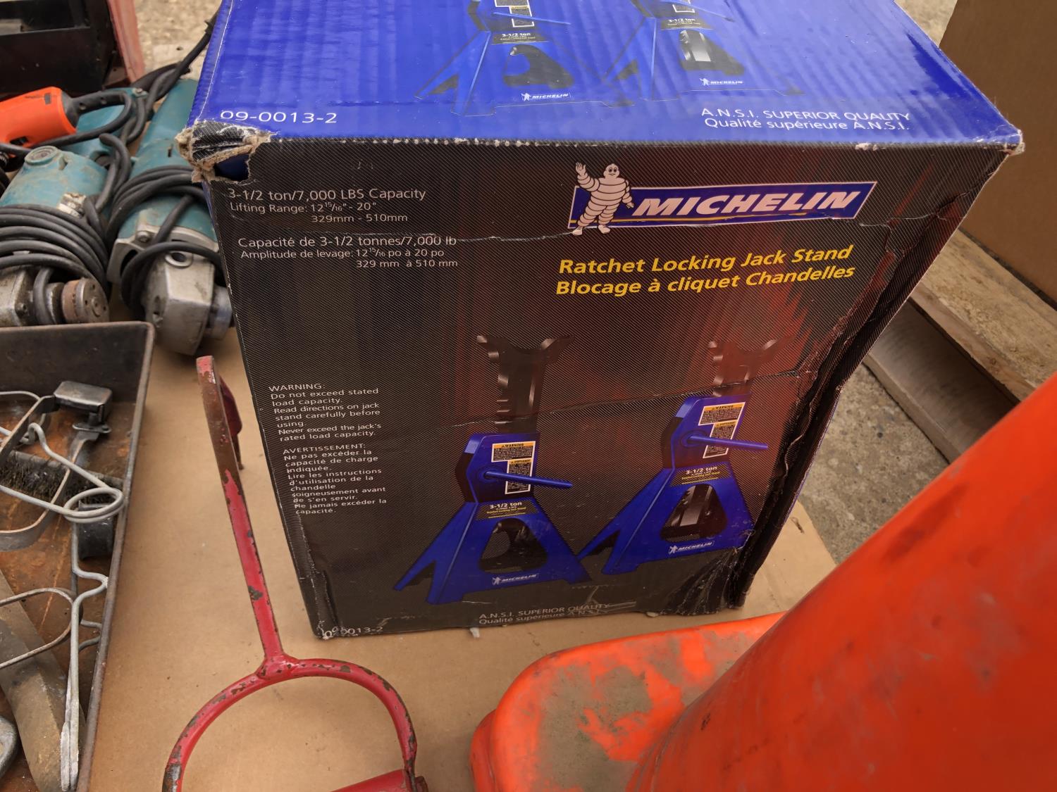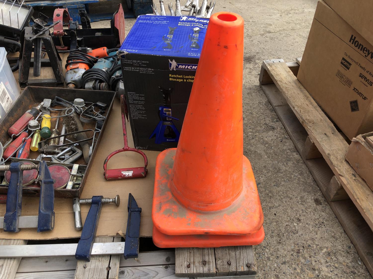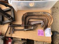 regulators, welding mask, flood light, (9) C-clamps, (2) 3-1/2 ton jack stands (unused), (2) angle grinders, drill, assortment of vise grip clamps, pillion, carpenter belt