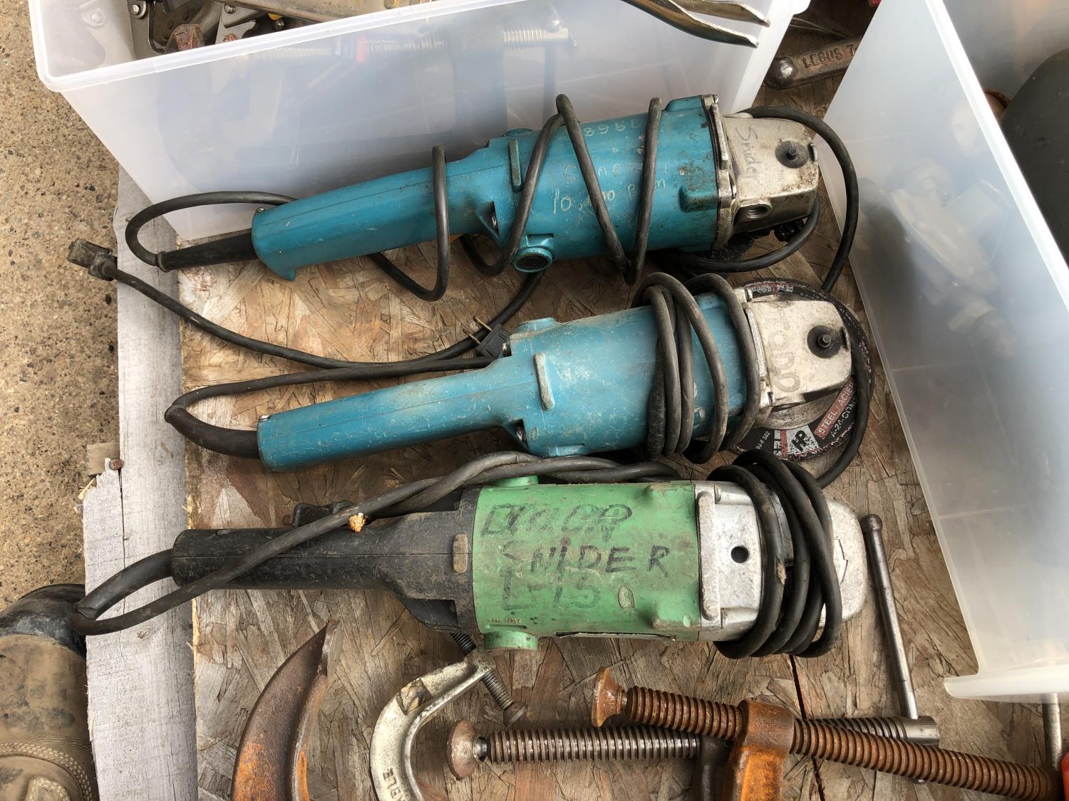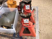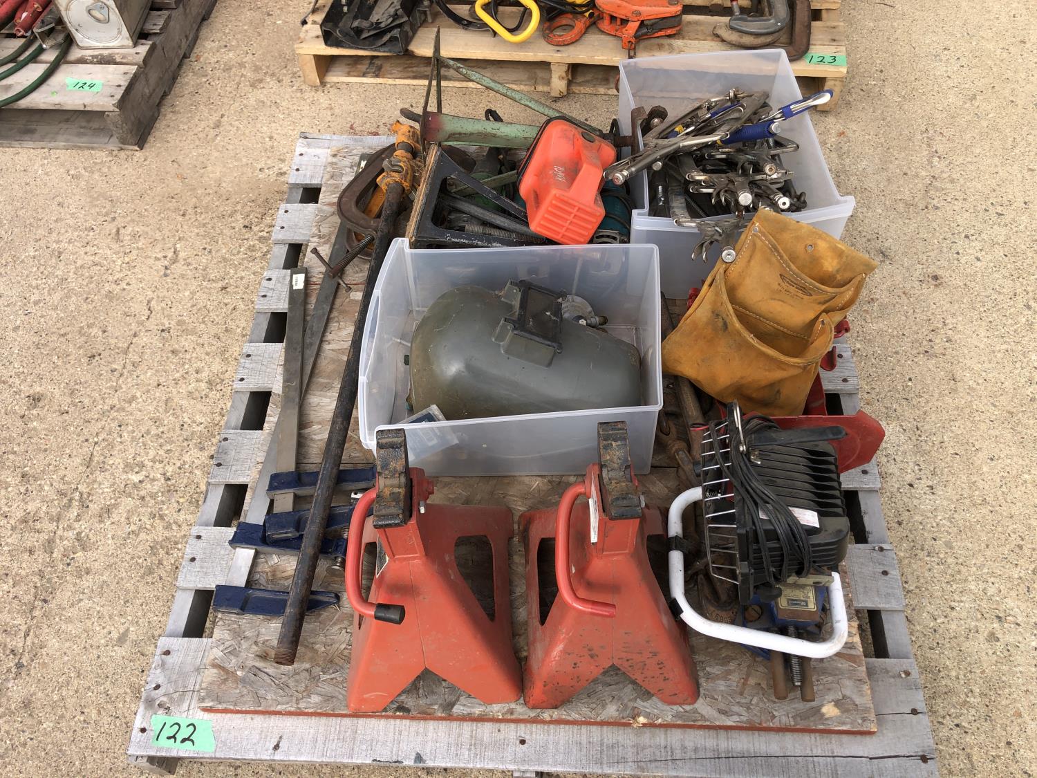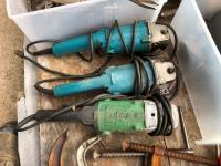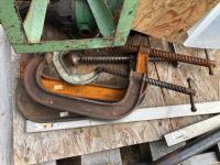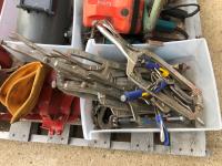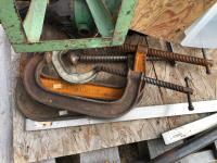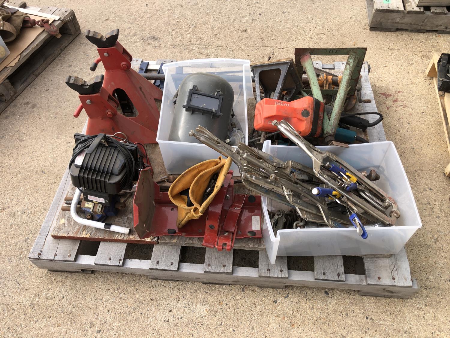 regulators, welding mask (no head band), (2) 6 ton jack stands(3) large clamps, flood light, (3) angle grinders, drill, assortment of vice grip clamps, (7) clamps, 3-1/2 inch vice
