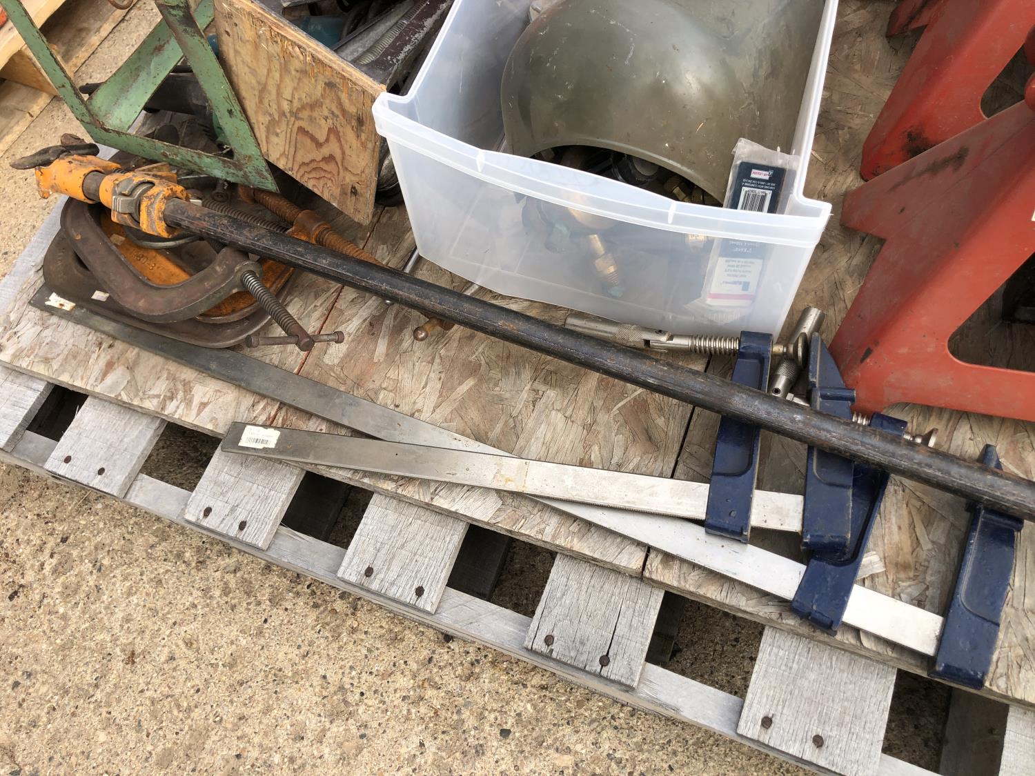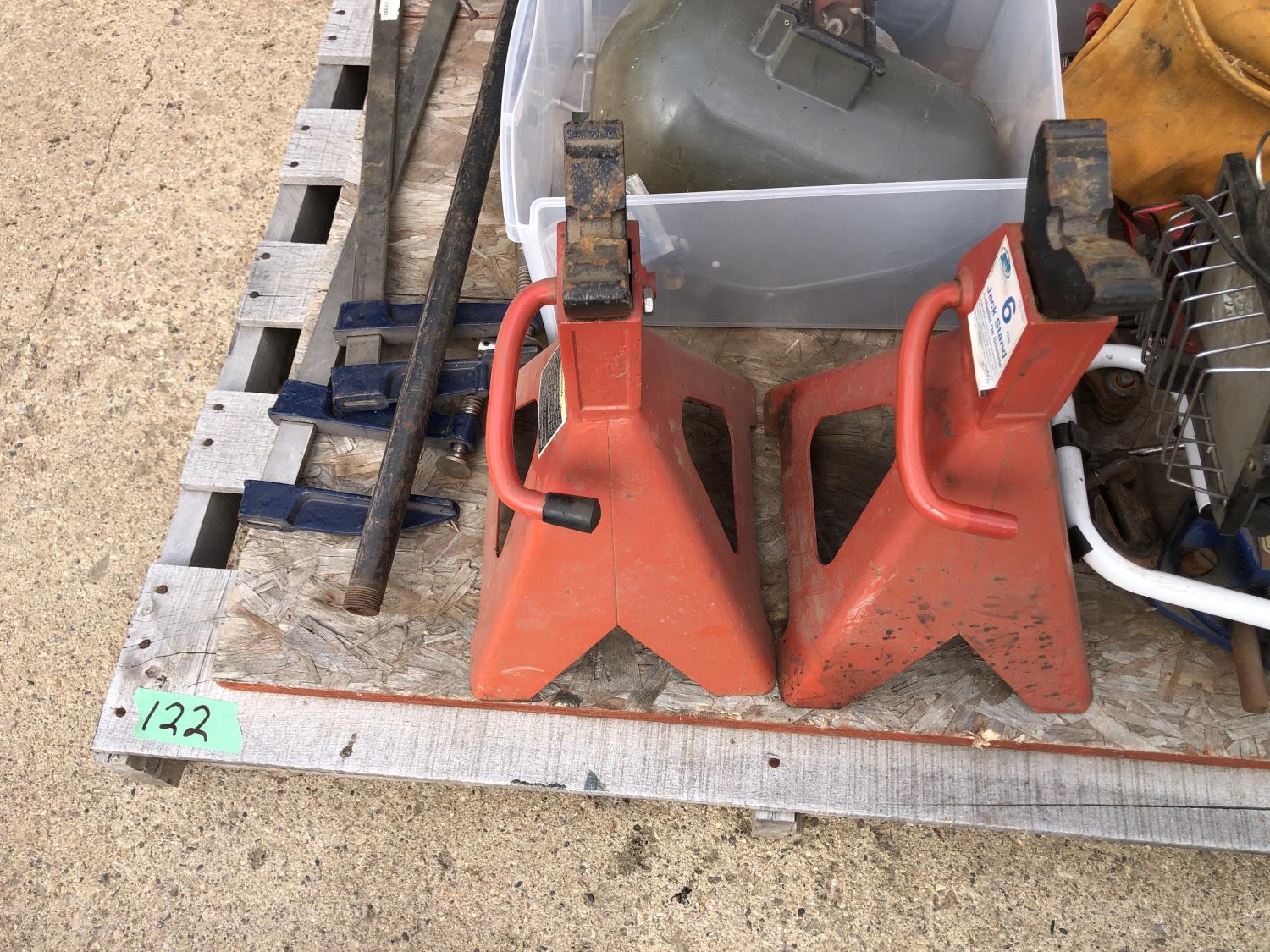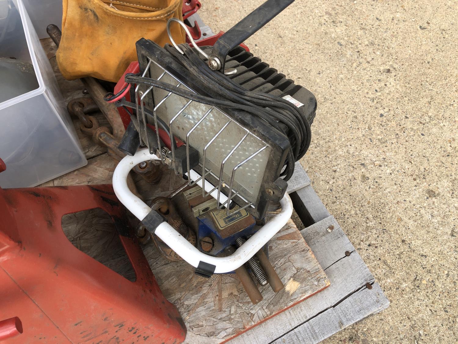 regulators, welding mask (no head band), (2) 6 ton jack stands(3) large clamps, flood light, (3) angle grinders, drill, assortment of vice grip clamps, (7) clamps, 3-1/2 inch vice