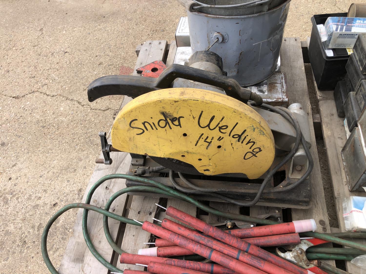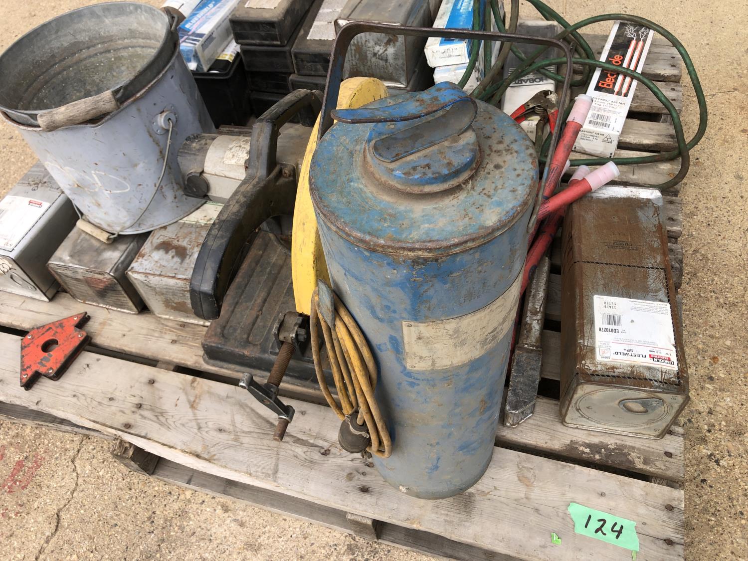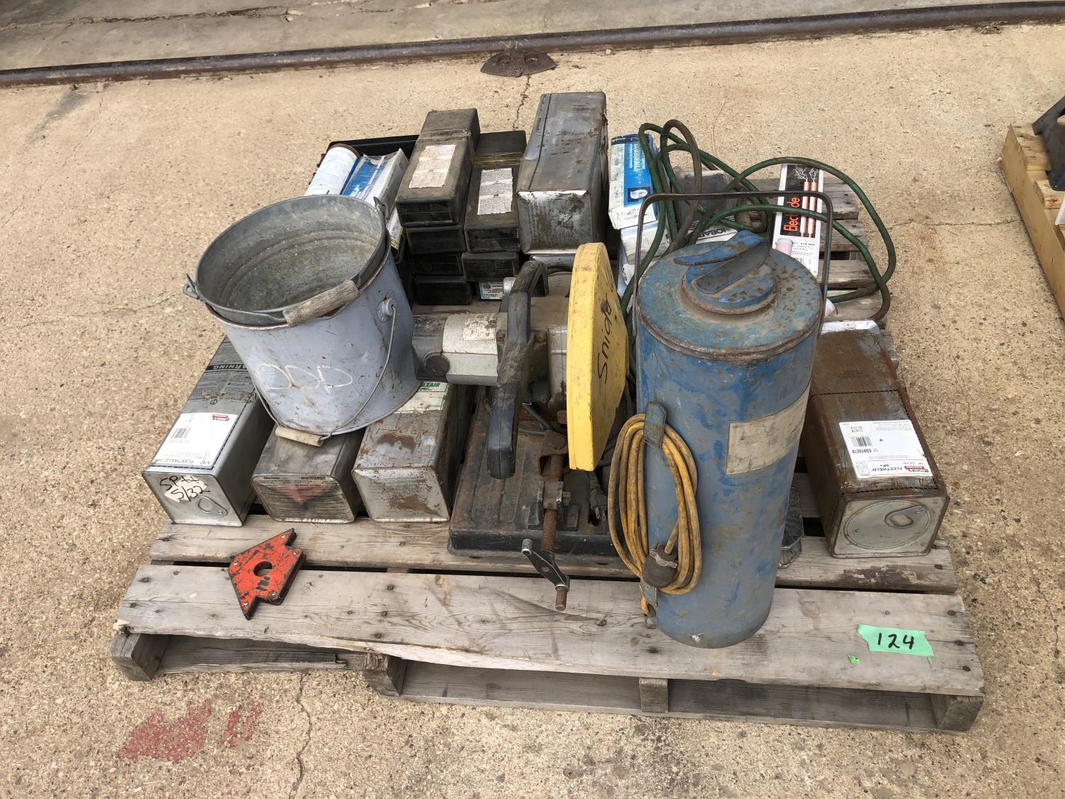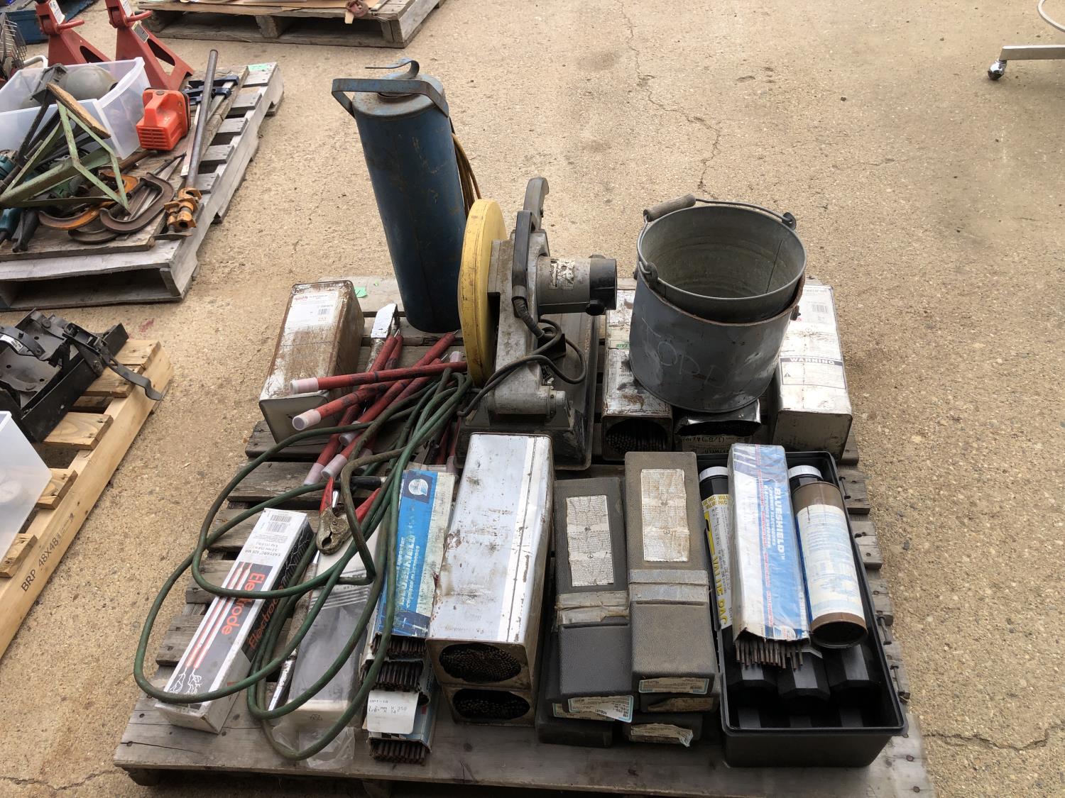 large assortment of welding rods, 14 inch chop saw, chrome snipe, road planes, (2) metal pails, ground cable, rod oven