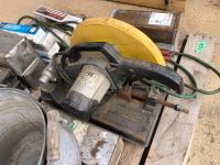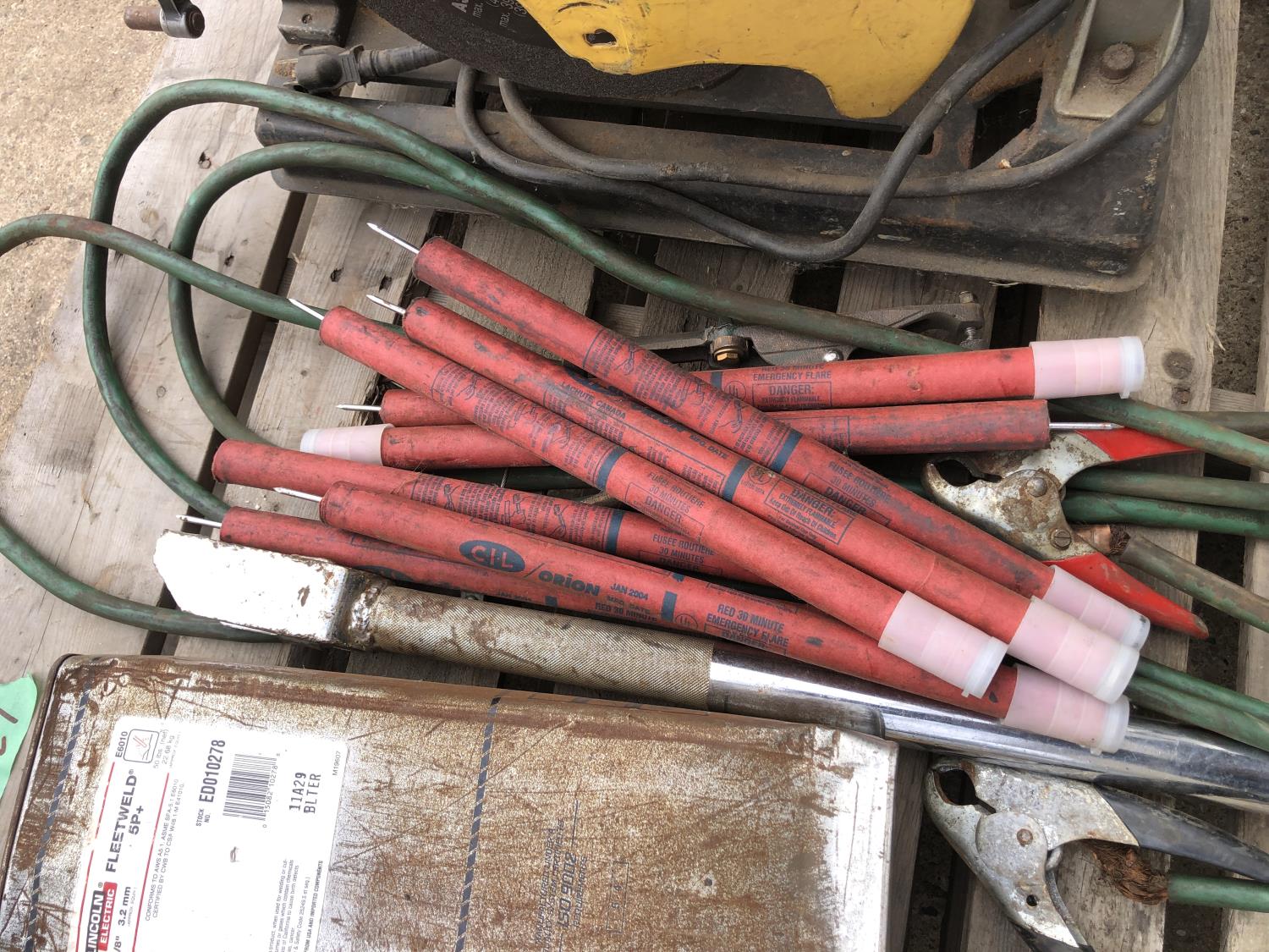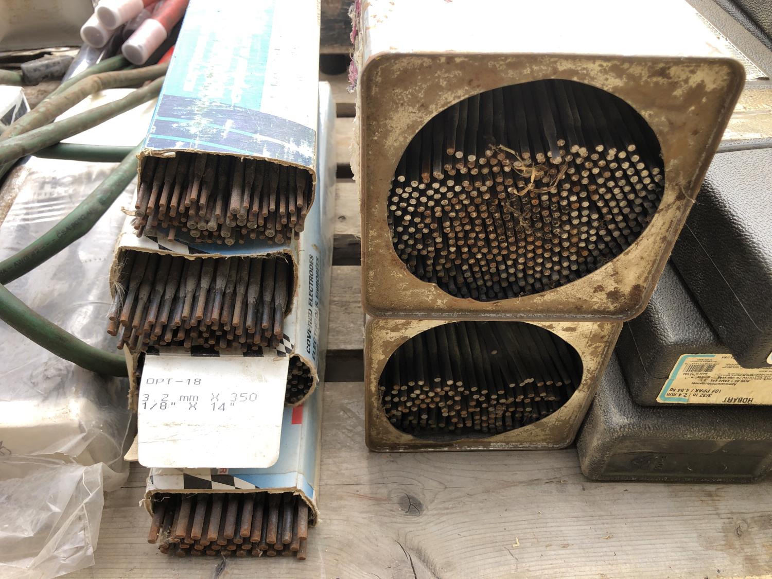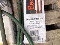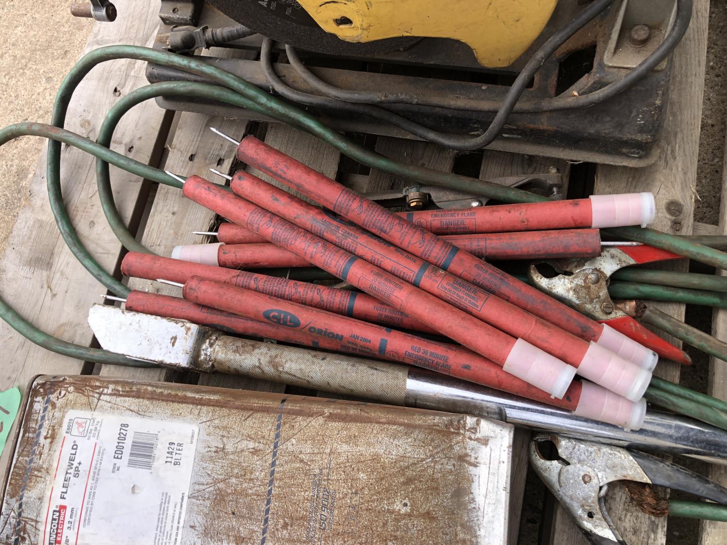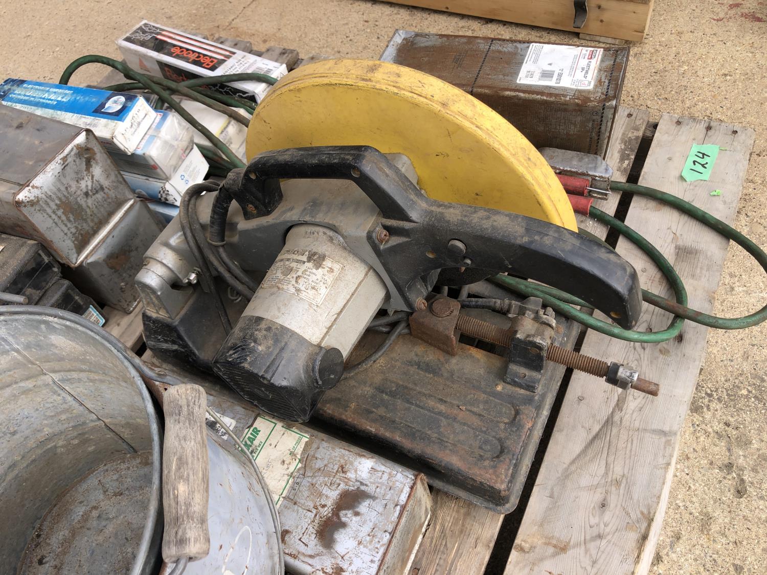 large assortment of welding rods, 14 inch chop saw, chrome snipe, road planes, (2) metal pails, ground cable, rod oven
