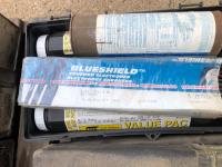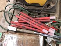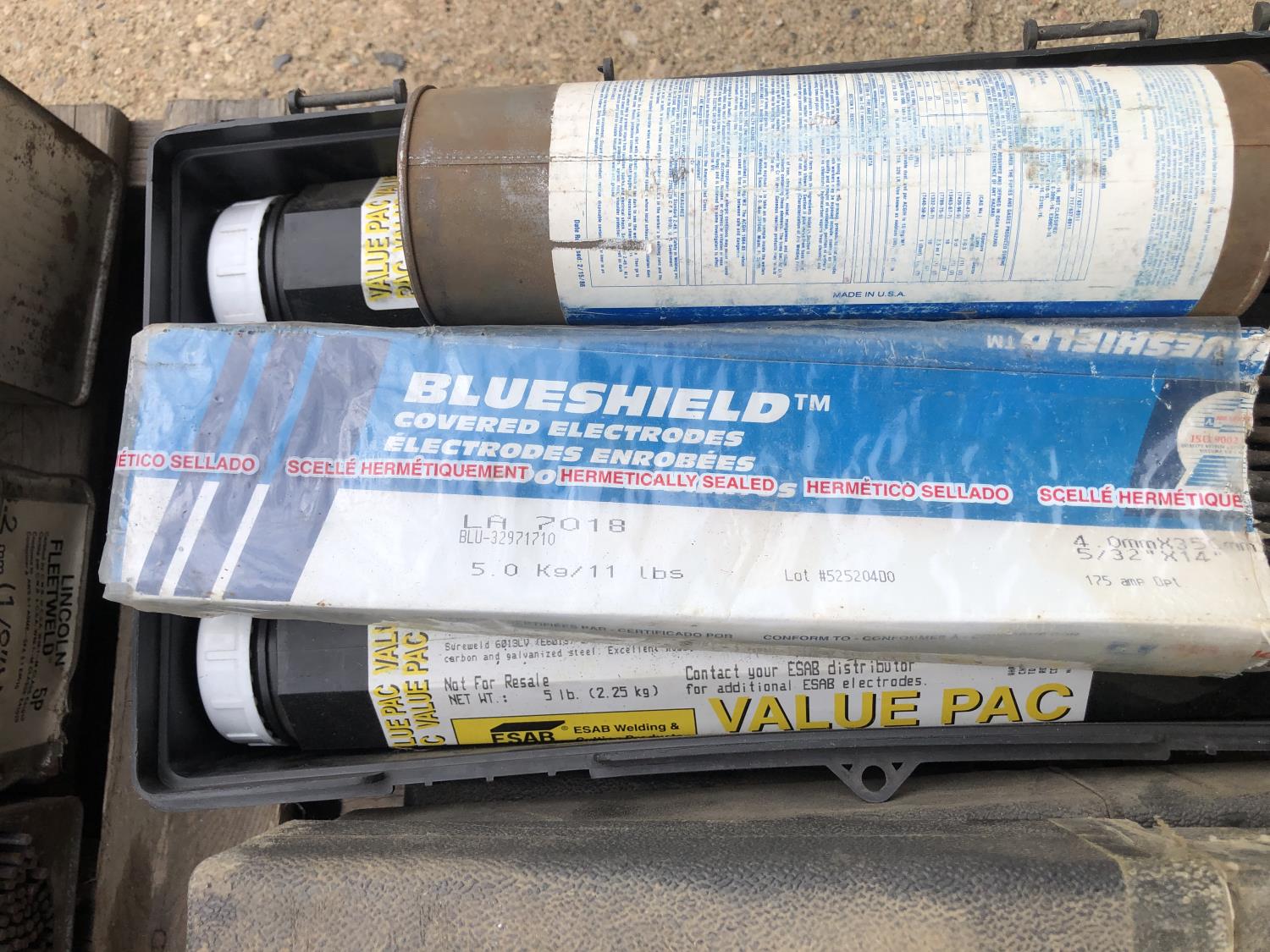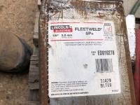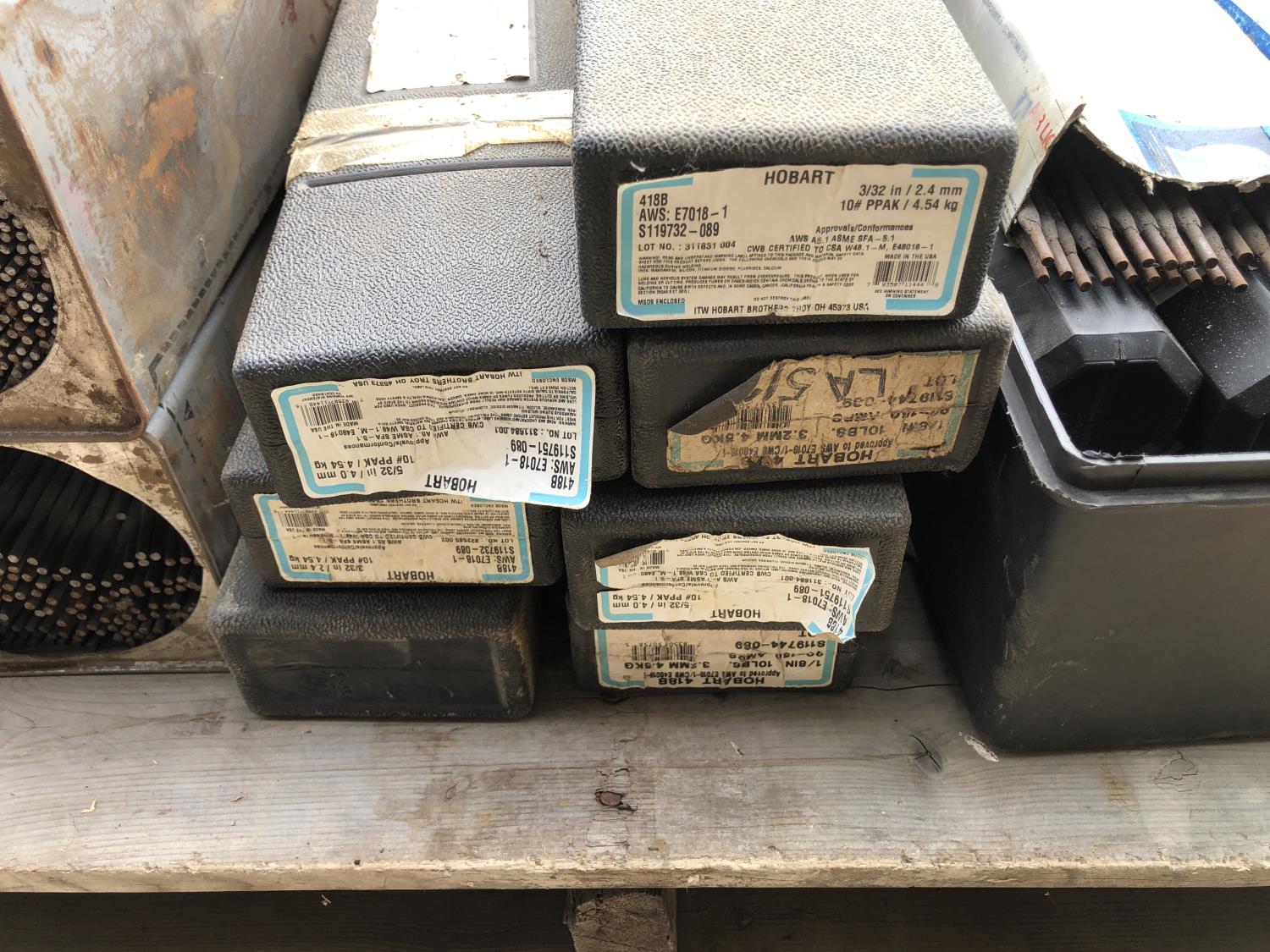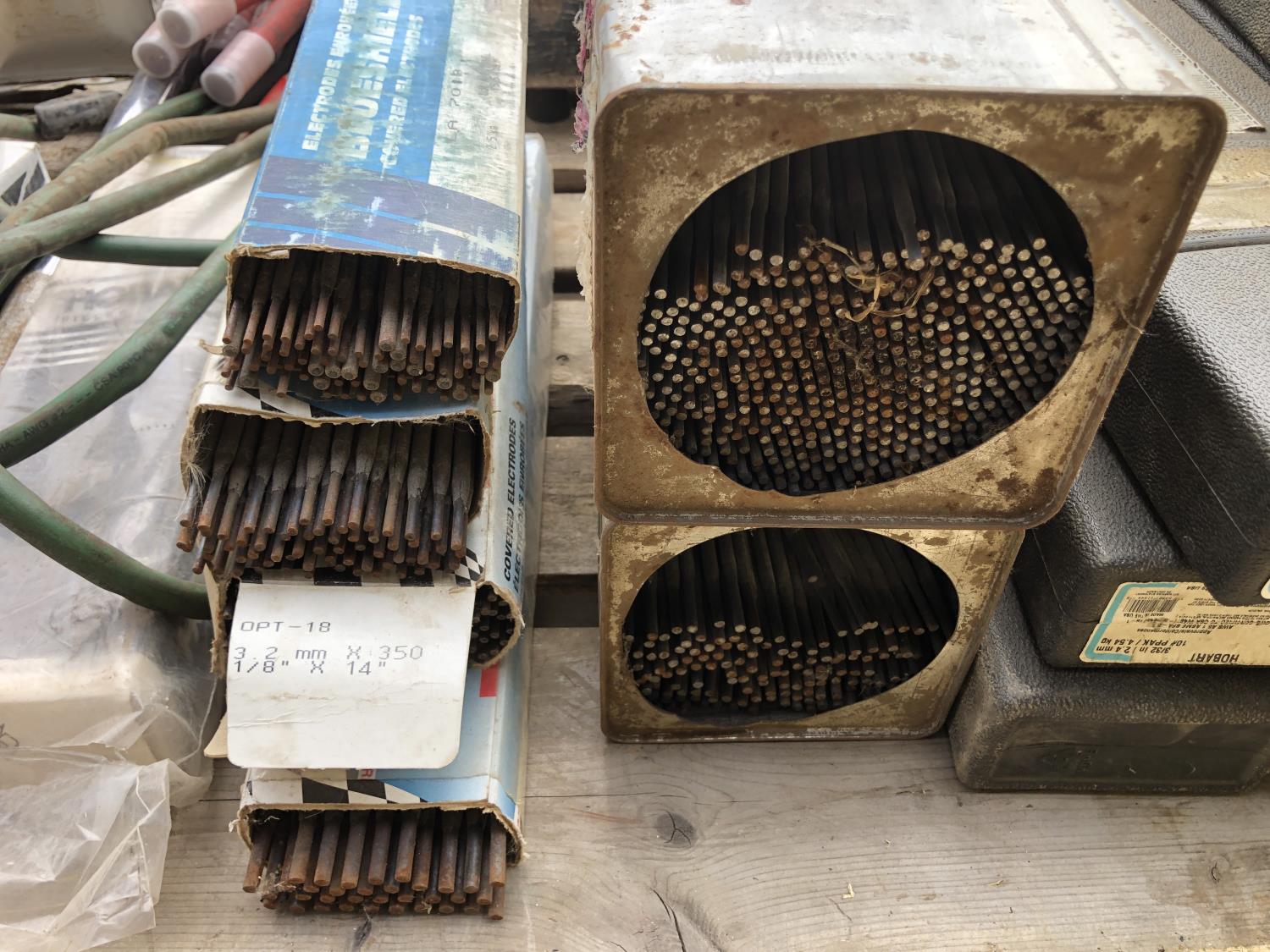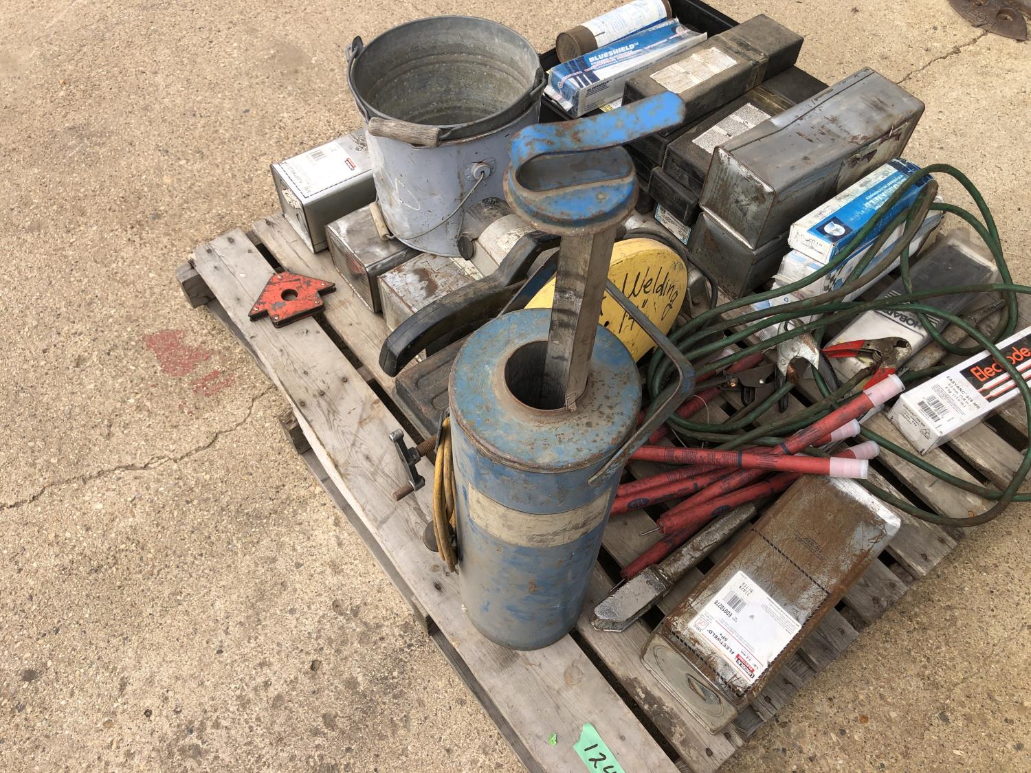 large assortment of welding rods, 14 inch chop saw, chrome snipe, road planes, (2) metal pails, ground cable, rod oven