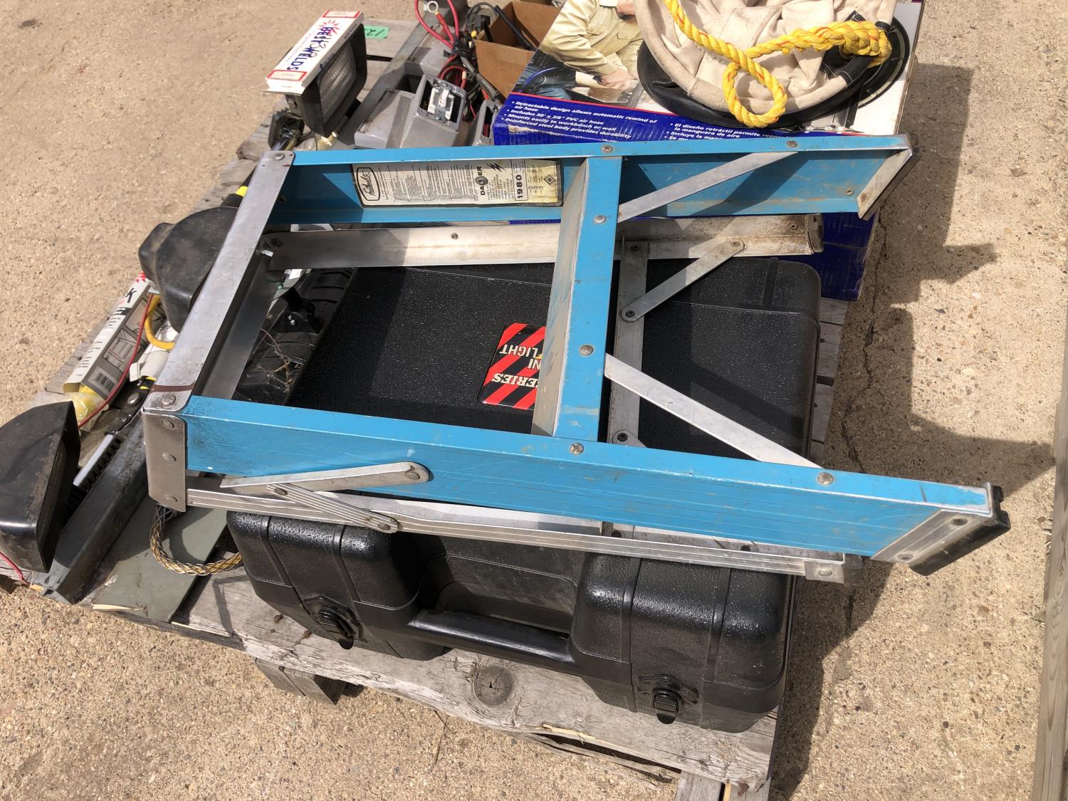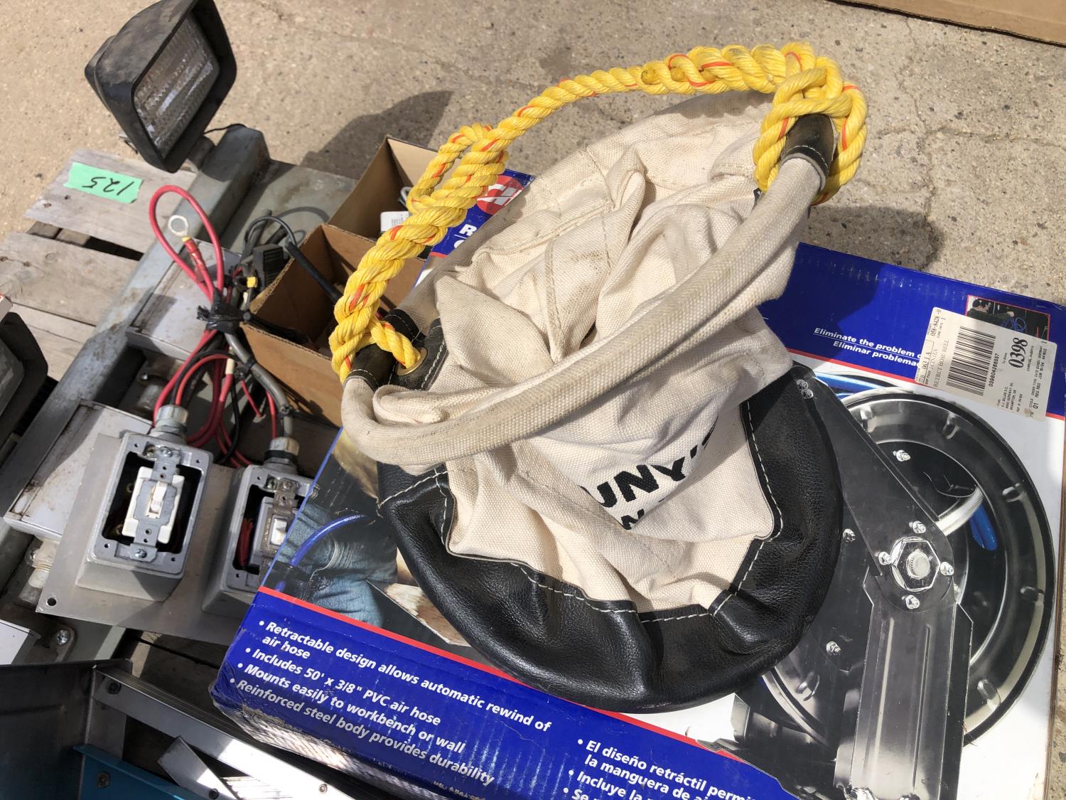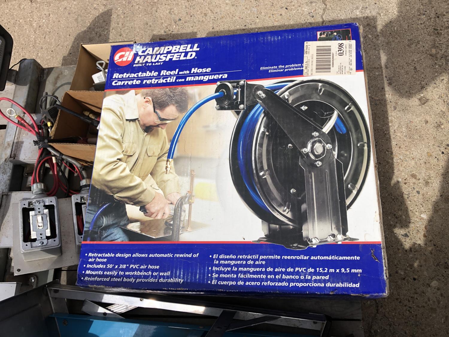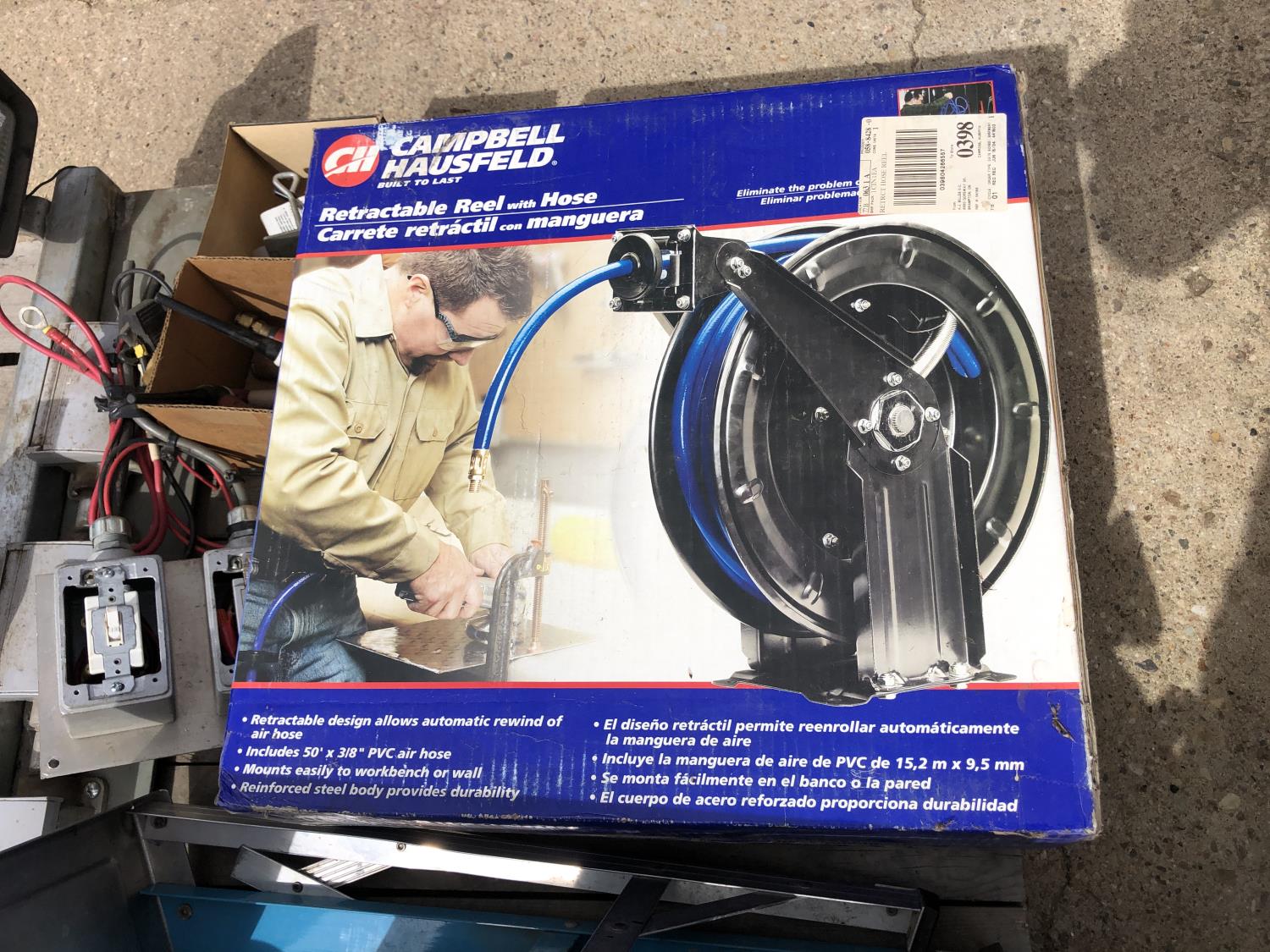50 ft X 3/8 inch retractable air reel and hose, shop built light bar with outlets, 2 step/step ladder, welding rod bag, flood light with tri-pod and case, (2) quick support rod