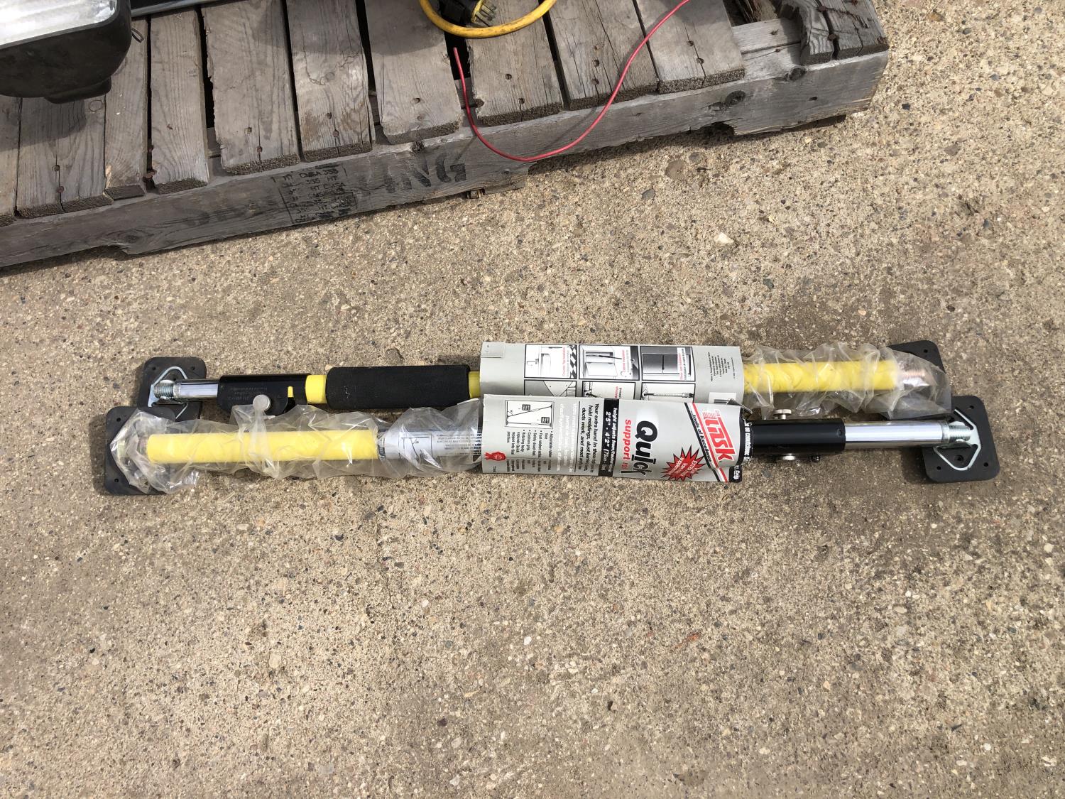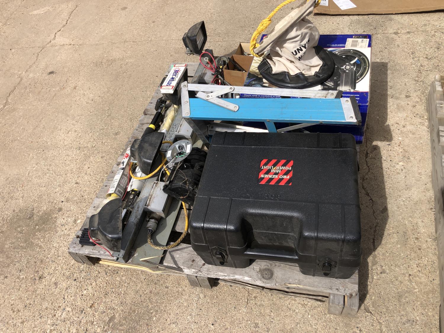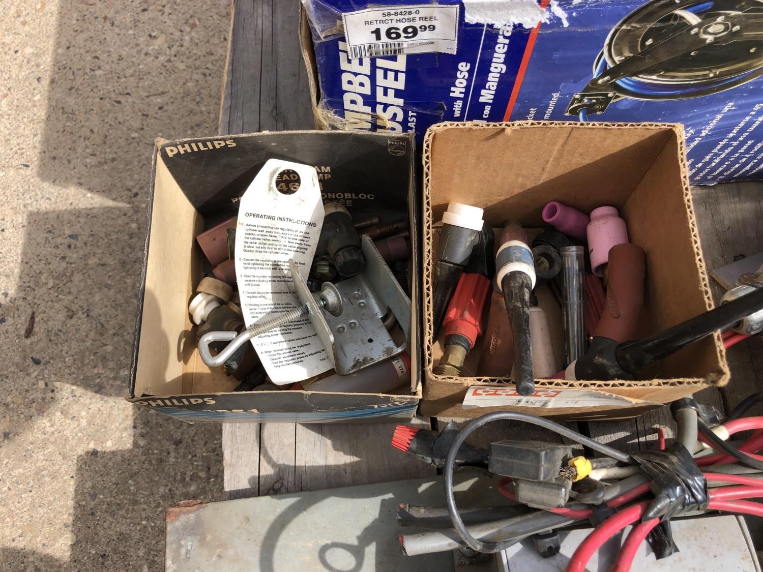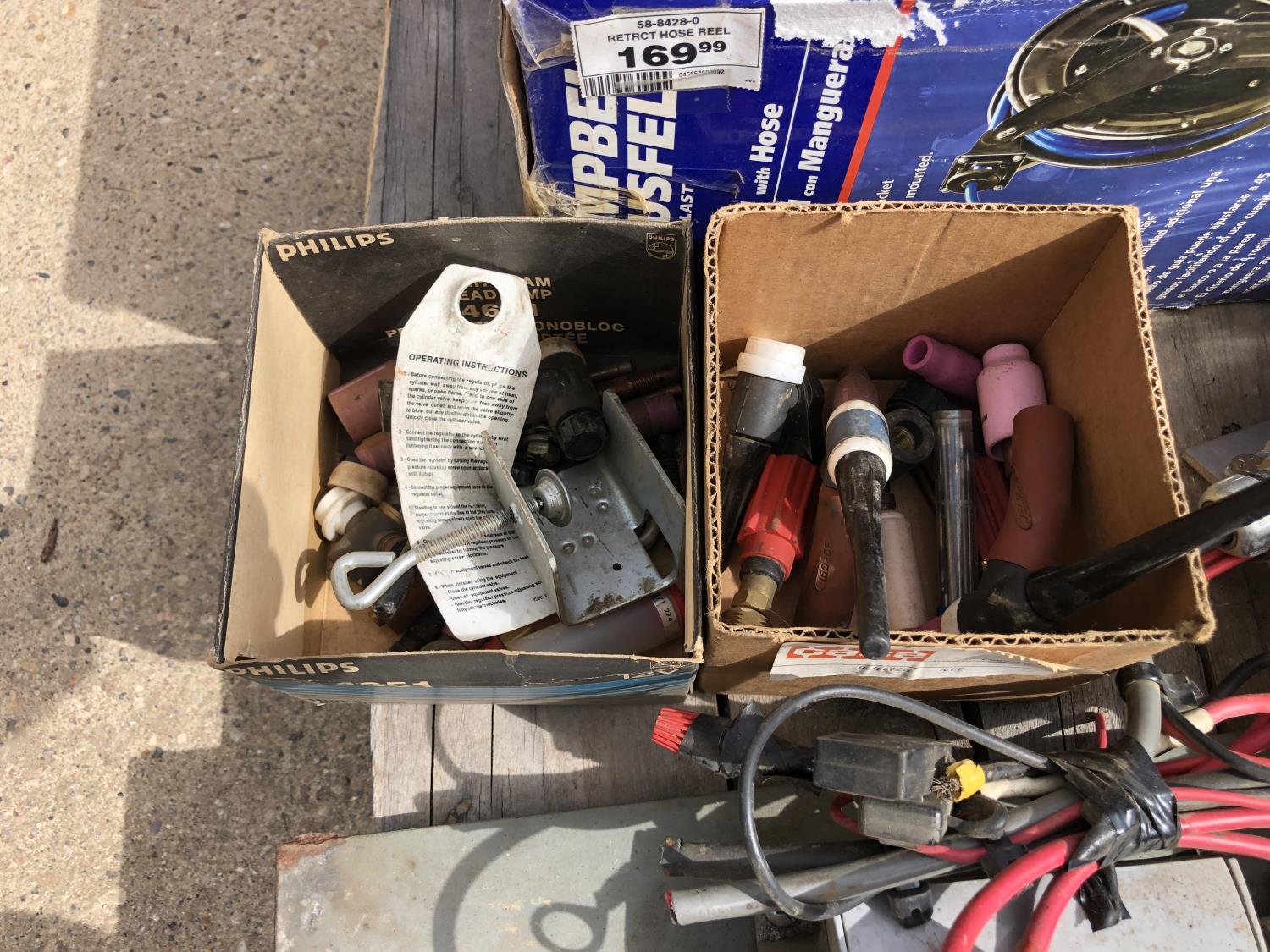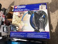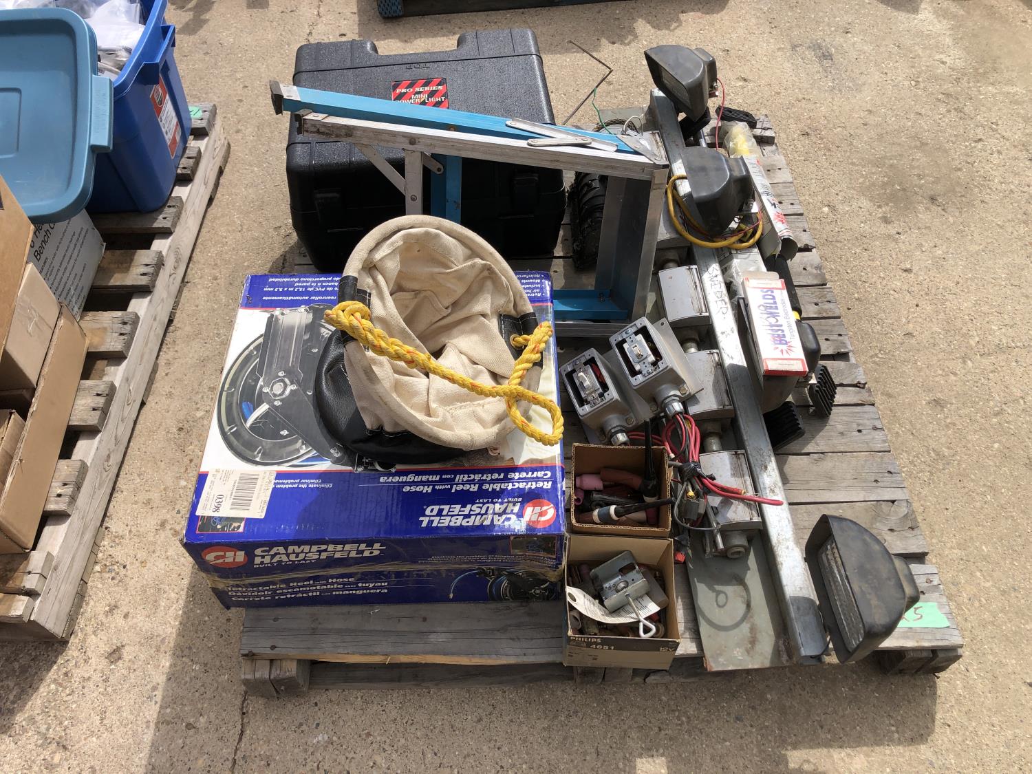 50 ft X 3/8 inch retractable air reel and hose, shop built light bar with outlets, 2 step/step ladder, welding rod bag, flood light with tri-pod and case, (2) quick support rod