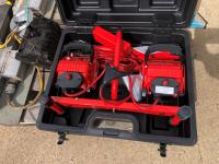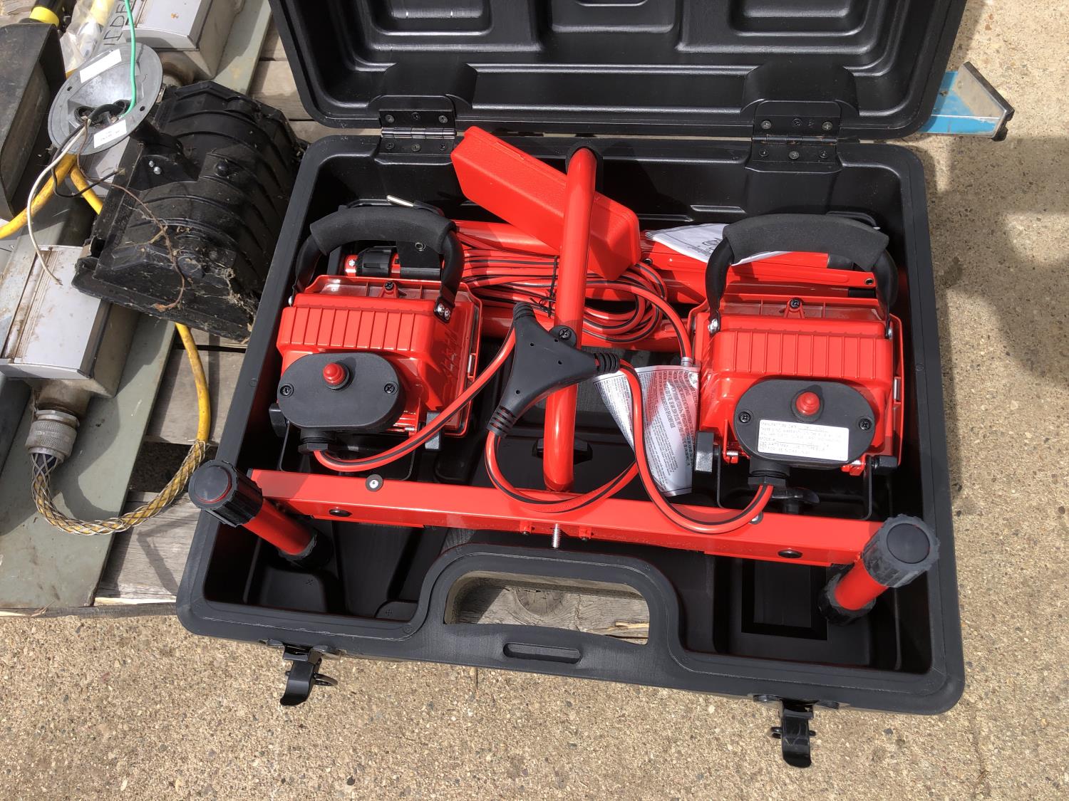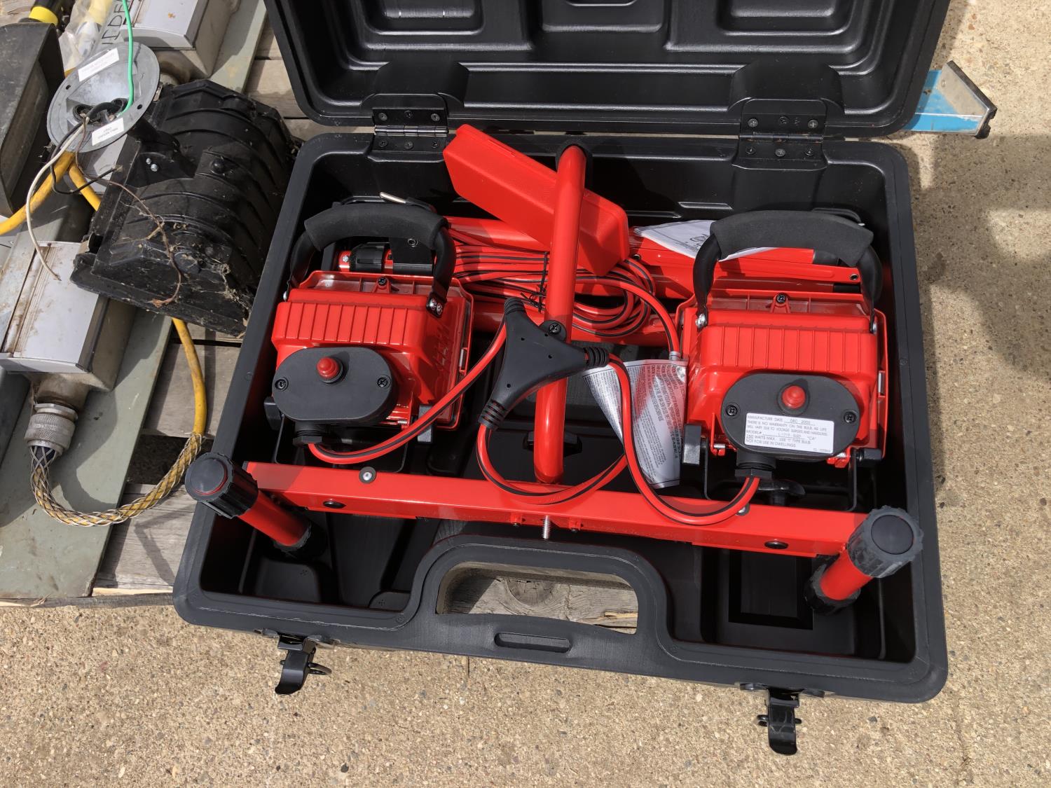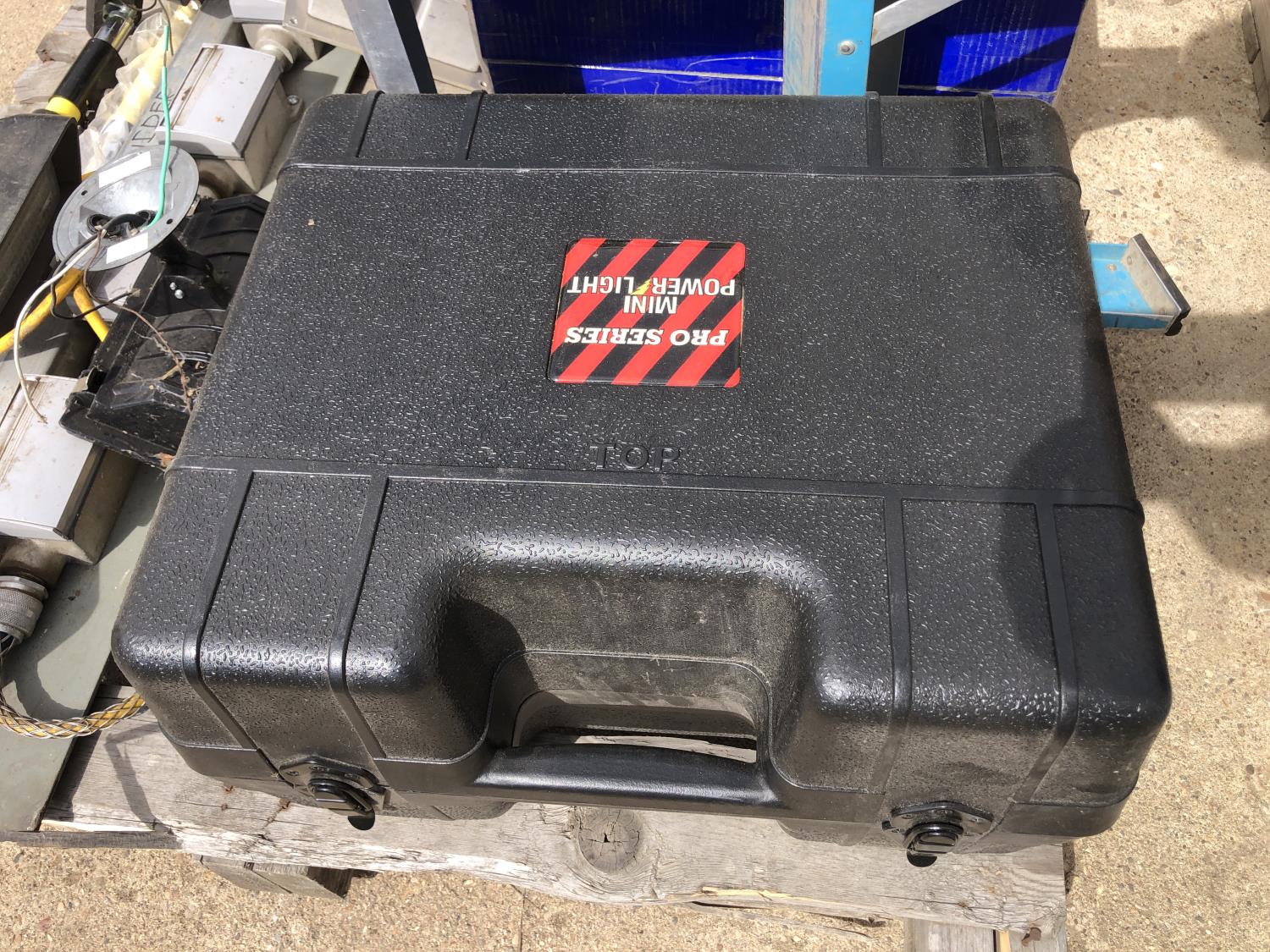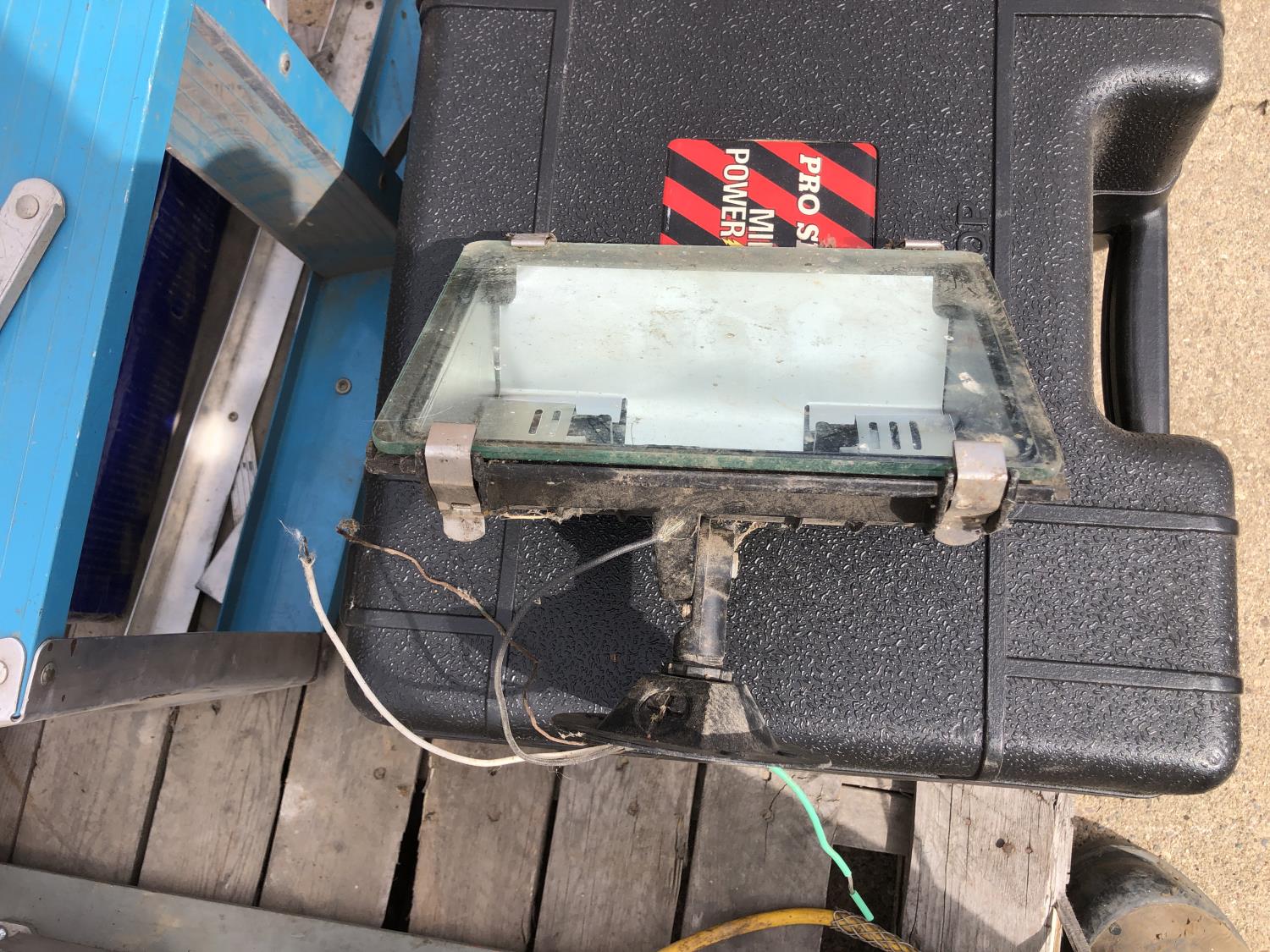 50 ft X 3/8 inch retractable air reel and hose, shop built light bar with outlets, 2 step/step ladder, welding rod bag, flood light with tri-pod and case, (2) quick support rod