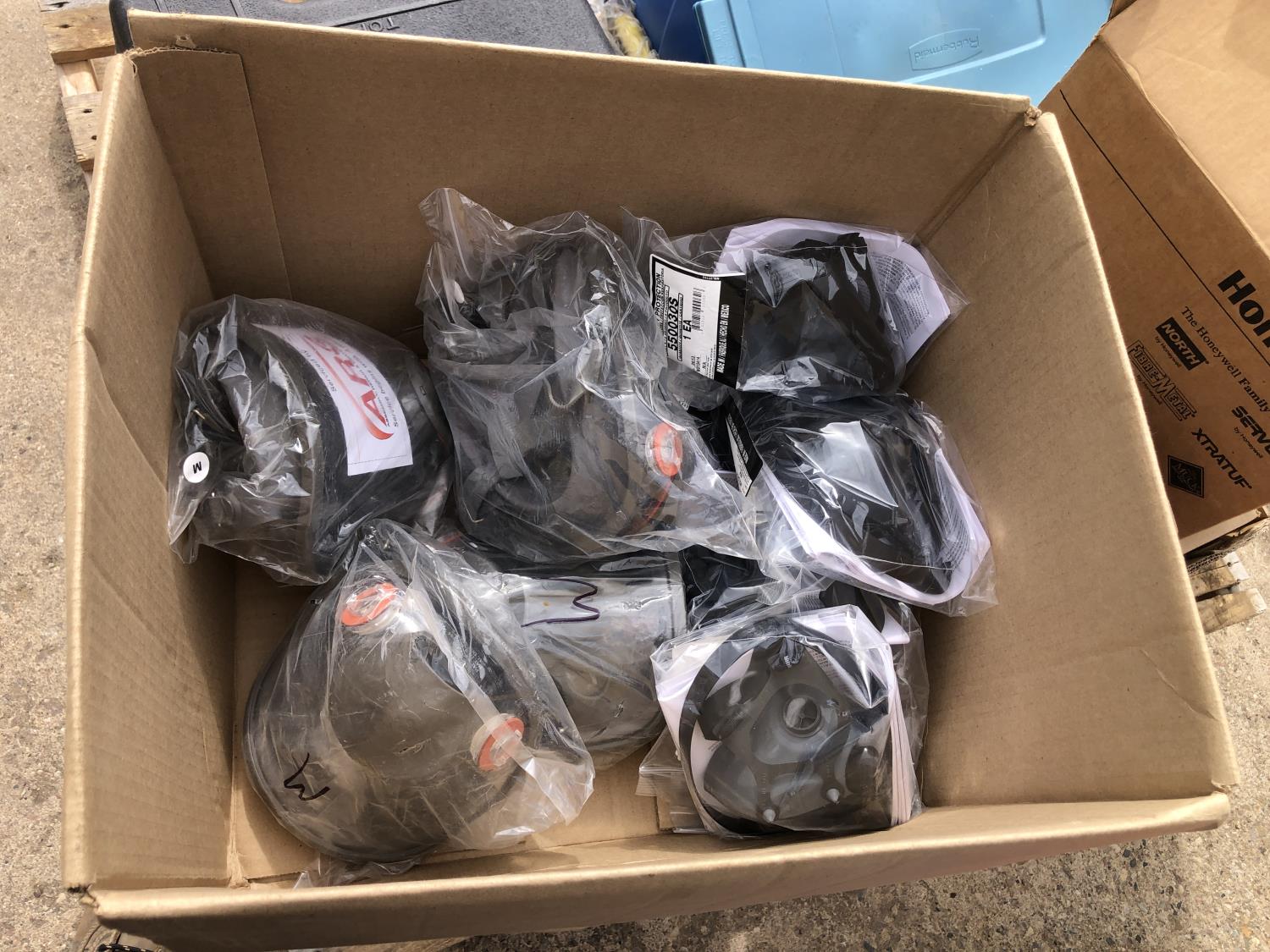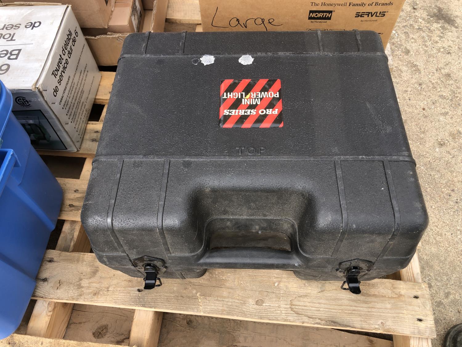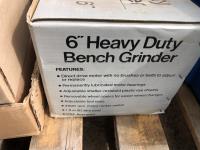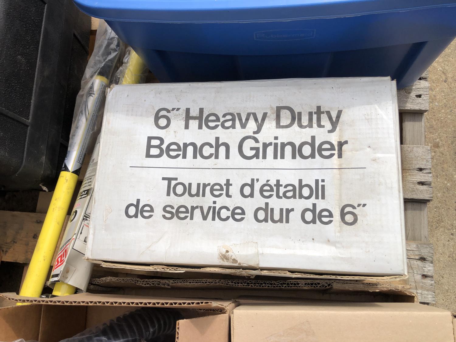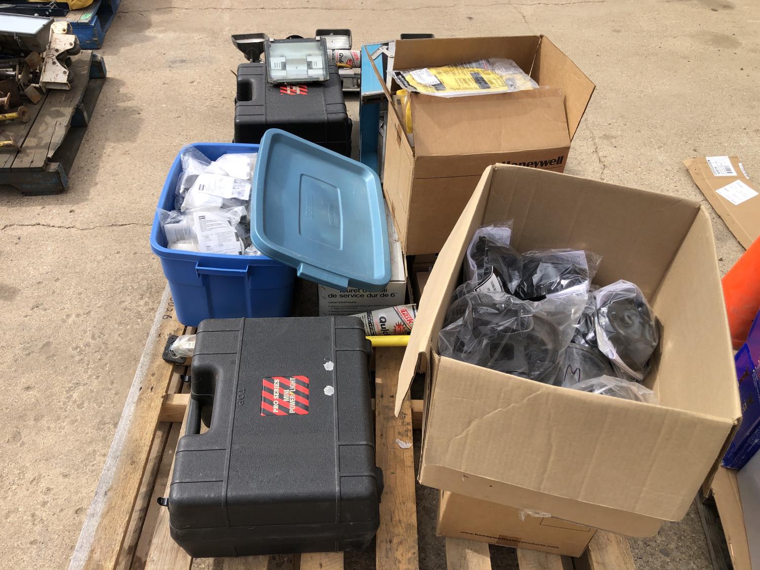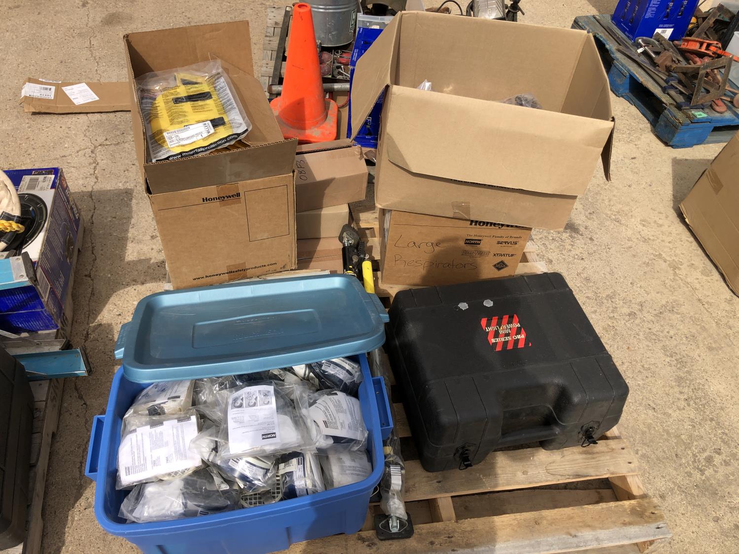 6 inch bench grinder, (2) quick support rods, quantity of lanyard pouches, assortment of respirator masks, quantity of respirator hose, respirator filters 92 styles), flood light with tri-pod and case