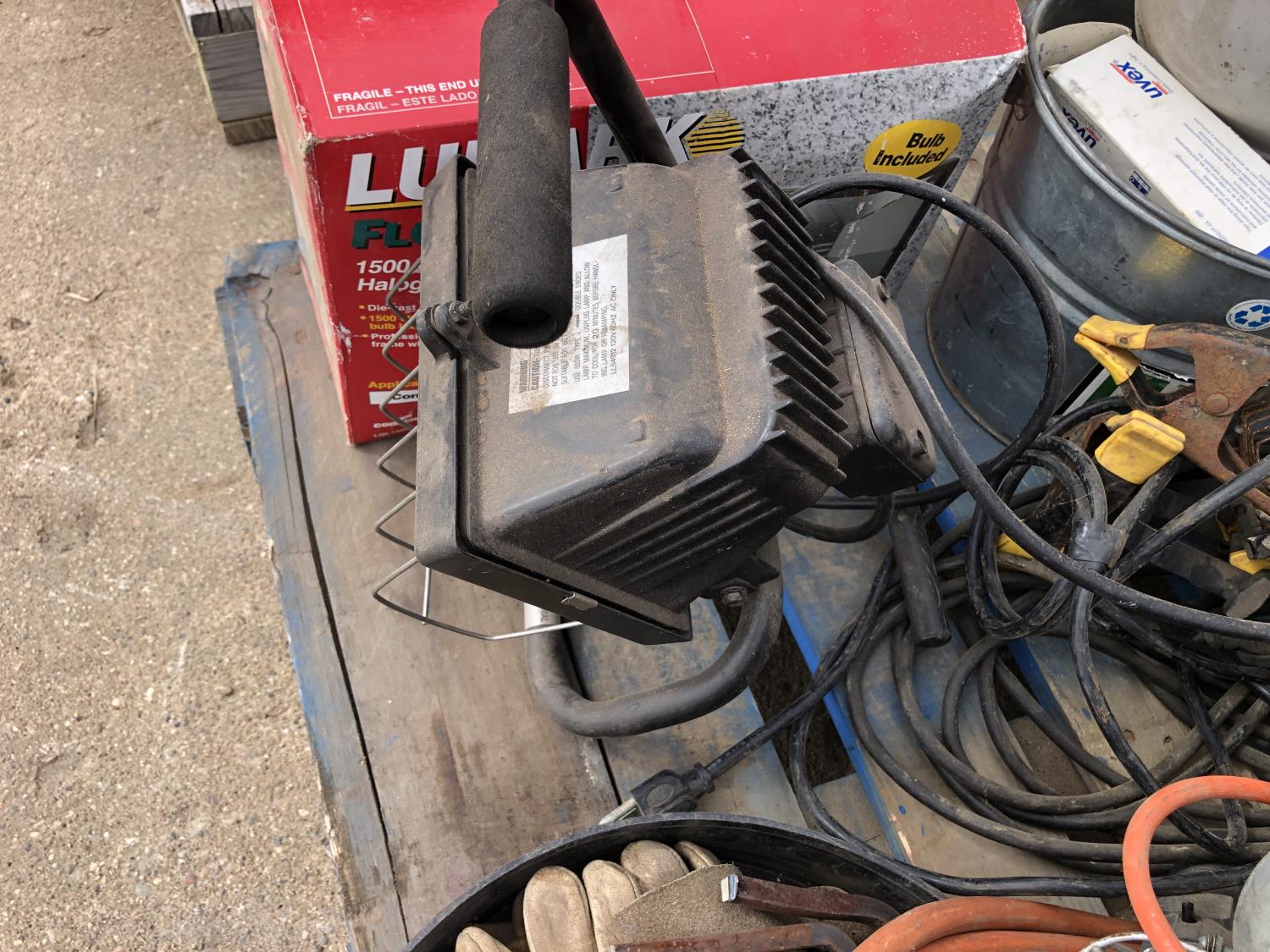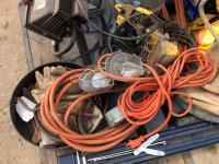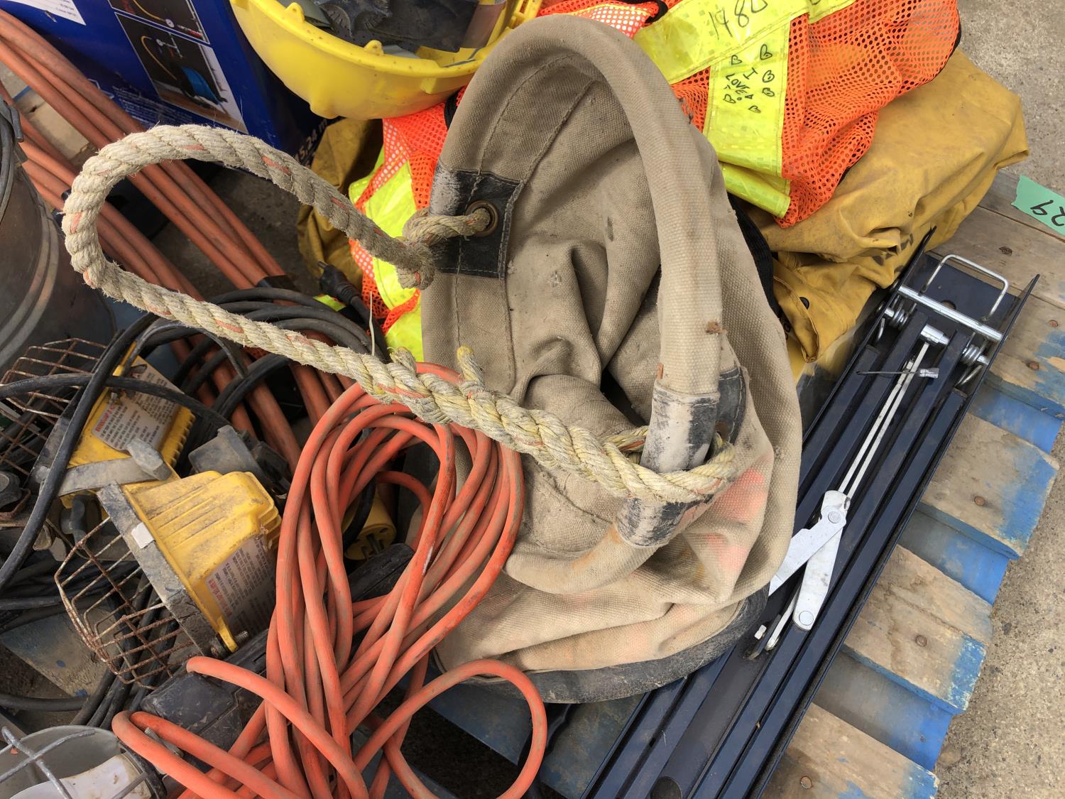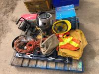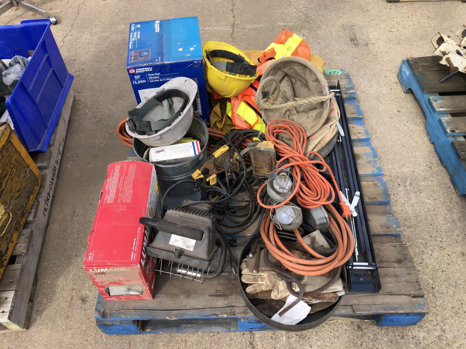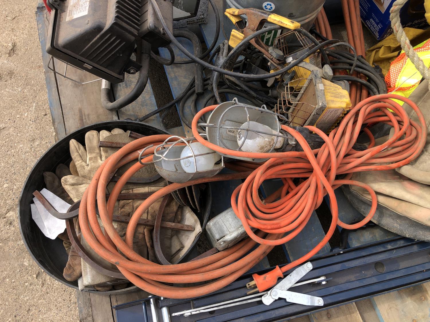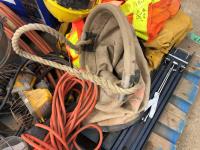 manual hose reel, folding saw horse, flood lights, trouble lights, welding rod bag, air line, metal pail, rain coat, assorted welding gloves, quantity of chain hooks