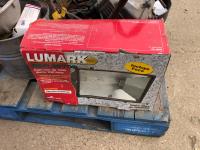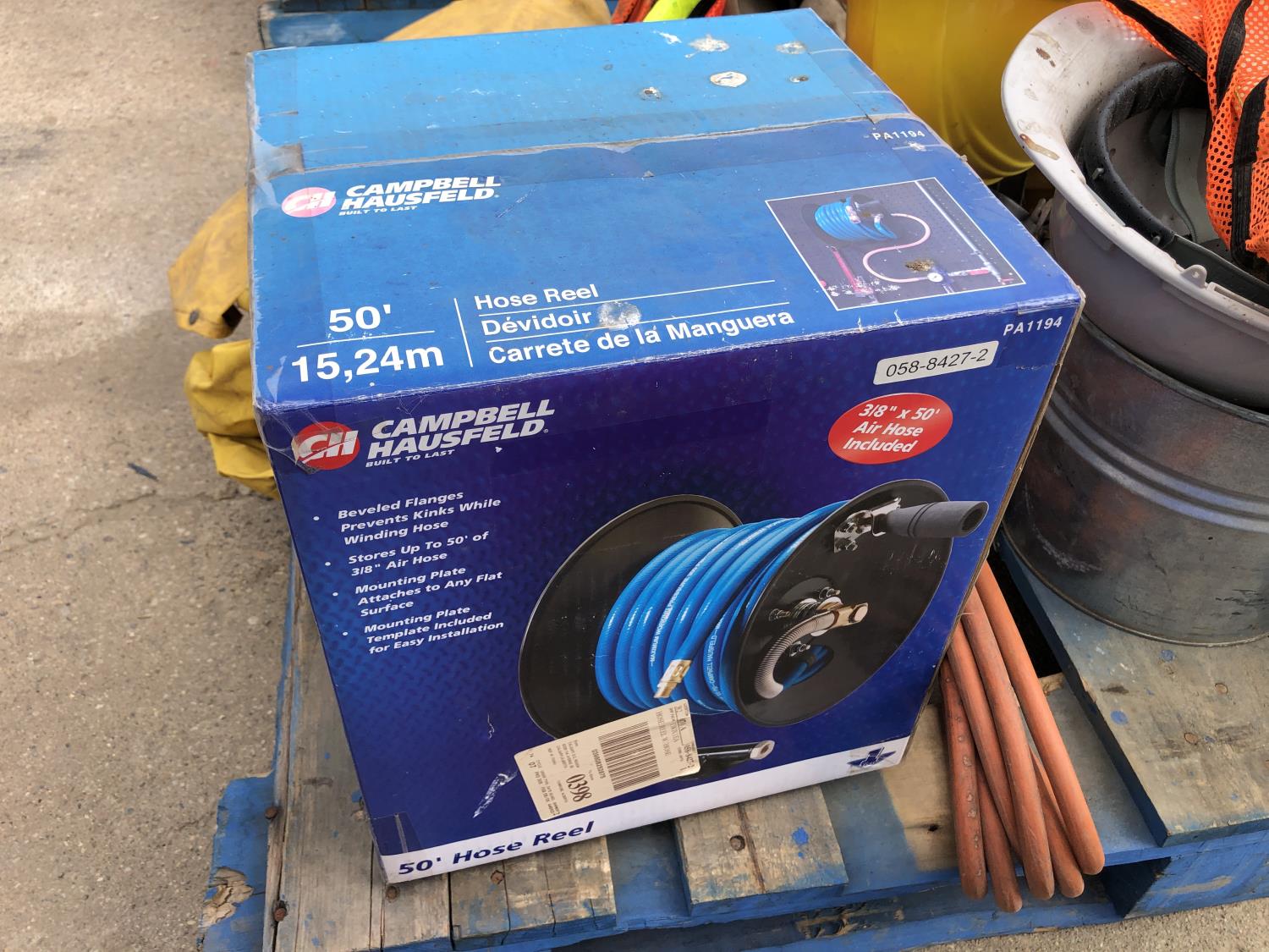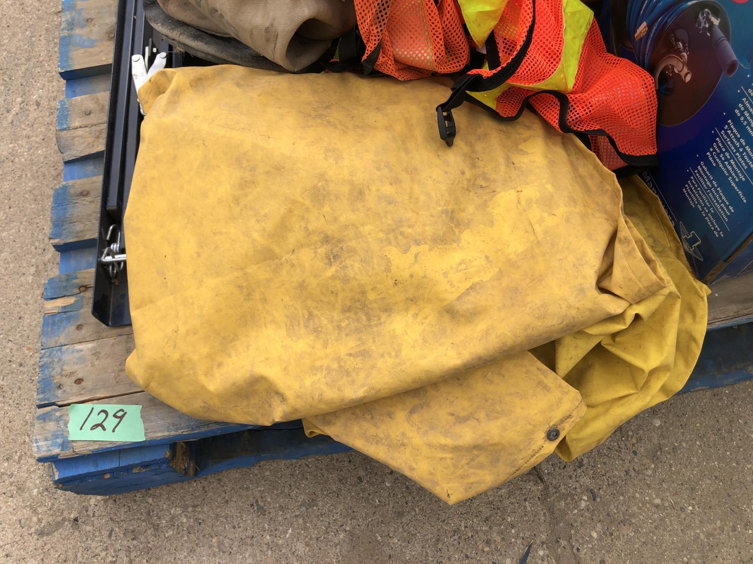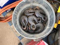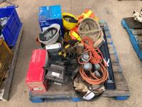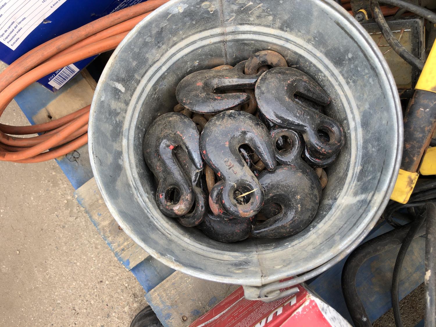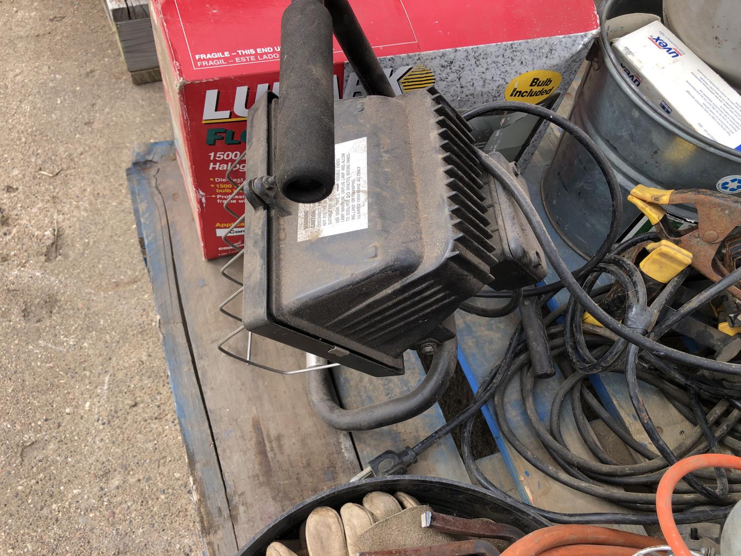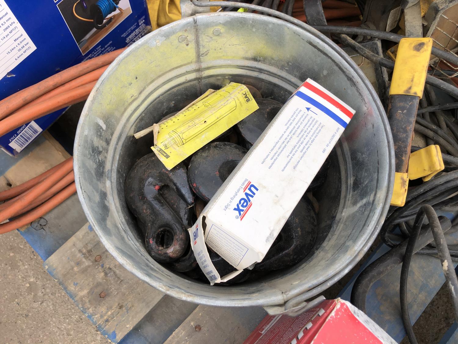 manual hose reel, folding saw horse, flood lights, trouble lights, welding rod bag, air line, metal pail, rain coat, assorted welding gloves, quantity of chain hooks