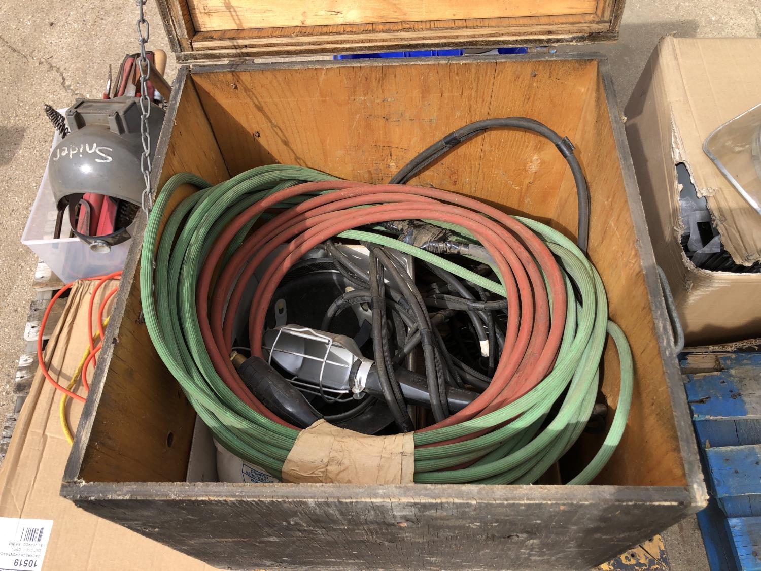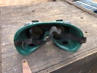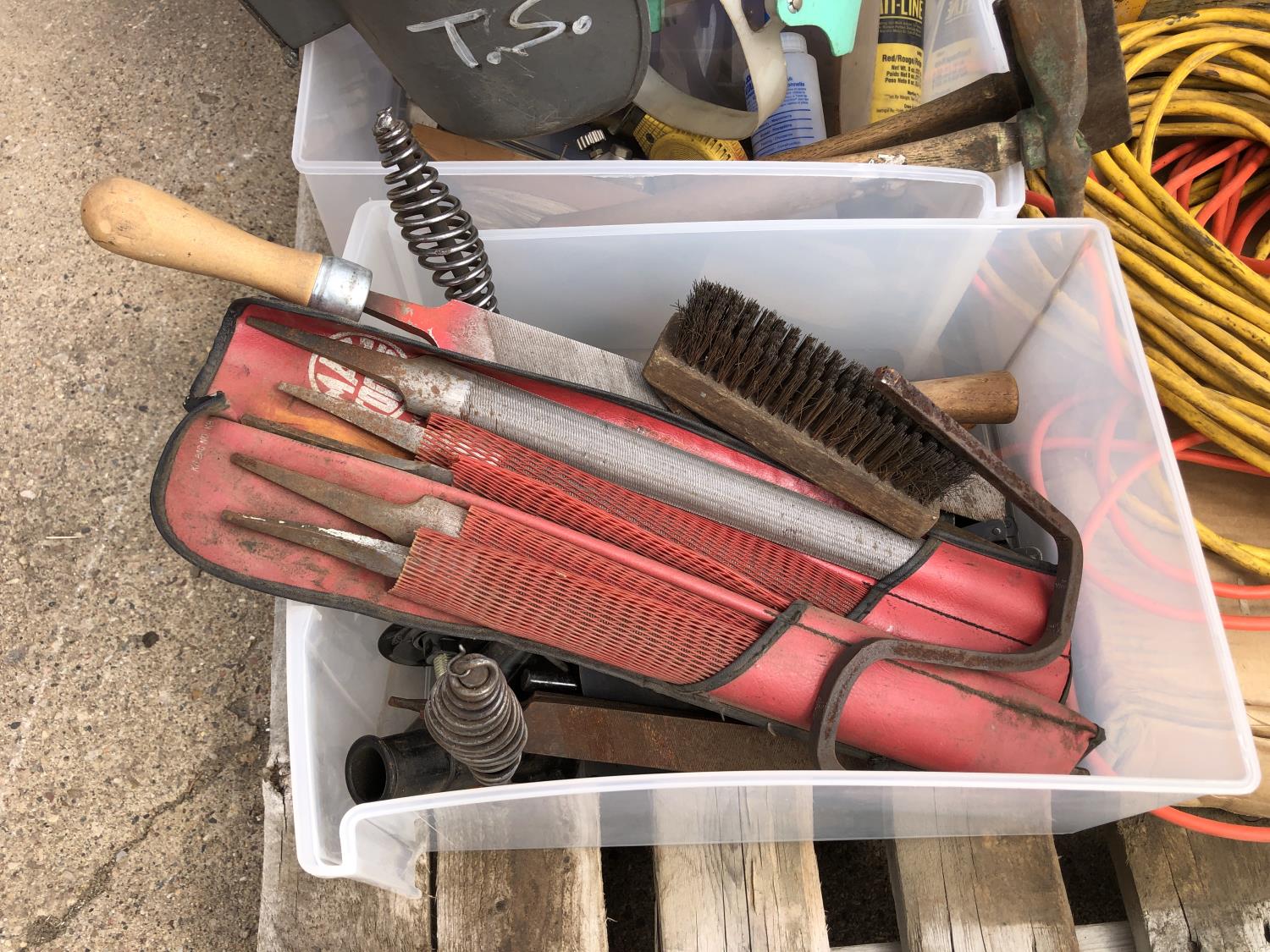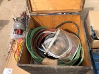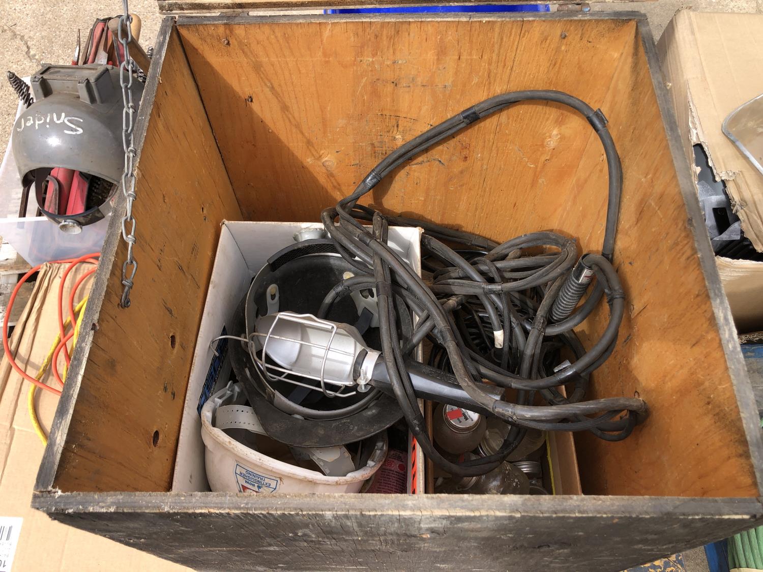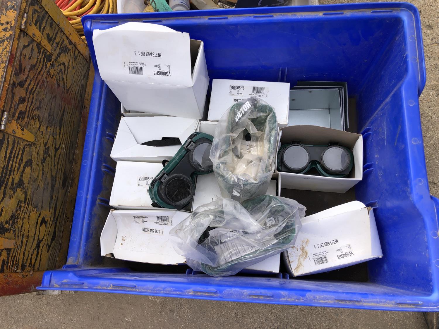 quantity of tinted goggles, welding helmet, (2) torches (missing tips), quantity of files, extension cords, assorted welding cables, (2) wooden boxes, chipping hammers, (2) heat lamps unused