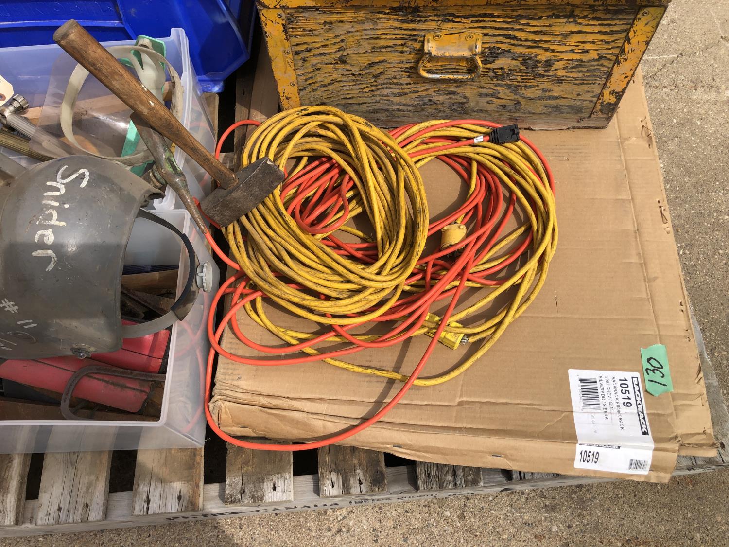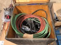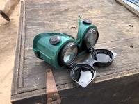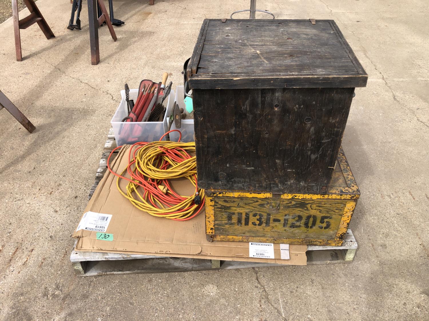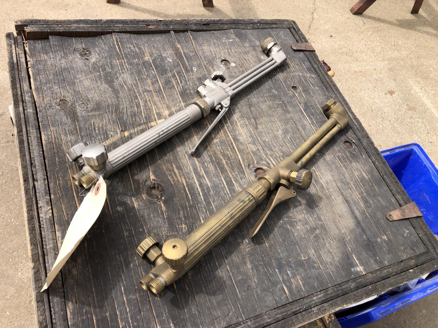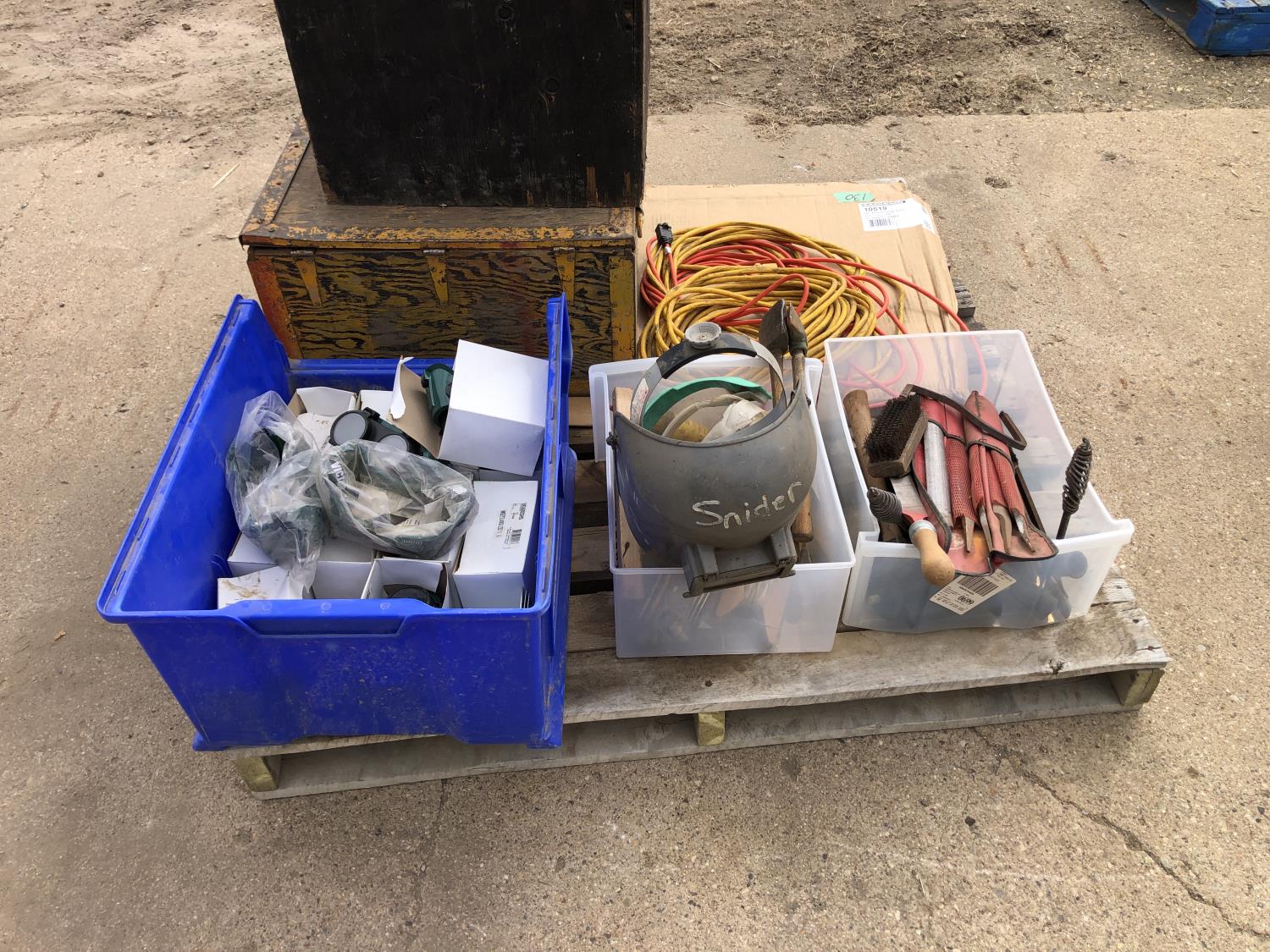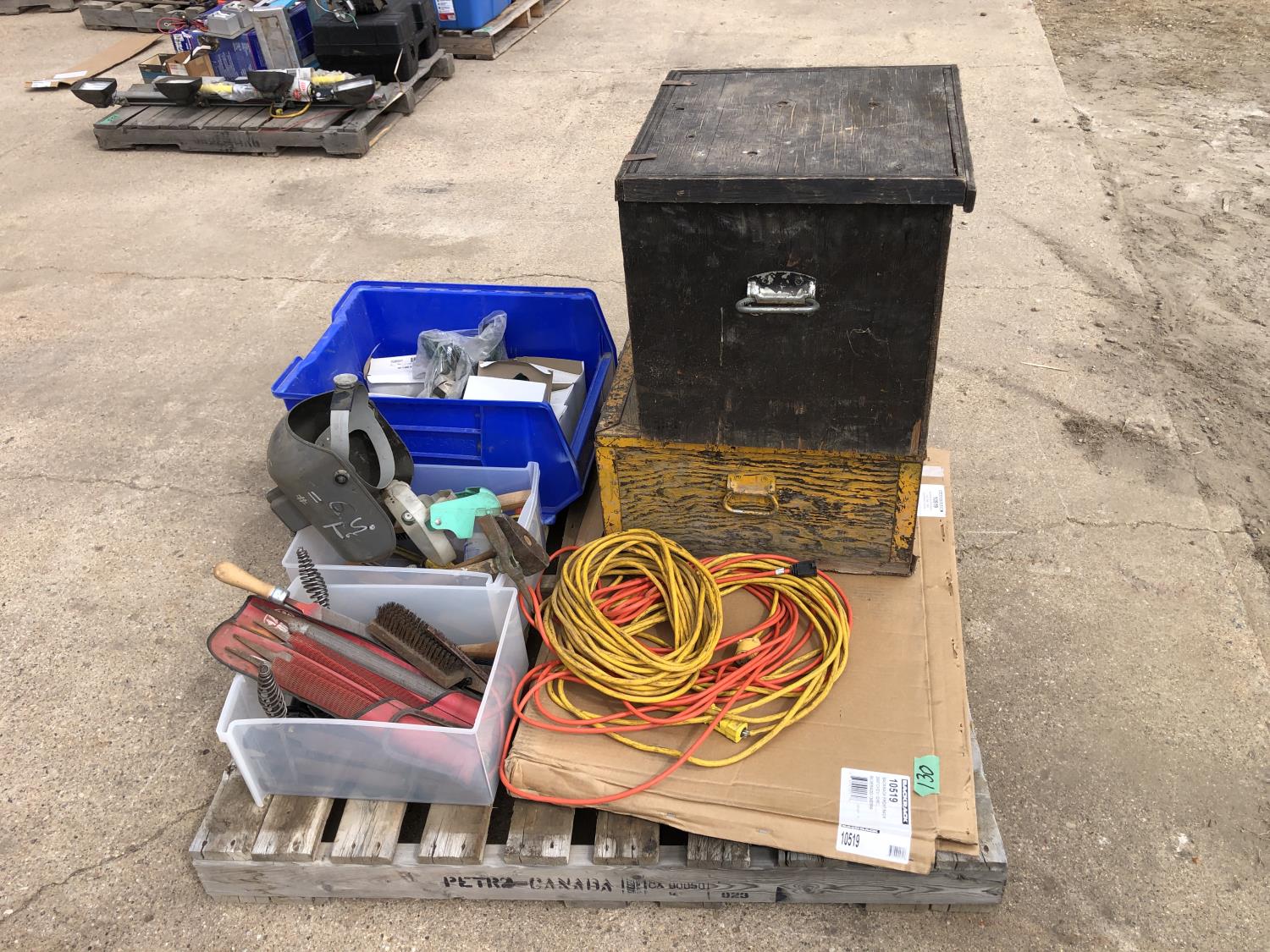 quantity of tinted goggles, welding helmet, (2) torches (missing tips), quantity of files, extension cords, assorted welding cables, (2) wooden boxes, chipping hammers, (2) heat lamps unused