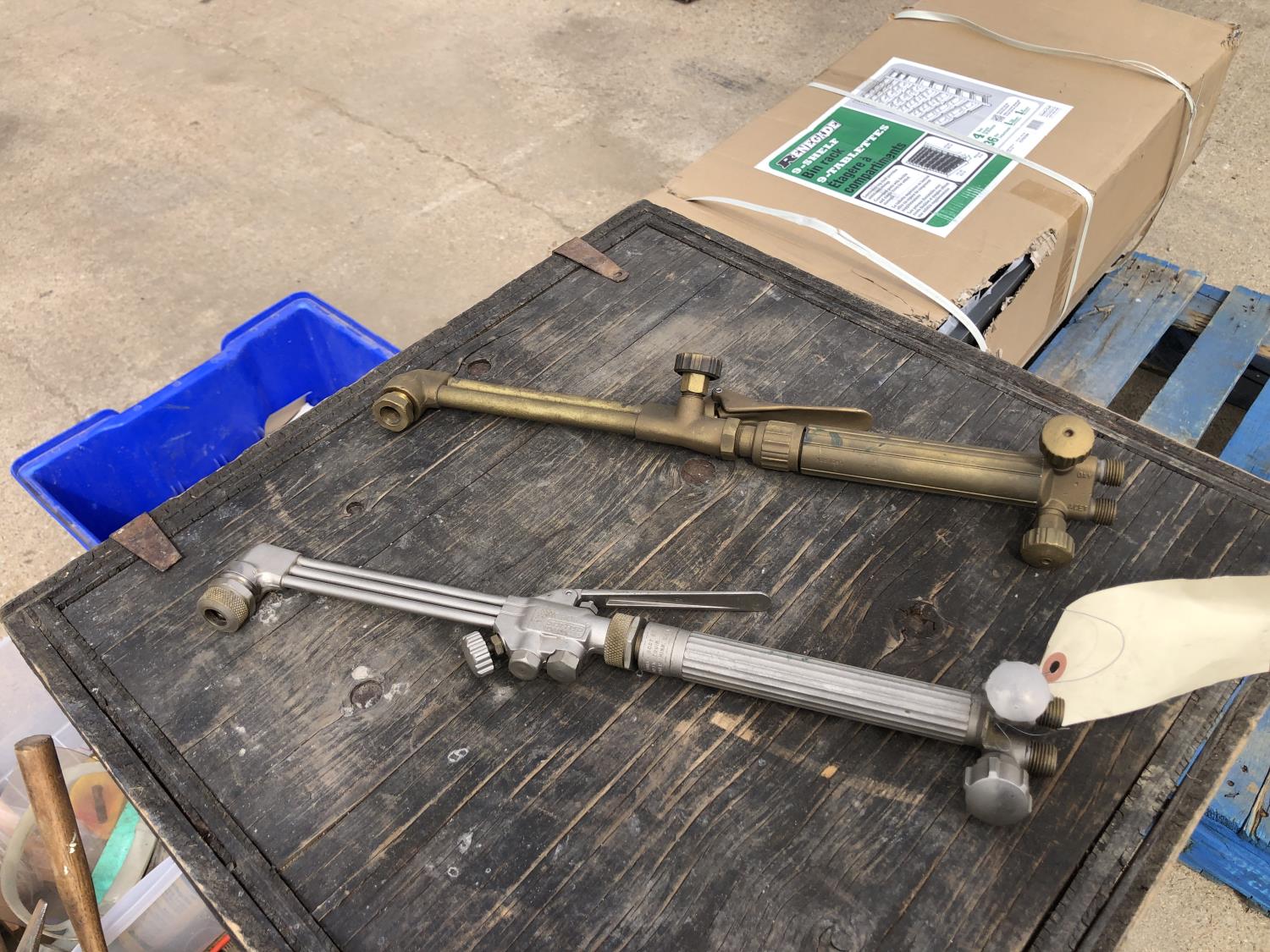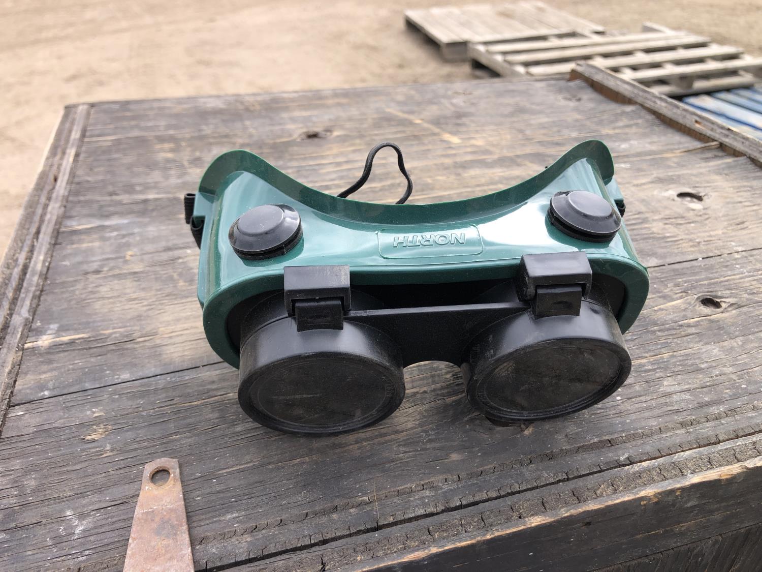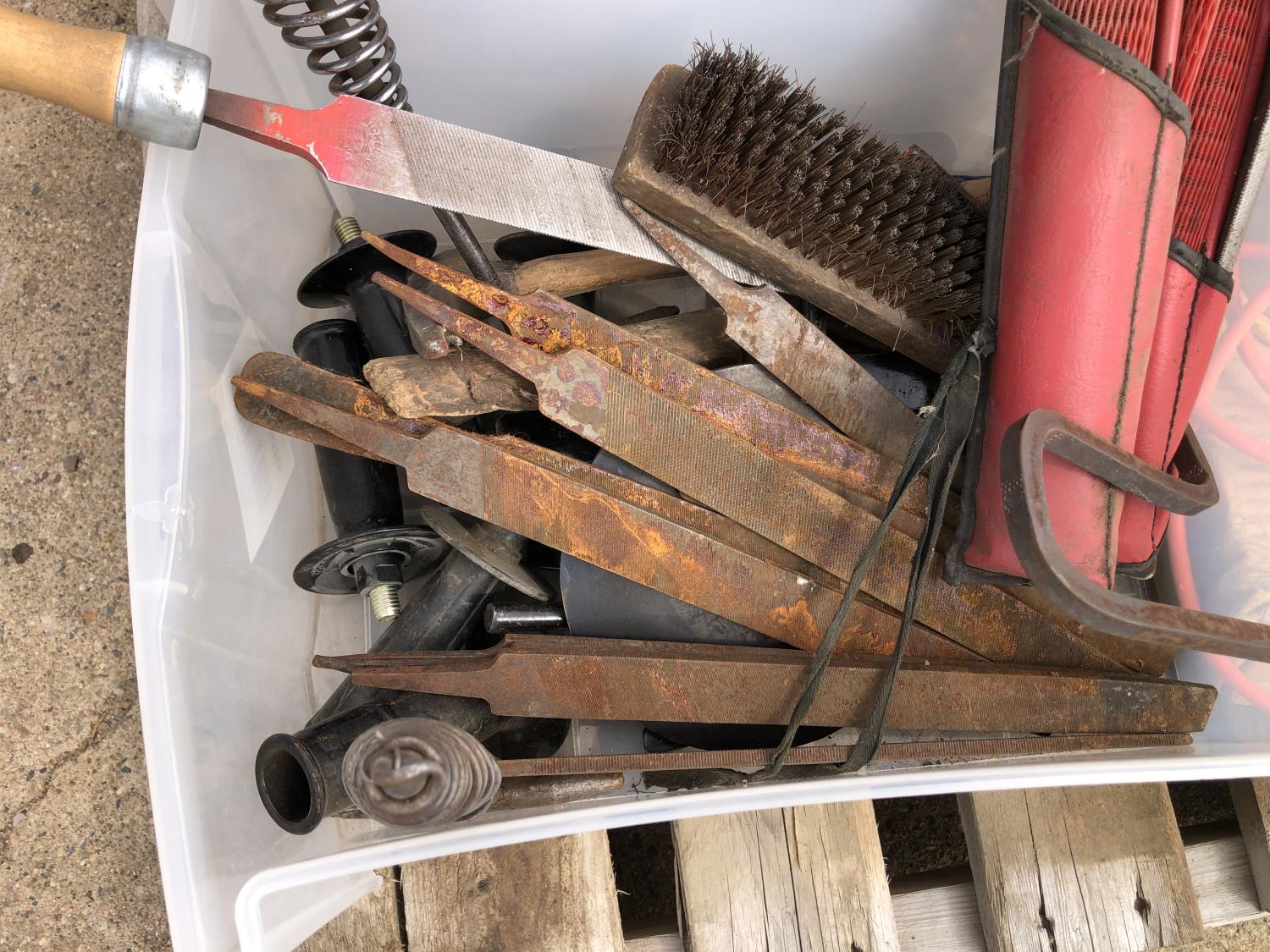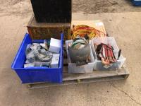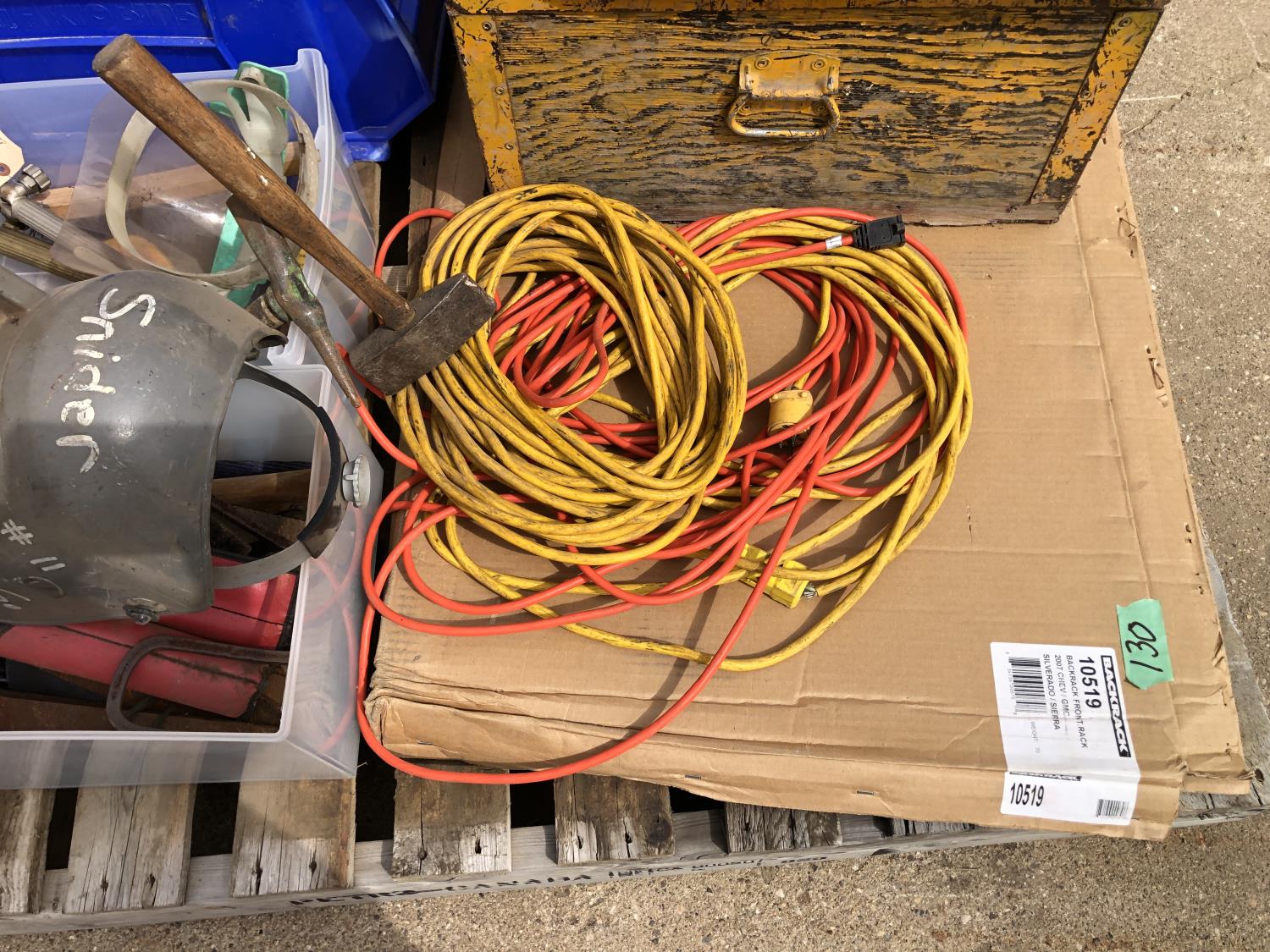 quantity of tinted goggles, welding helmet, (2) torches (missing tips), quantity of files, extension cords, assorted welding cables, (2) wooden boxes, chipping hammers, (2) heat lamps unused