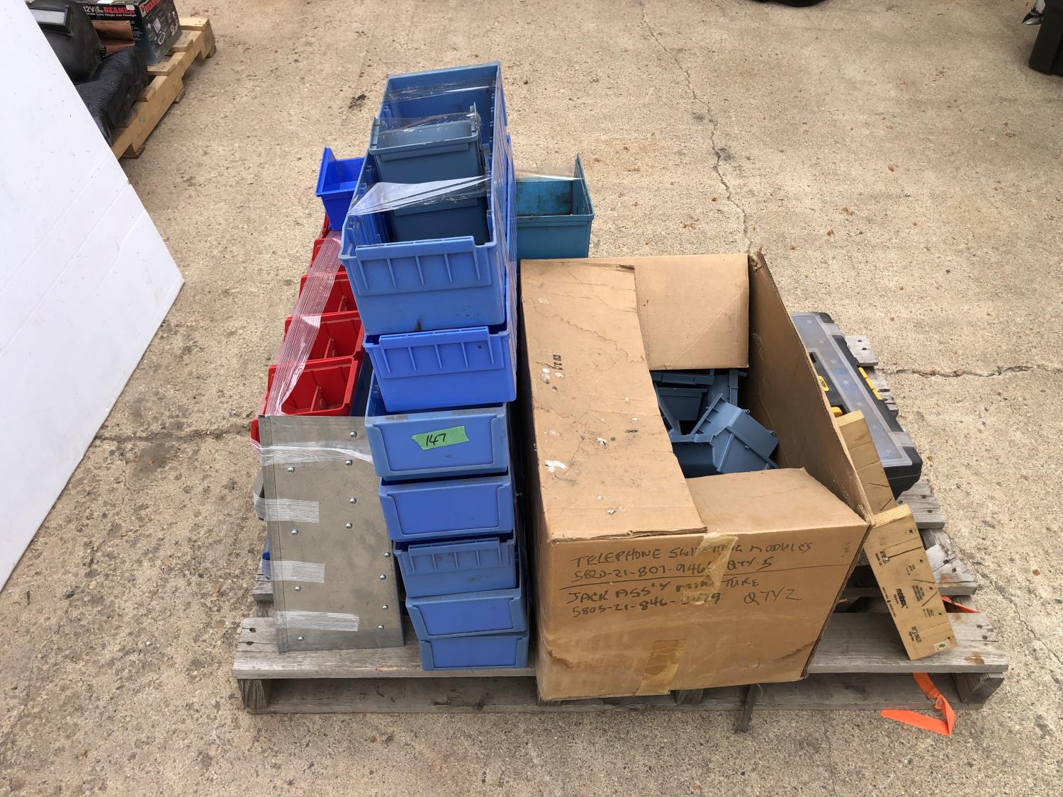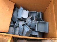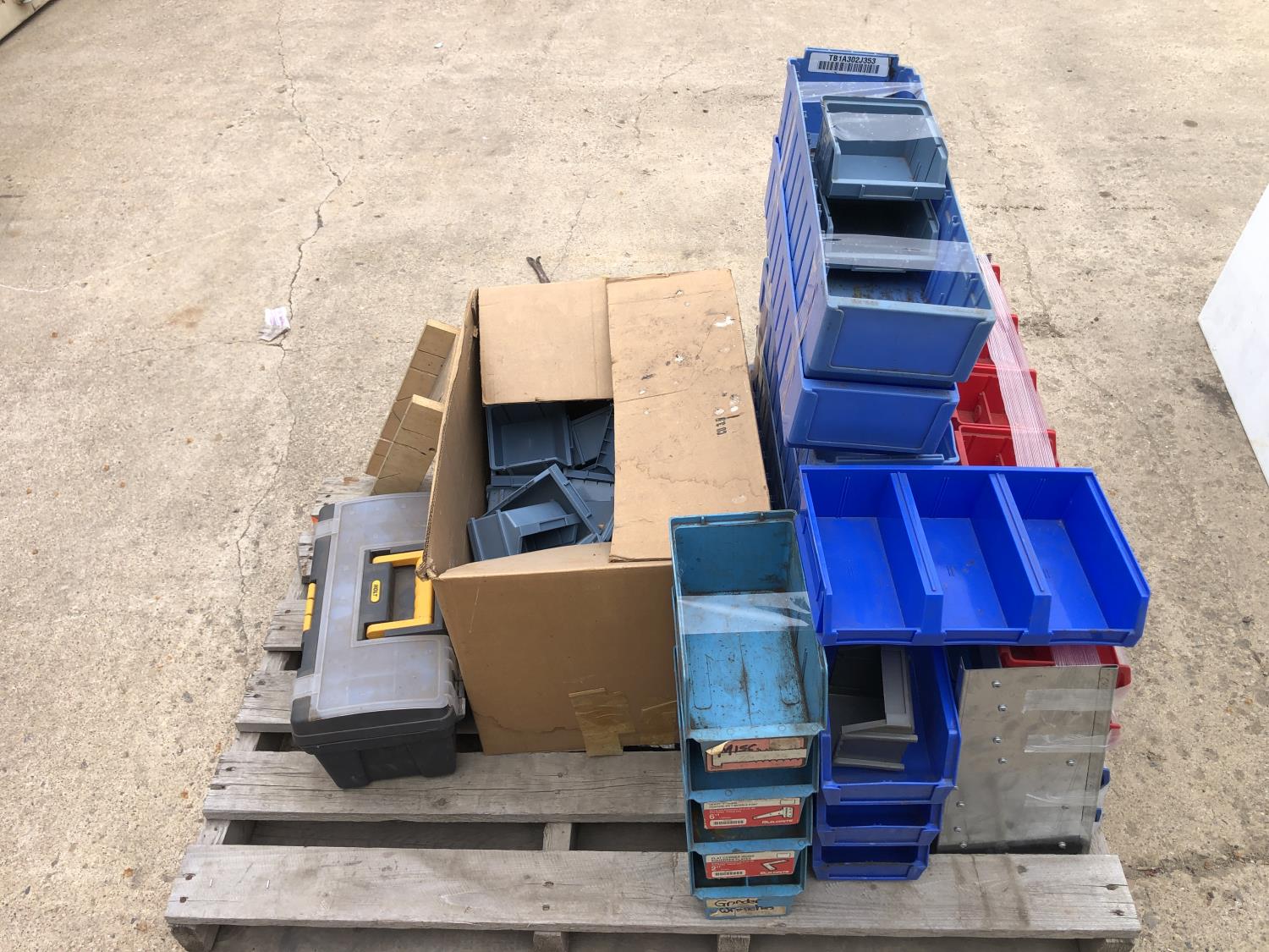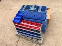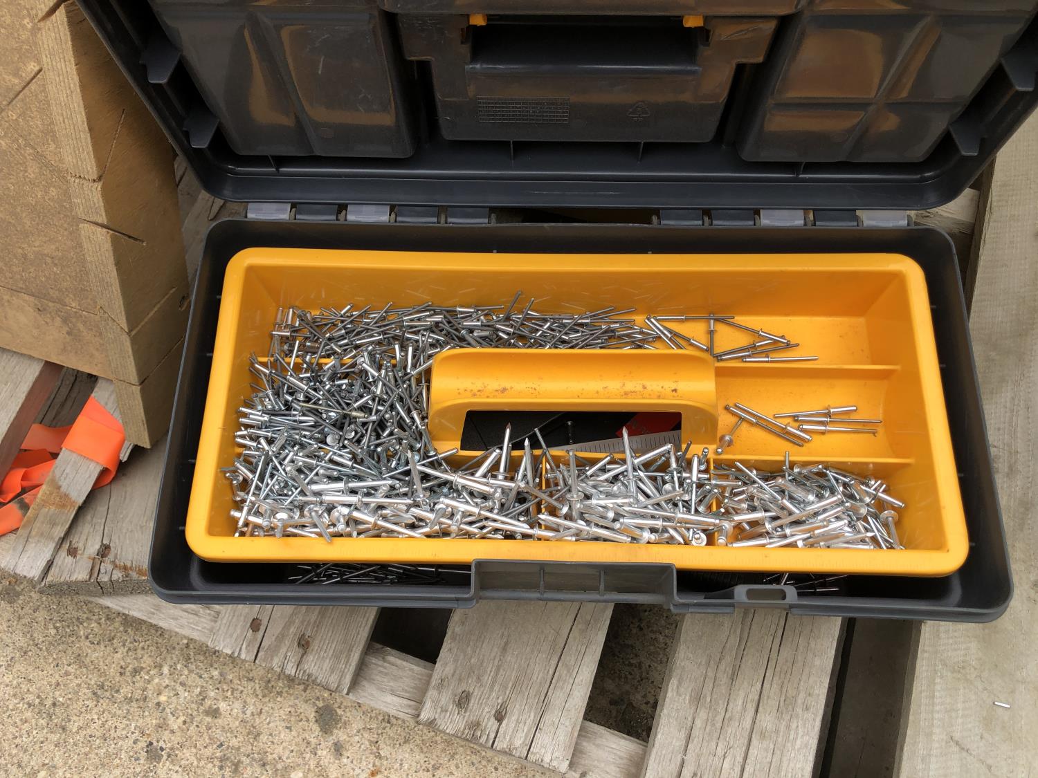 quantity of bolt storage bins, 8 inch wide mitre board, Holt tool box containing rivet gun and rivets