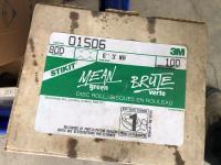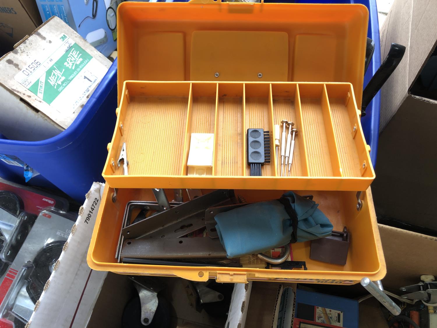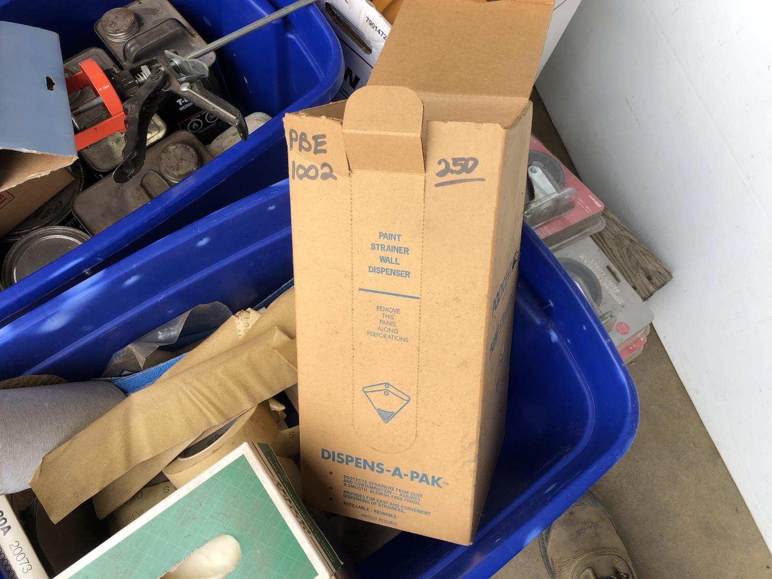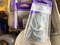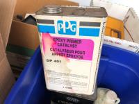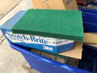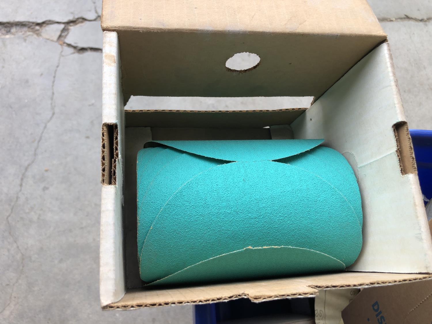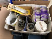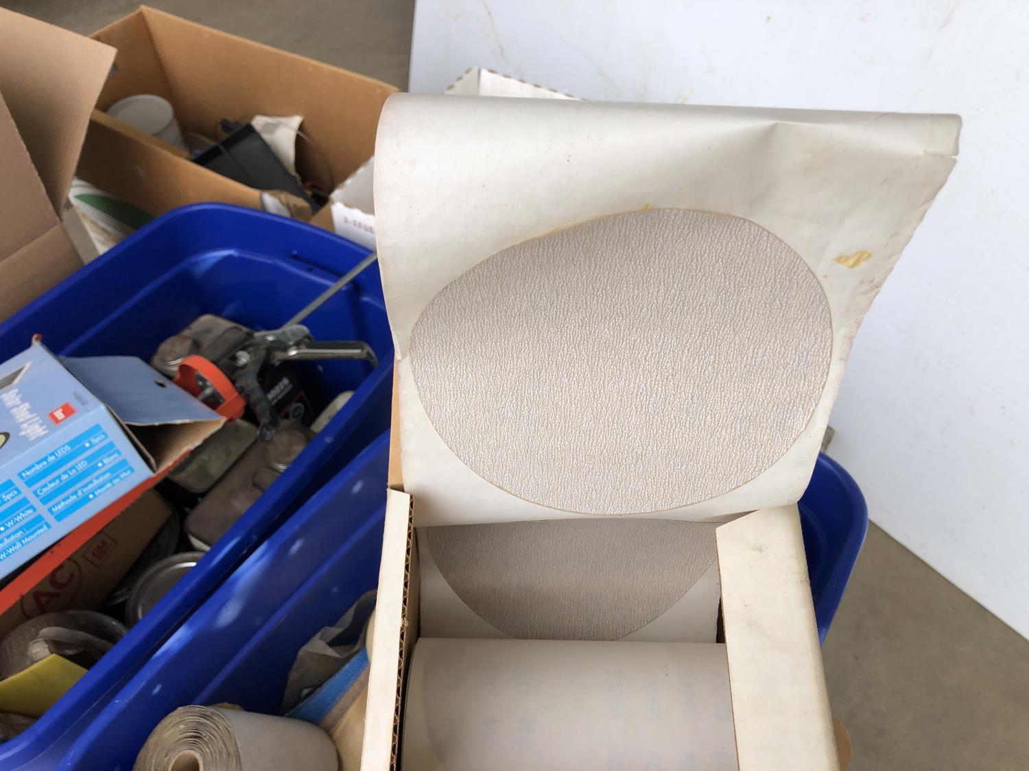 quantity of sandpaper, sanding discs, sand strips and sanding rolls, Scotch Brite pads, paint strainers, solar shed light, (4) pair unused utility casters, quantity of screws, small tool box & contents, quantity of bolt bins & trays, miscellaneous shop hardware and fluids