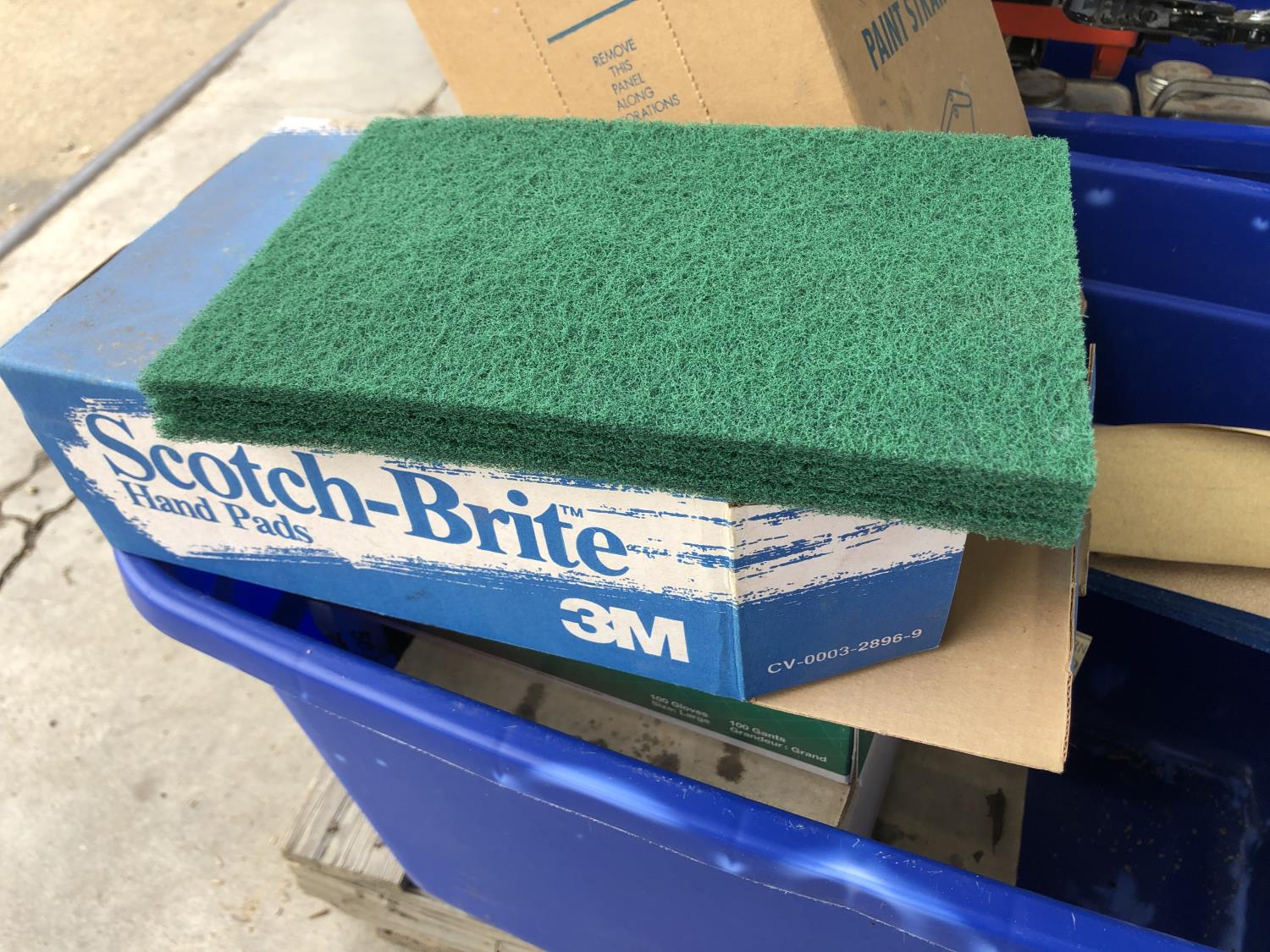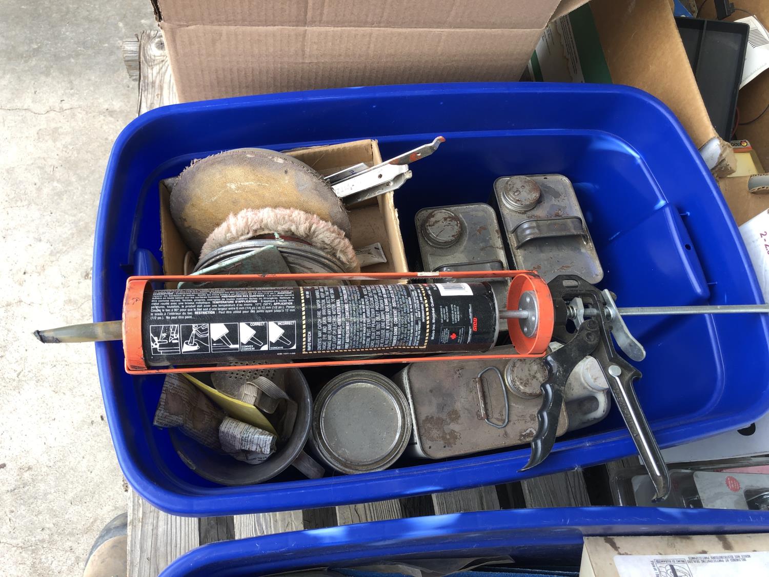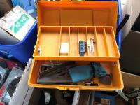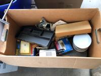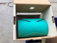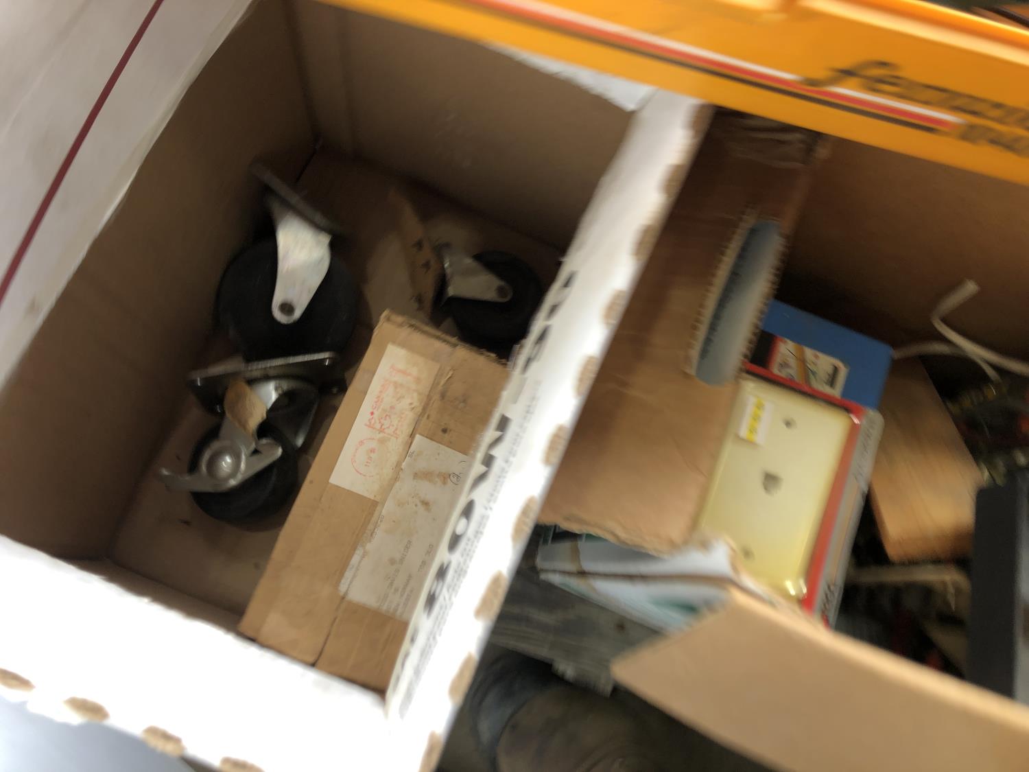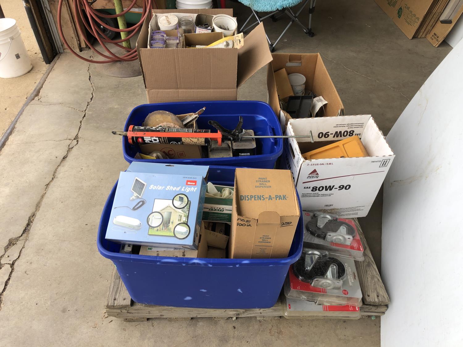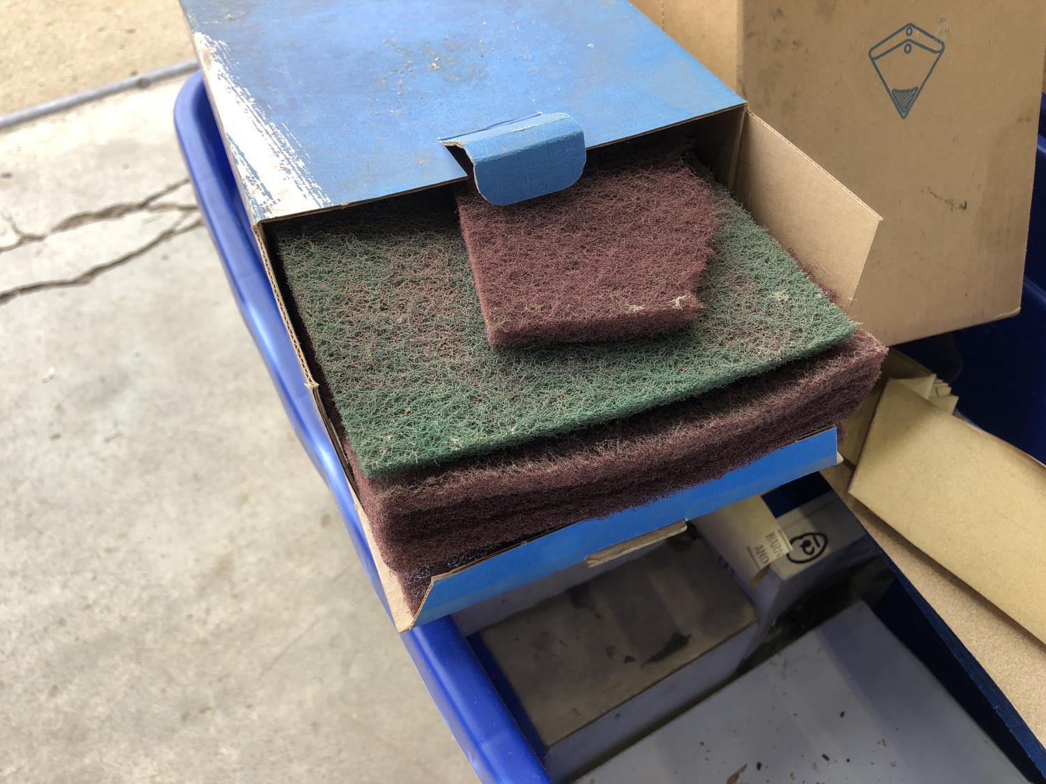 quantity of sandpaper, sanding discs, sand strips and sanding rolls, Scotch Brite pads, paint strainers, solar shed light, (4) pair unused utility casters, quantity of screws, small tool box & contents, quantity of bolt bins & trays, miscellaneous shop hardware and fluids