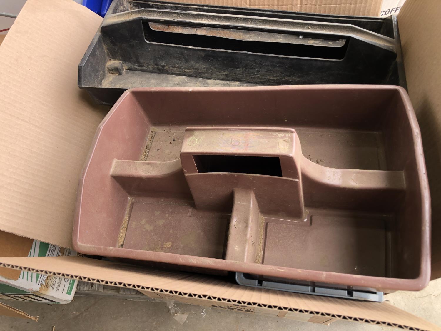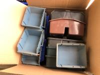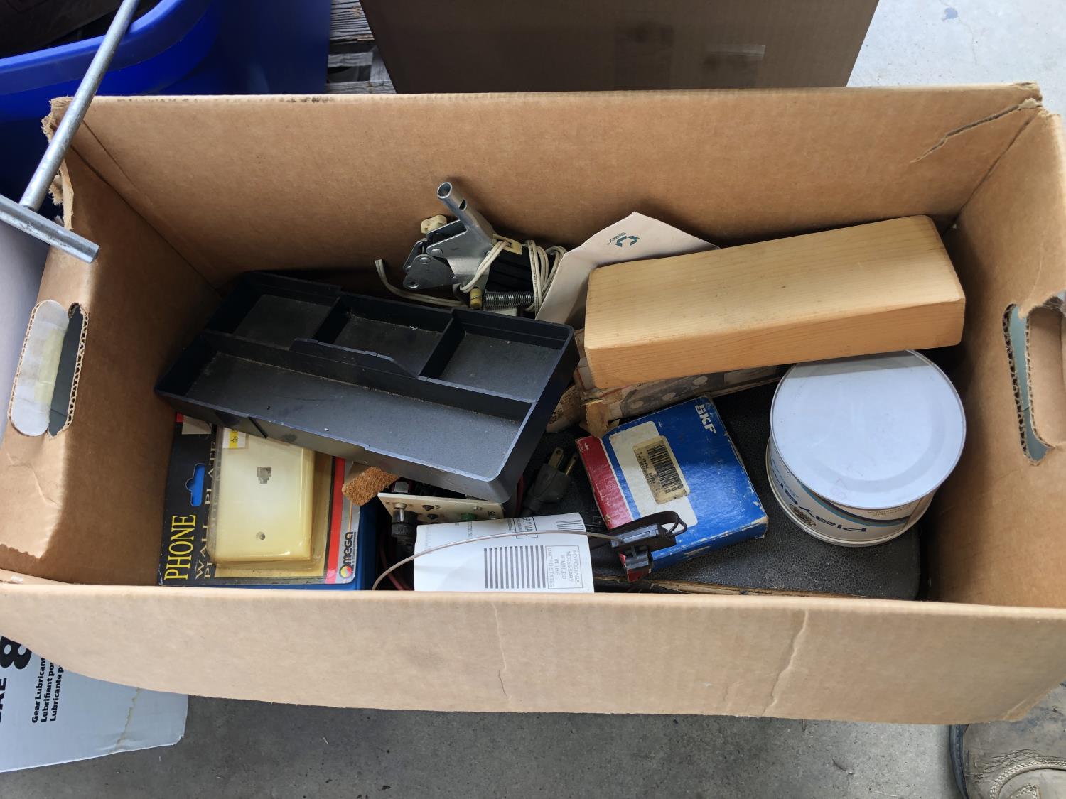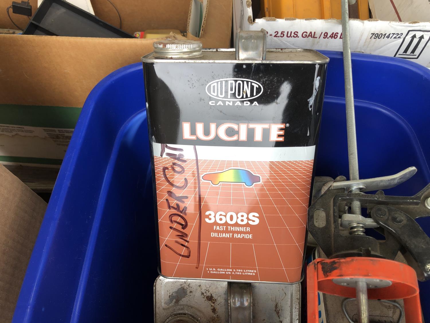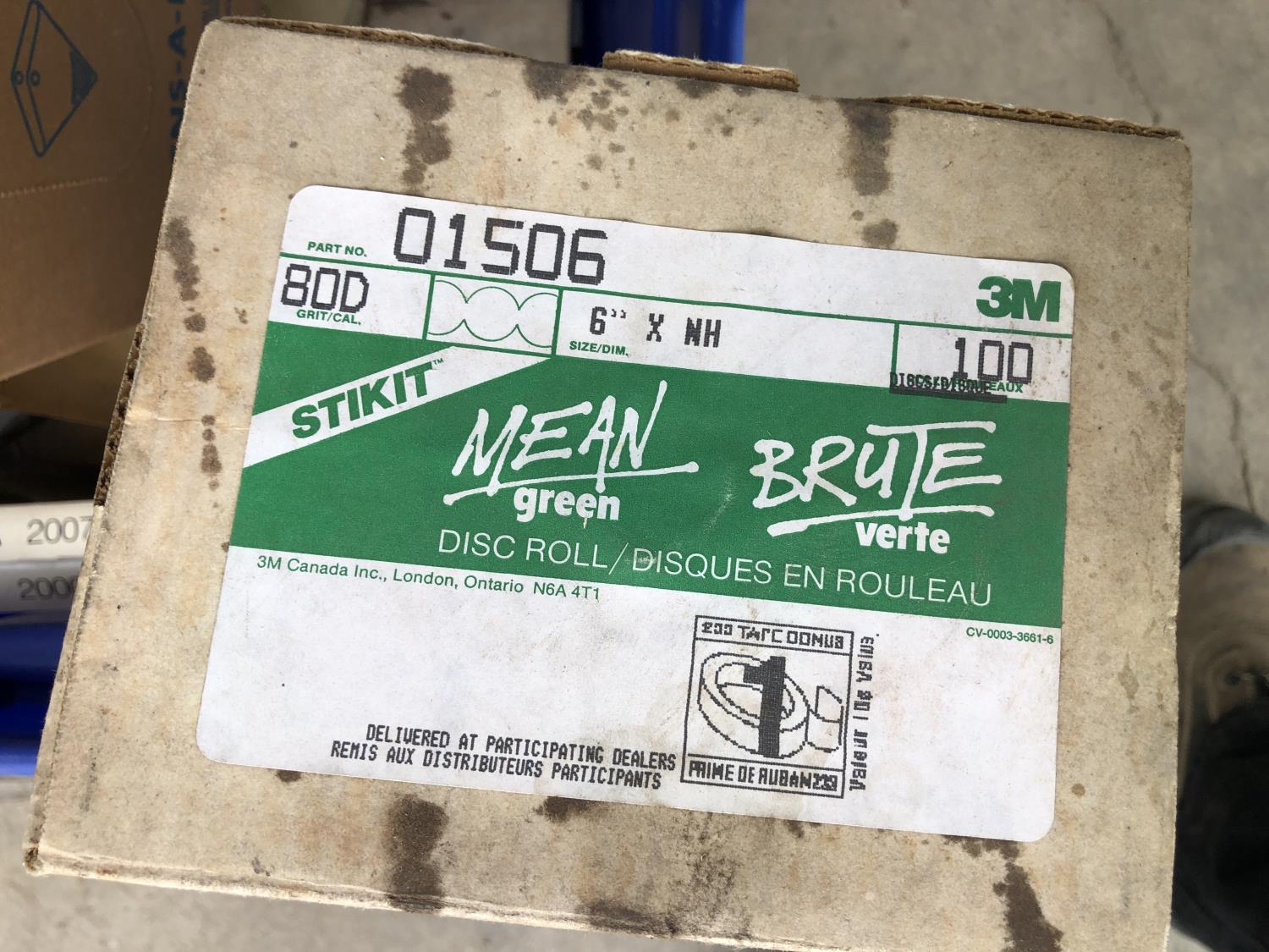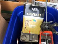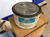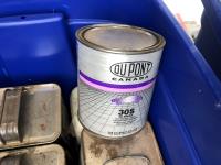 quantity of sandpaper, sanding discs, sand strips and sanding rolls, Scotch Brite pads, paint strainers, solar shed light, (4) pair unused utility casters, quantity of screws, small tool box & contents, quantity of bolt bins & trays, miscellaneous shop hardware and fluids