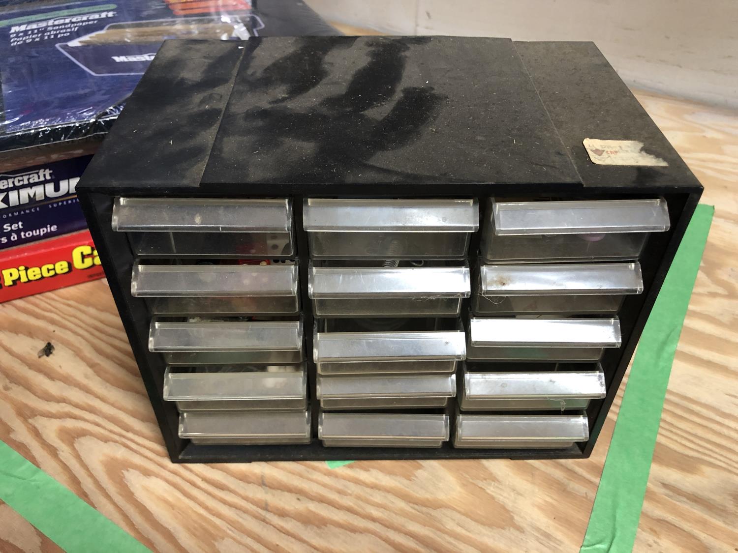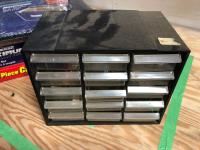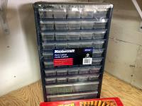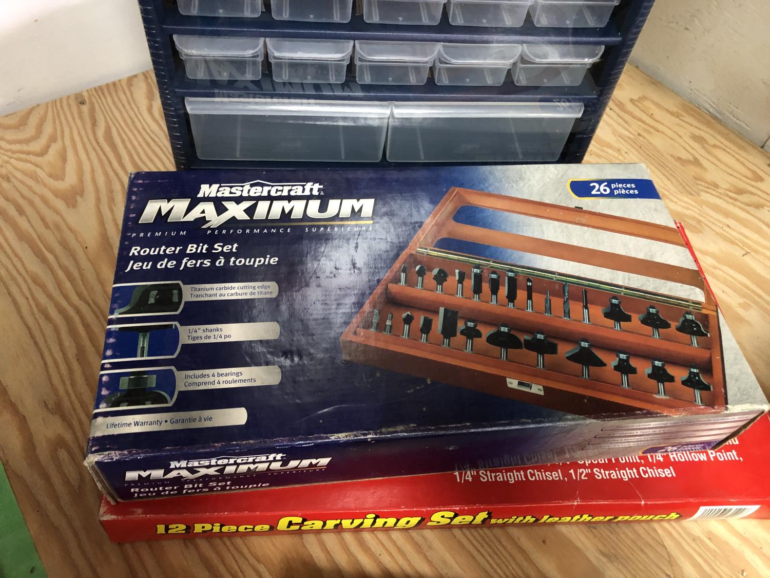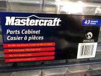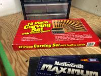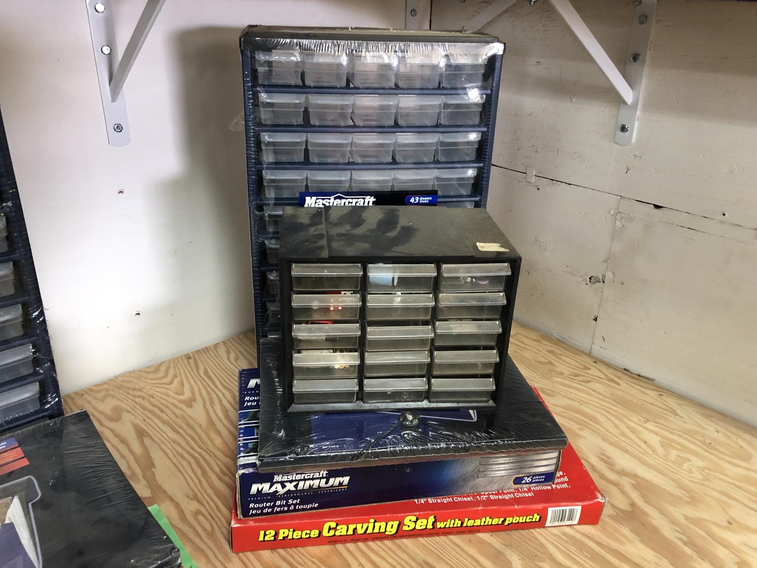 15 compartment storage case 10 X 6 X 7-1/2 Inch & contents, Mastercraft 9 x 11 inch sandpaper 50 sheets assorted grits in folder (unused), 26 piece router bit set (unused), 12 piece carving set with leather pouch (unused), 43 compartment parts cabinet (unused)