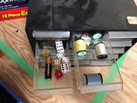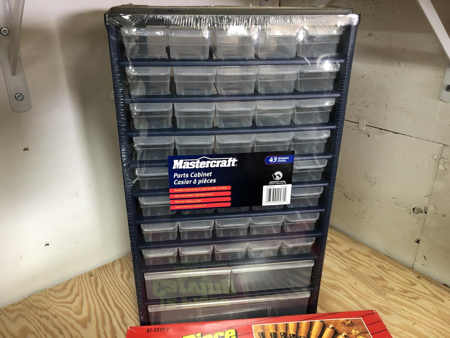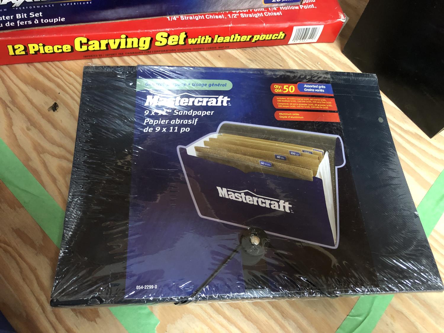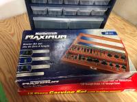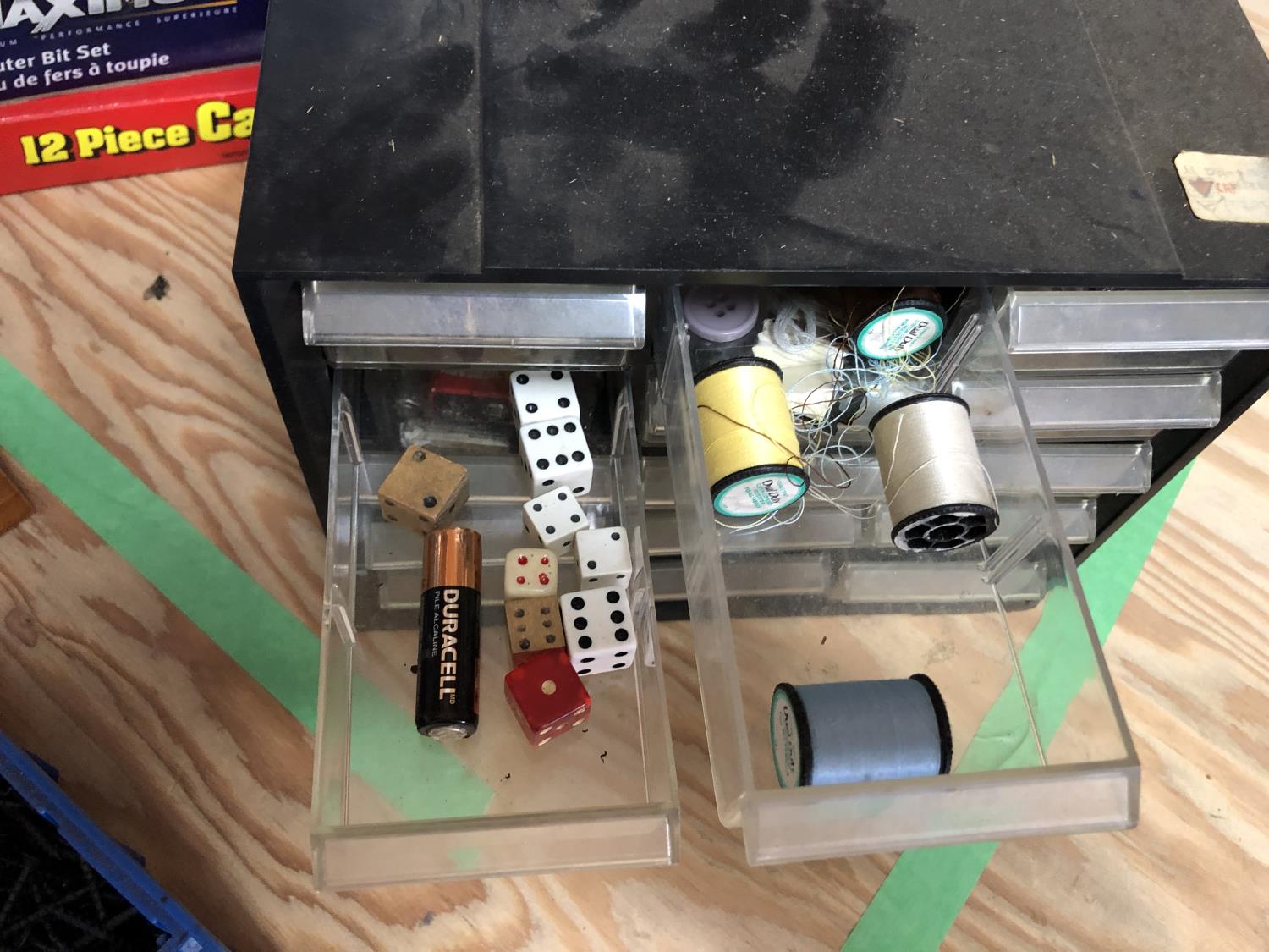 15 compartment storage case 10 X 6 X 7-1/2 Inch & contents, Mastercraft 9 x 11 inch sandpaper 50 sheets assorted grits in folder (unused), 26 piece router bit set (unused), 12 piece carving set with leather pouch (unused), 43 compartment parts cabinet (unused)