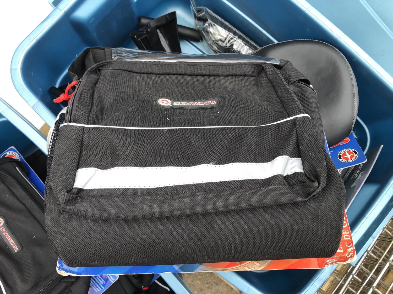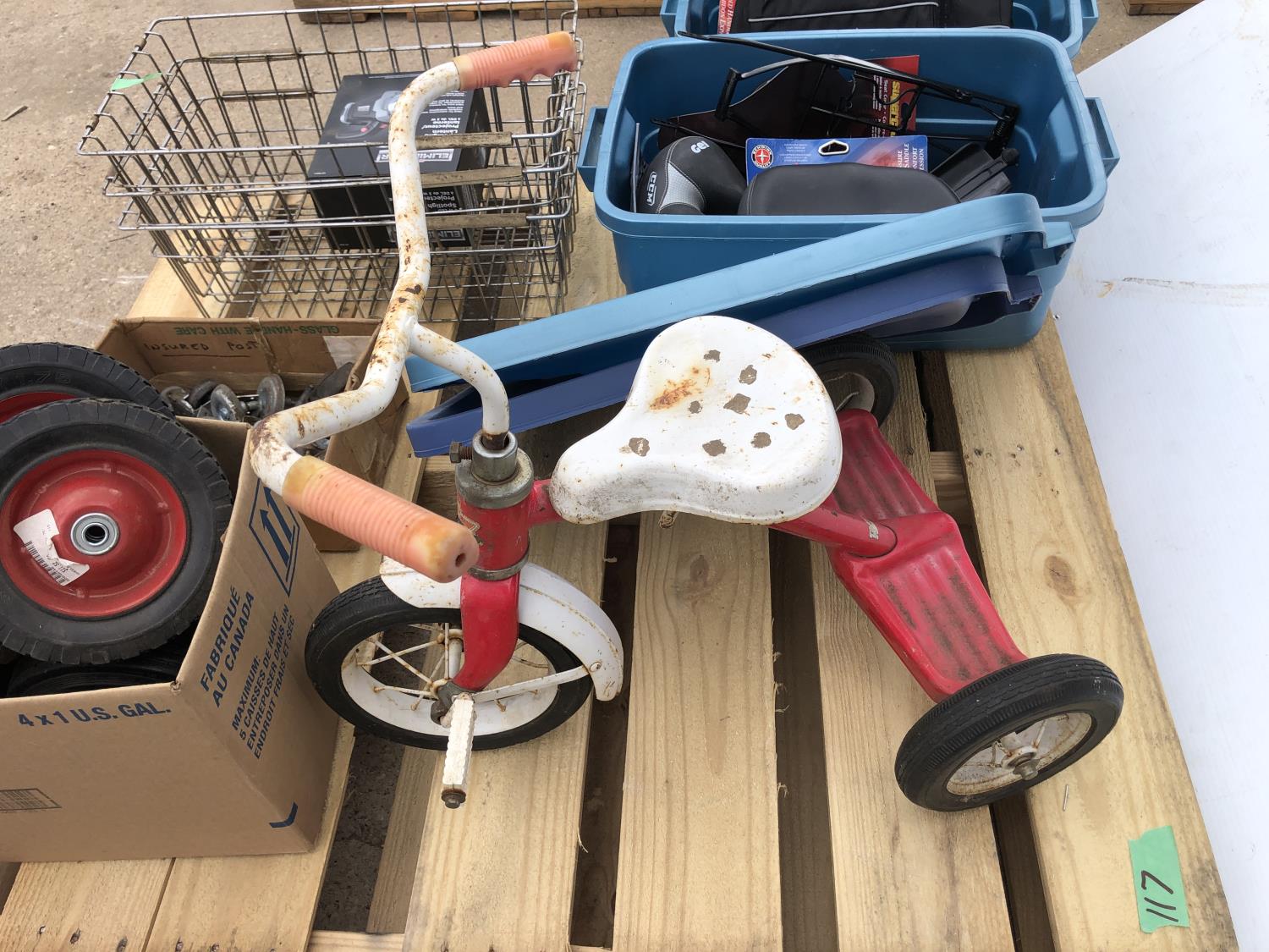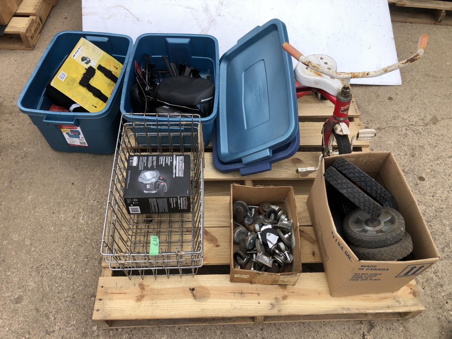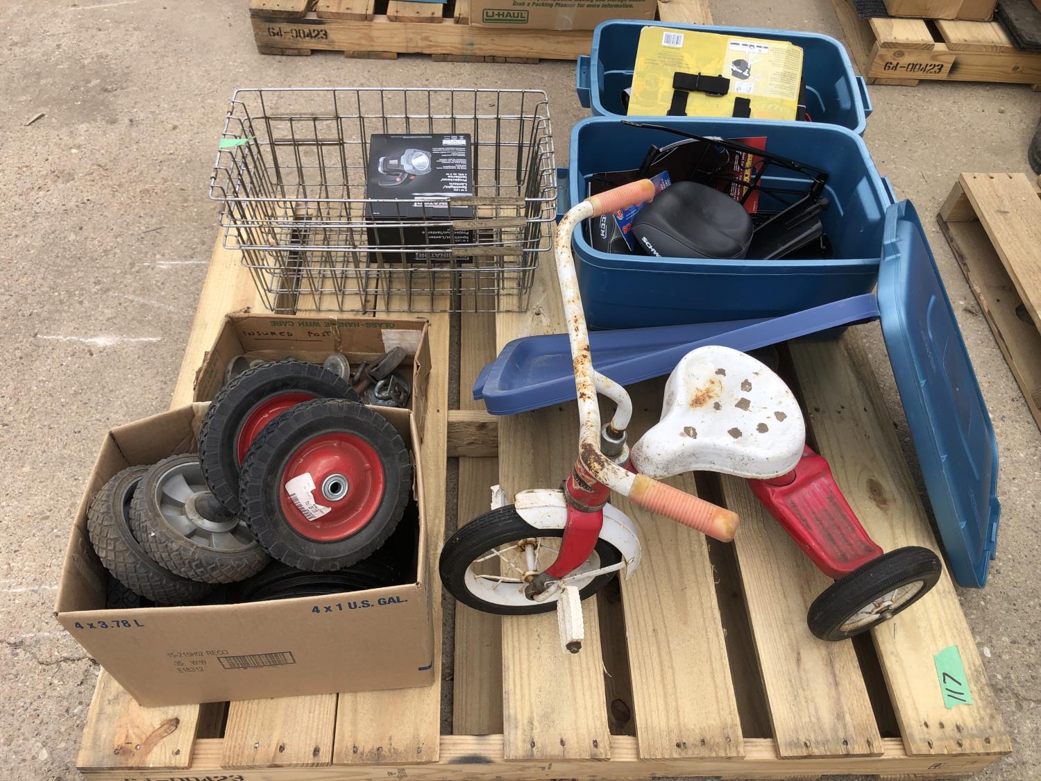 3W LED spotlight, quantity of various size dolly wheels, (11) various size wheels, child's size tri-cycle, (5) Schwinn handlebar bags (unused), (2) blue seats (unused), (2) bike racks and mod-guards (unused)