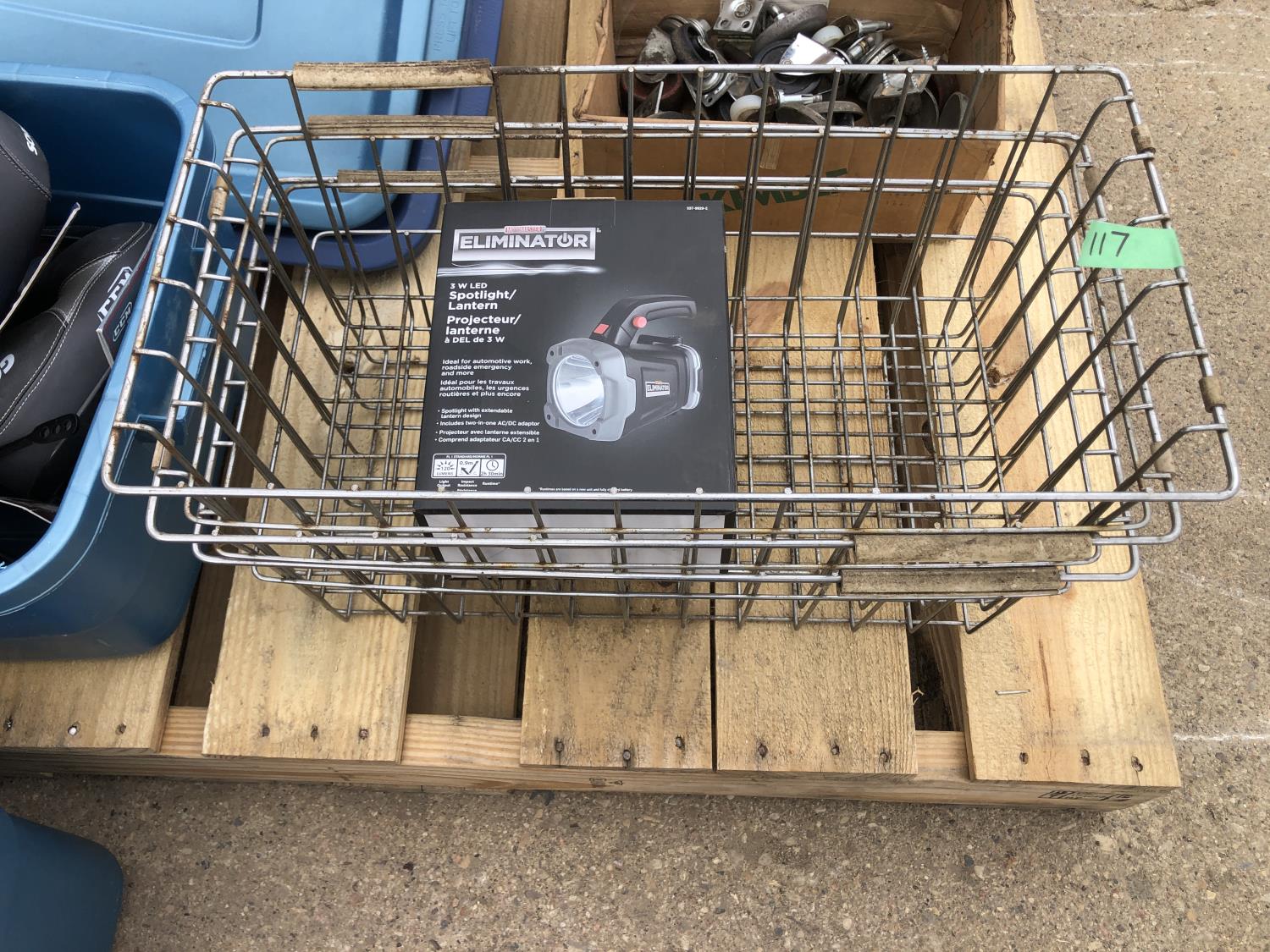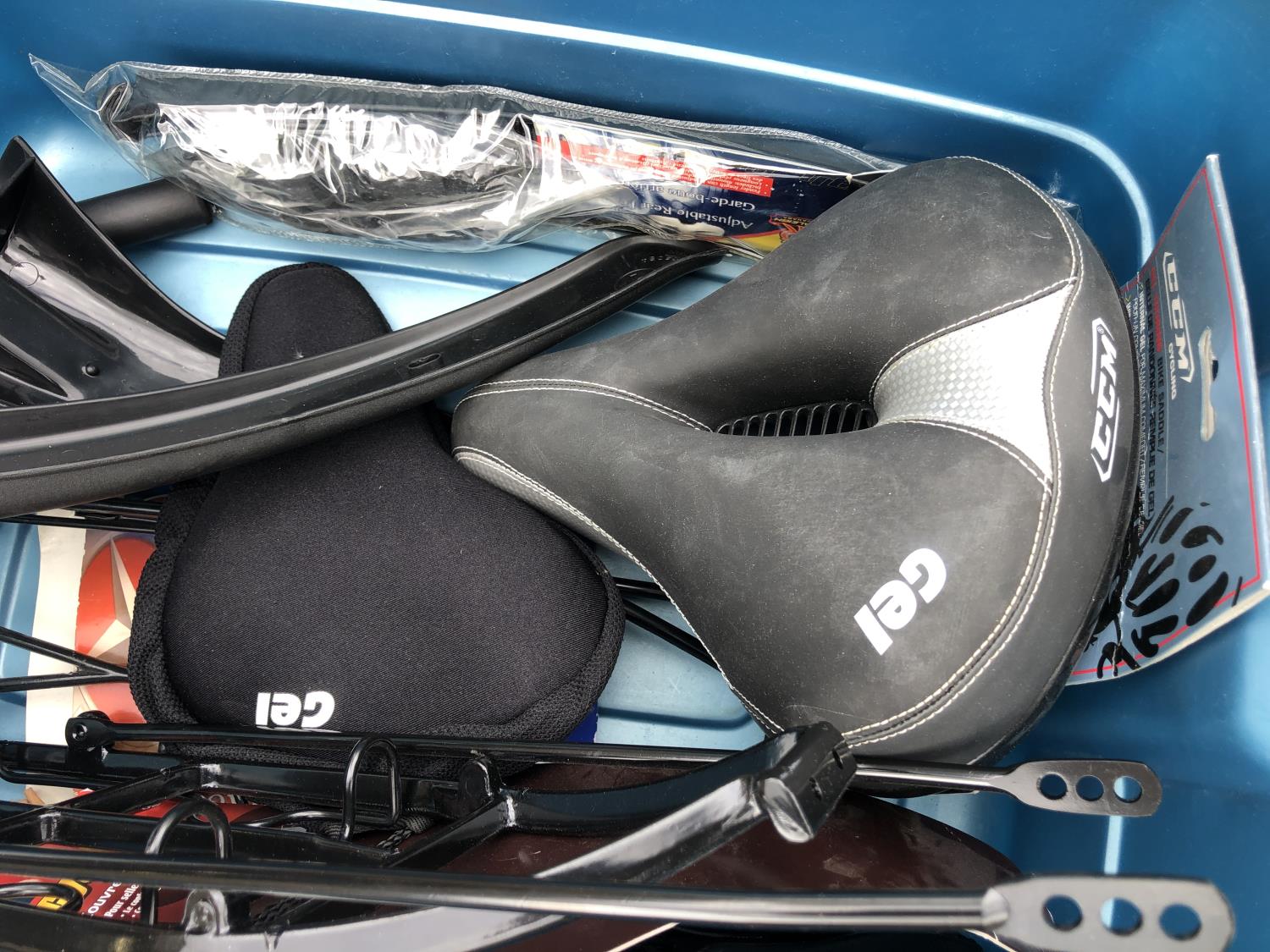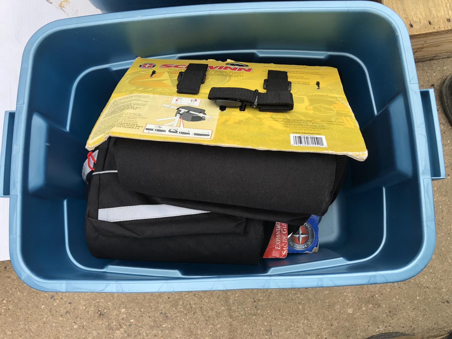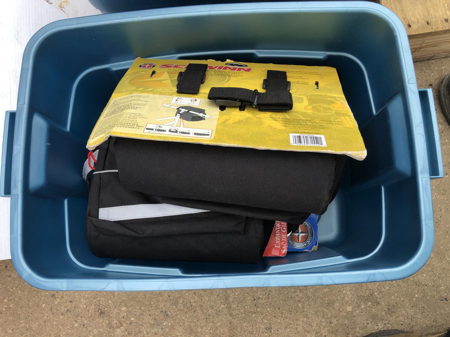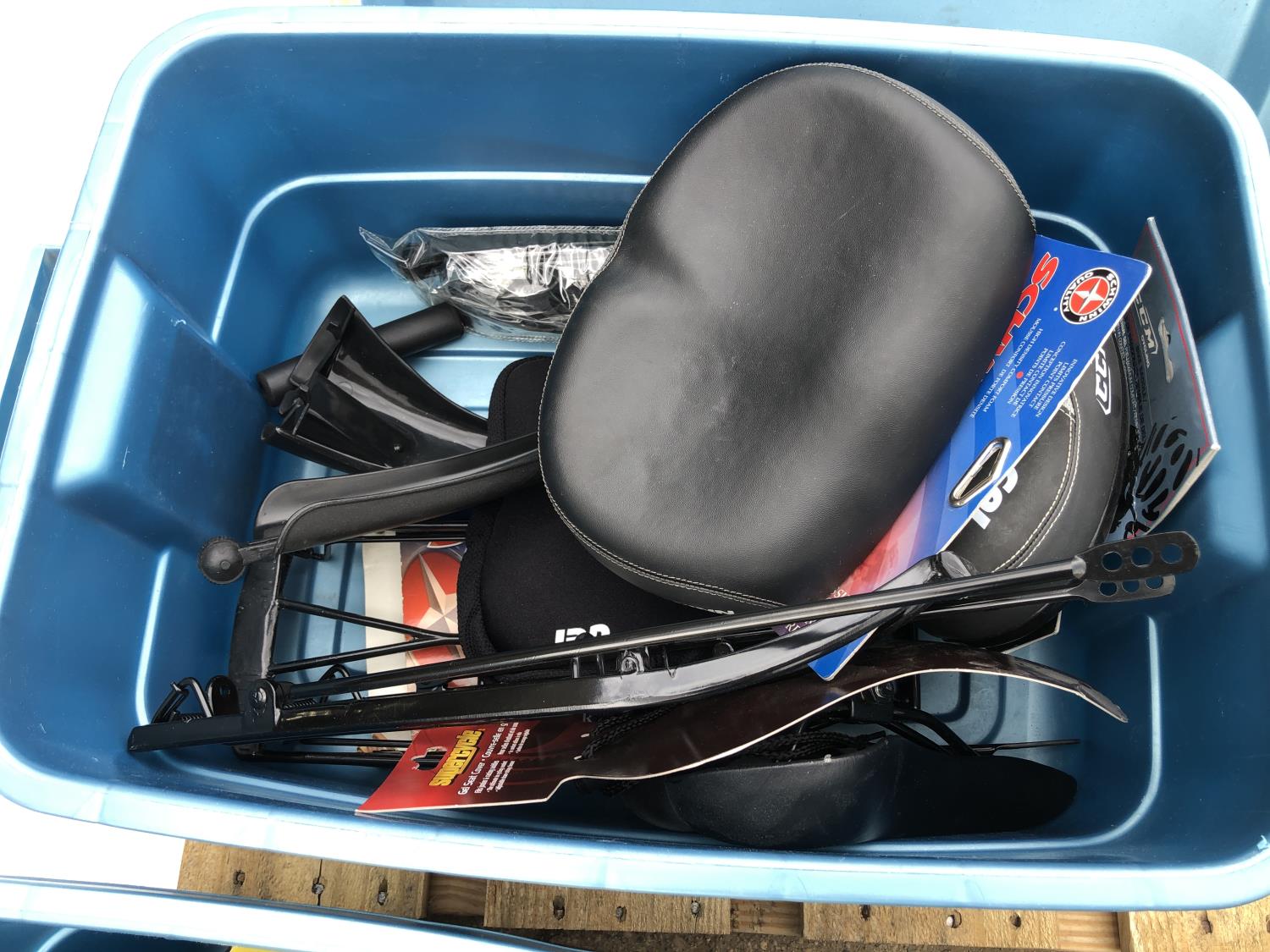 3W LED spotlight, quantity of various size dolly wheels, (11) various size wheels, child's size tri-cycle, (5) Schwinn handlebar bags (unused), (2) blue seats (unused), (2) bike racks and mod-guards (unused)