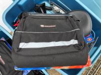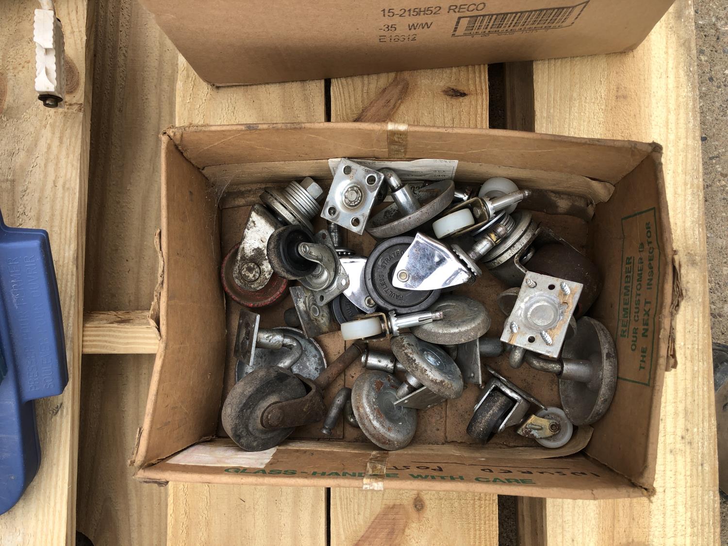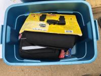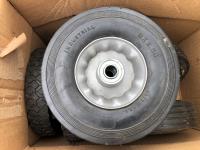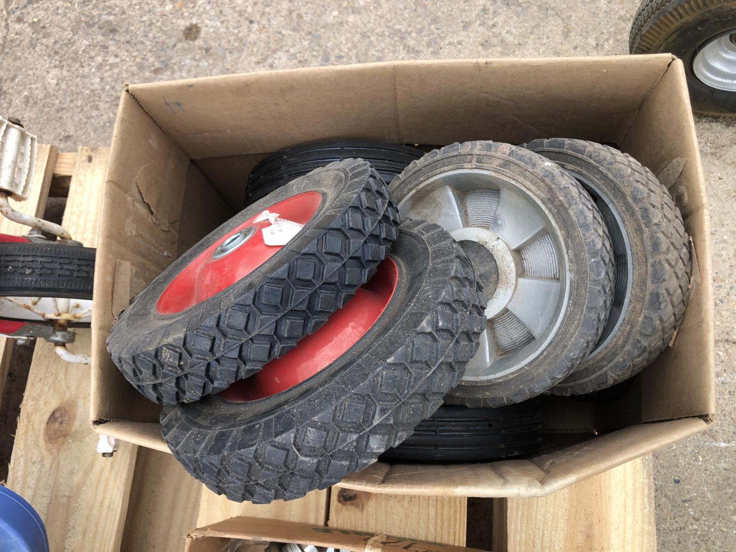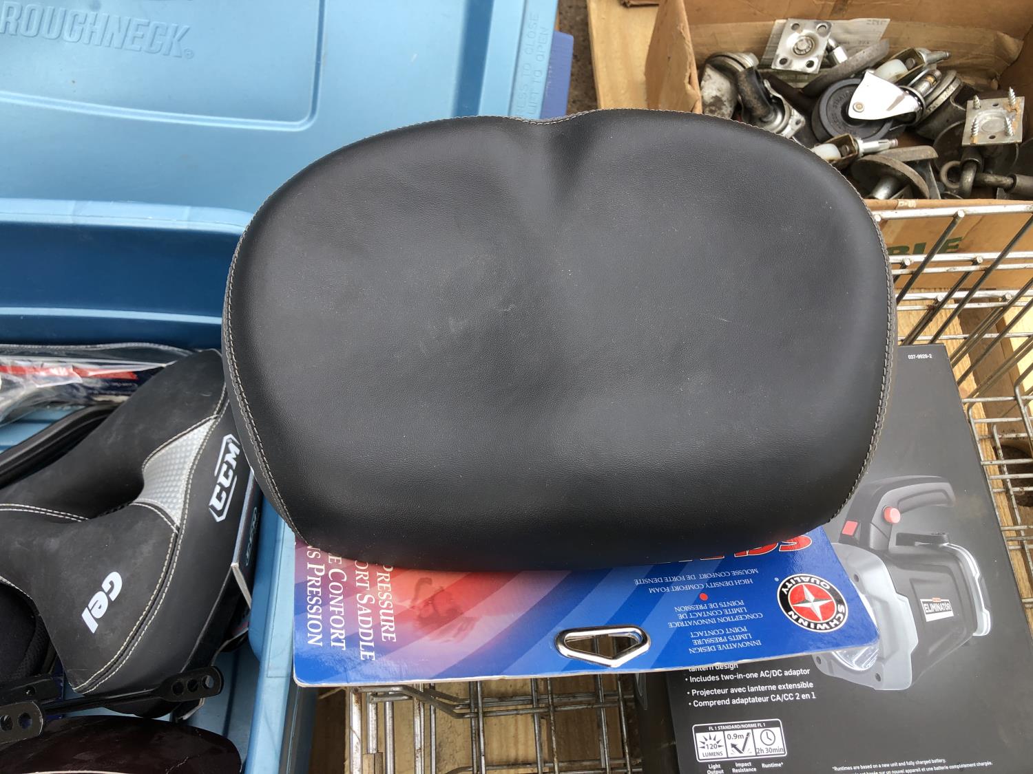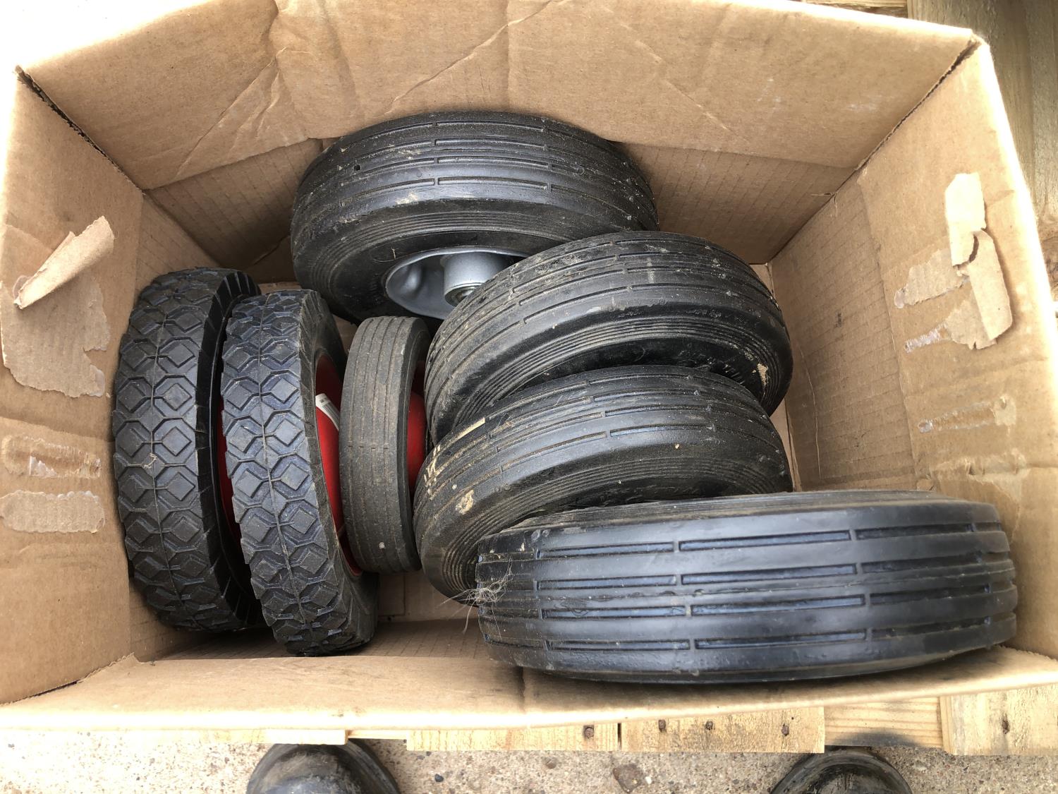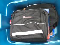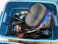 3W LED spotlight, quantity of various size dolly wheels, (11) various size wheels, child's size tri-cycle, (5) Schwinn handlebar bags (unused), (2) blue seats (unused), (2) bike racks and mod-guards (unused)
