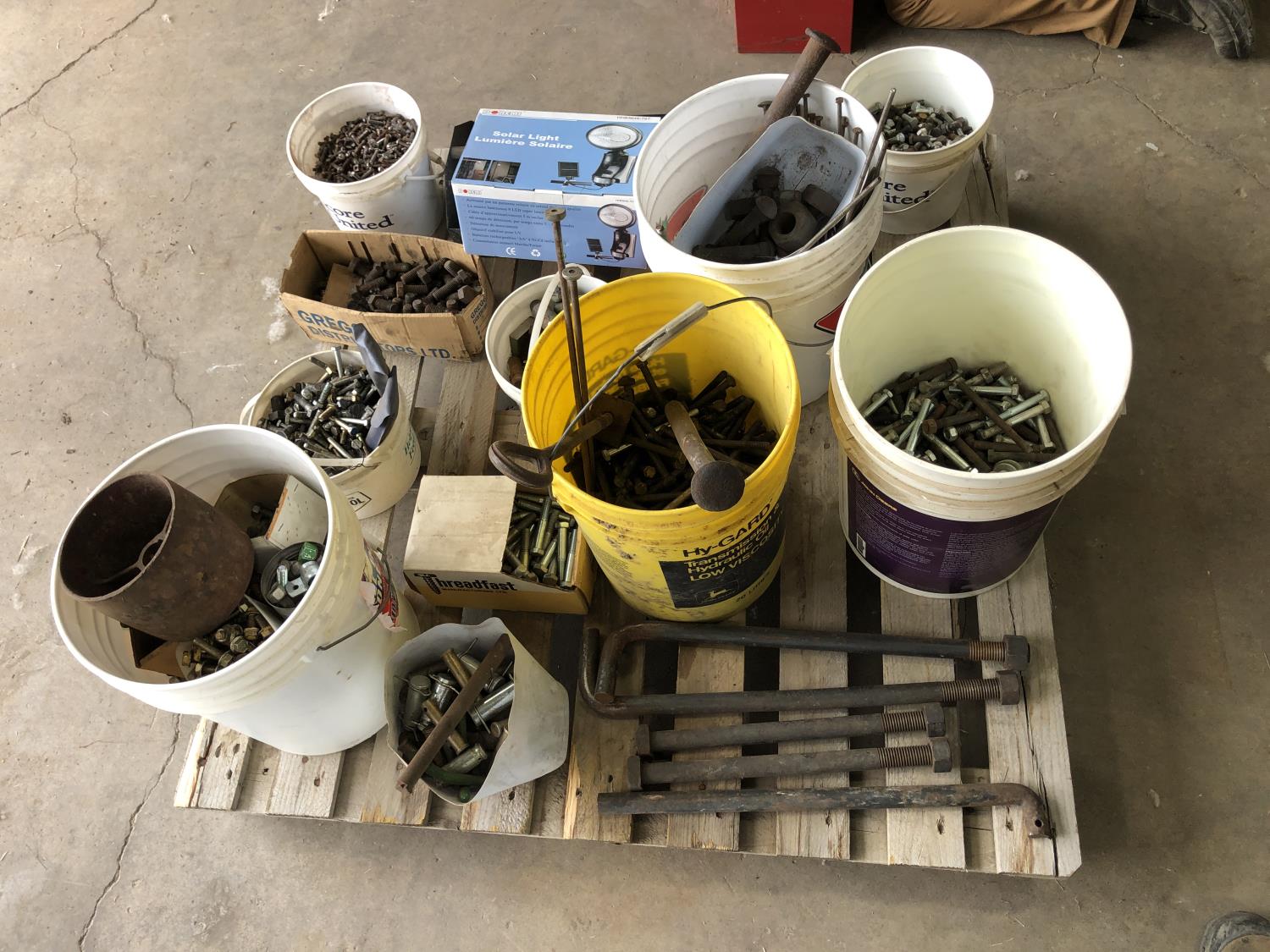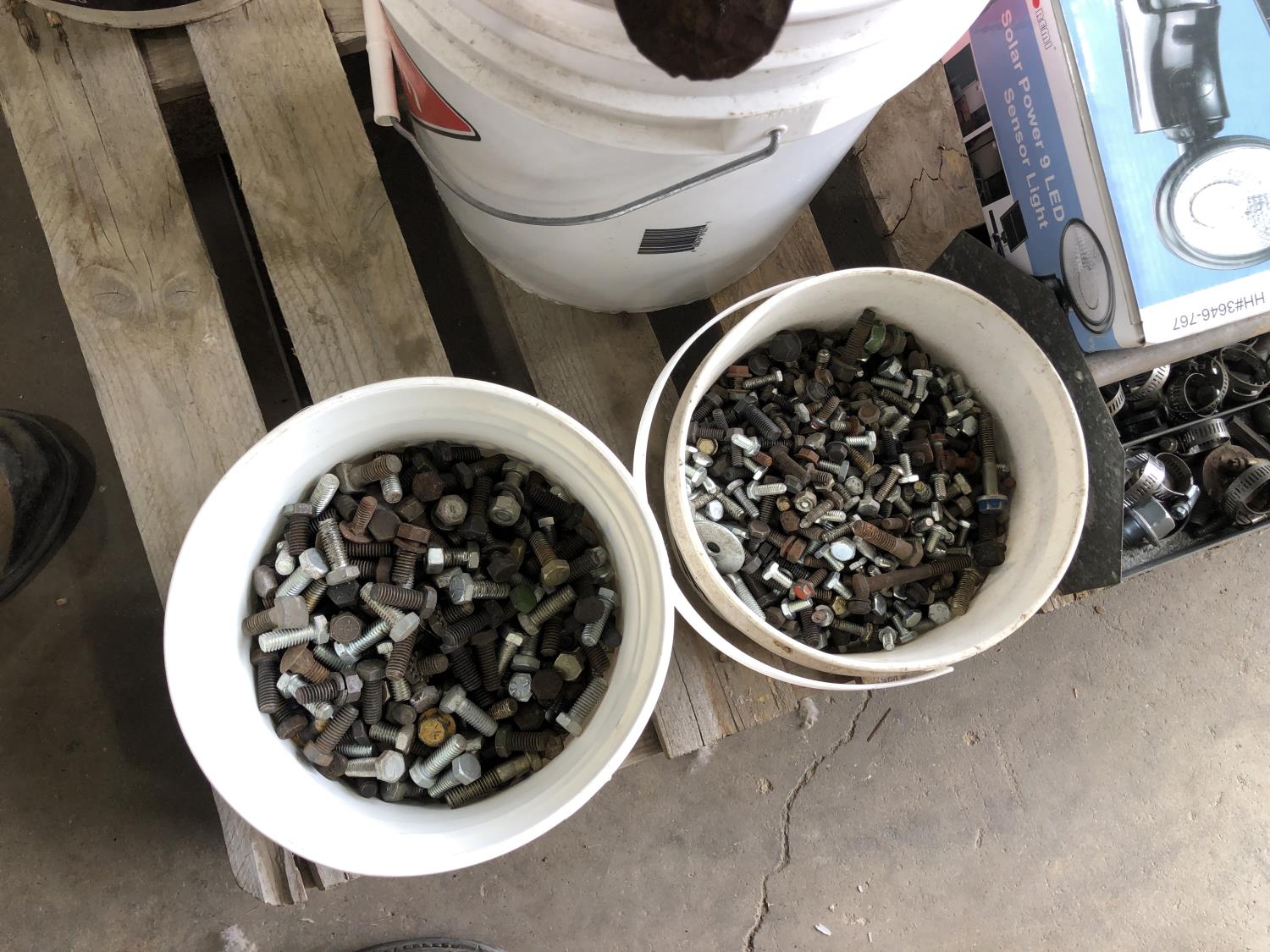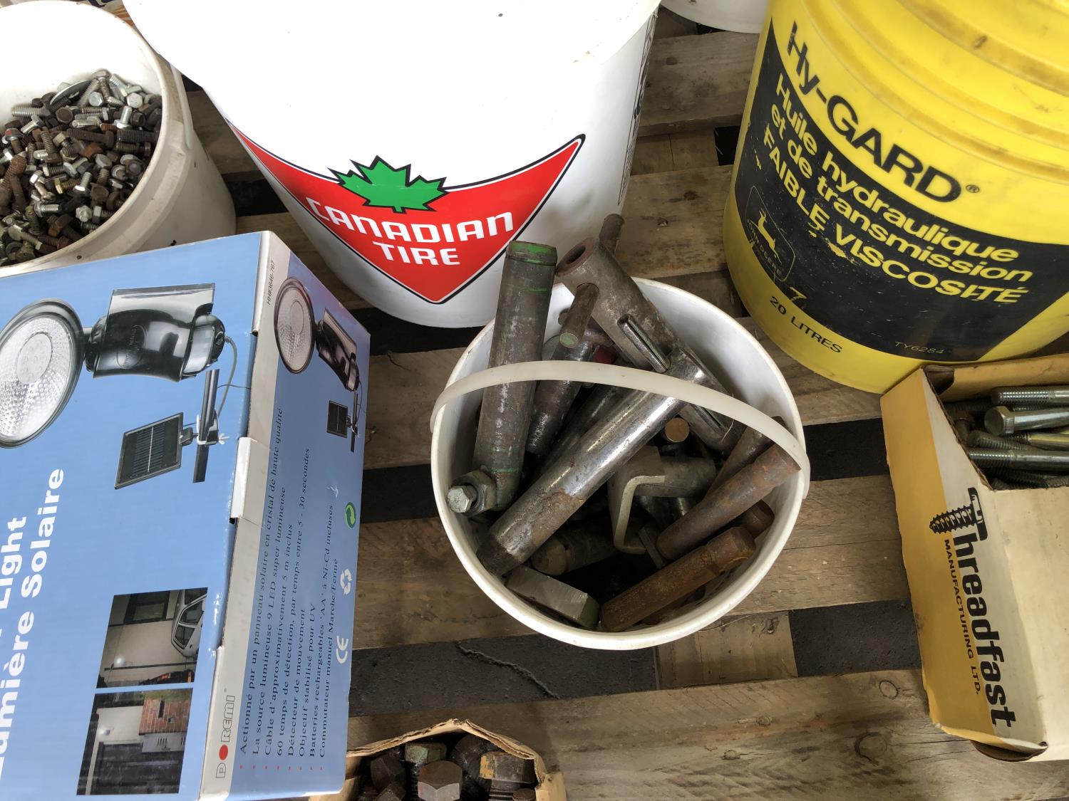 nuts, bolts, various size pins, hose clamps, solar light