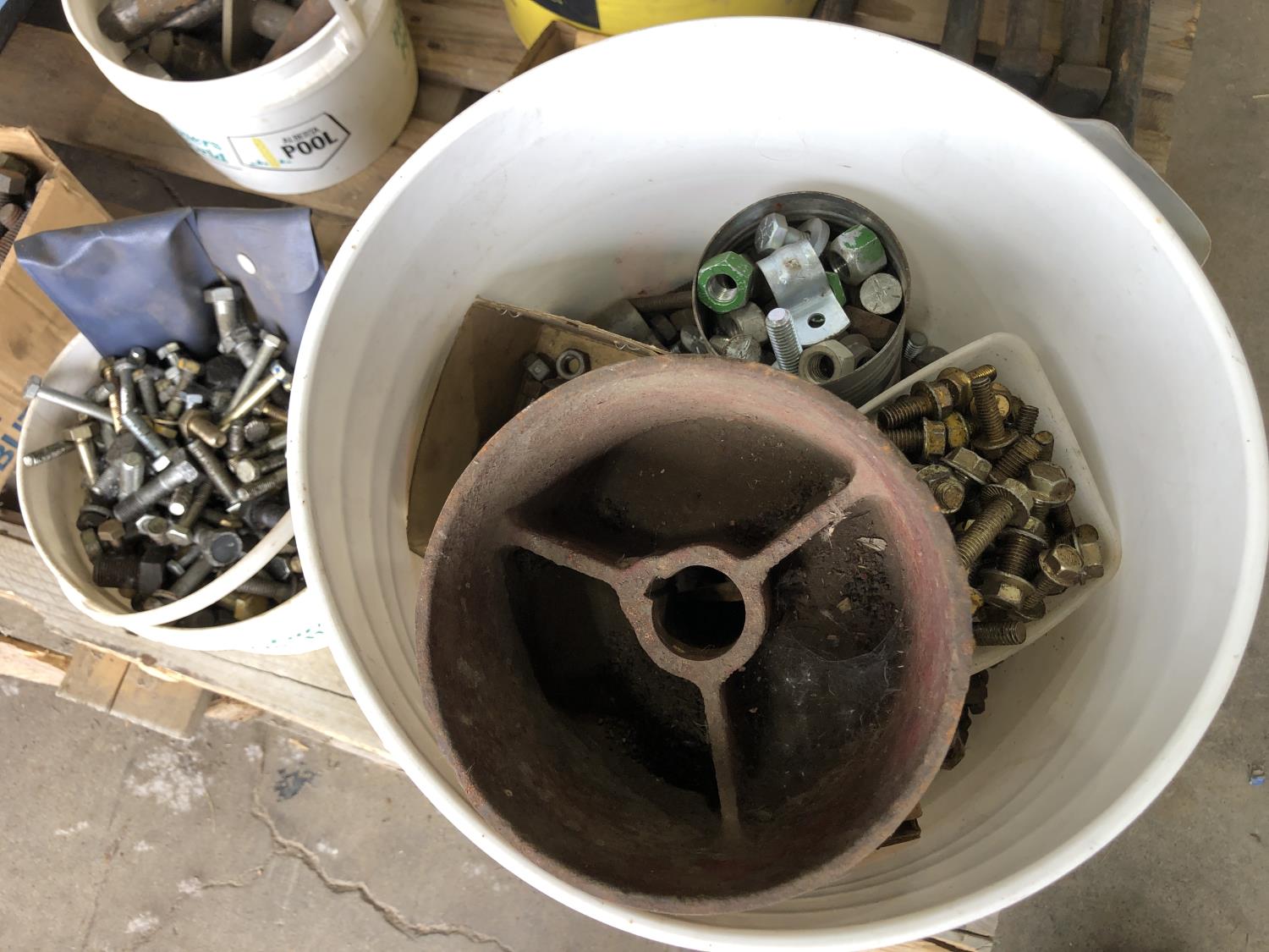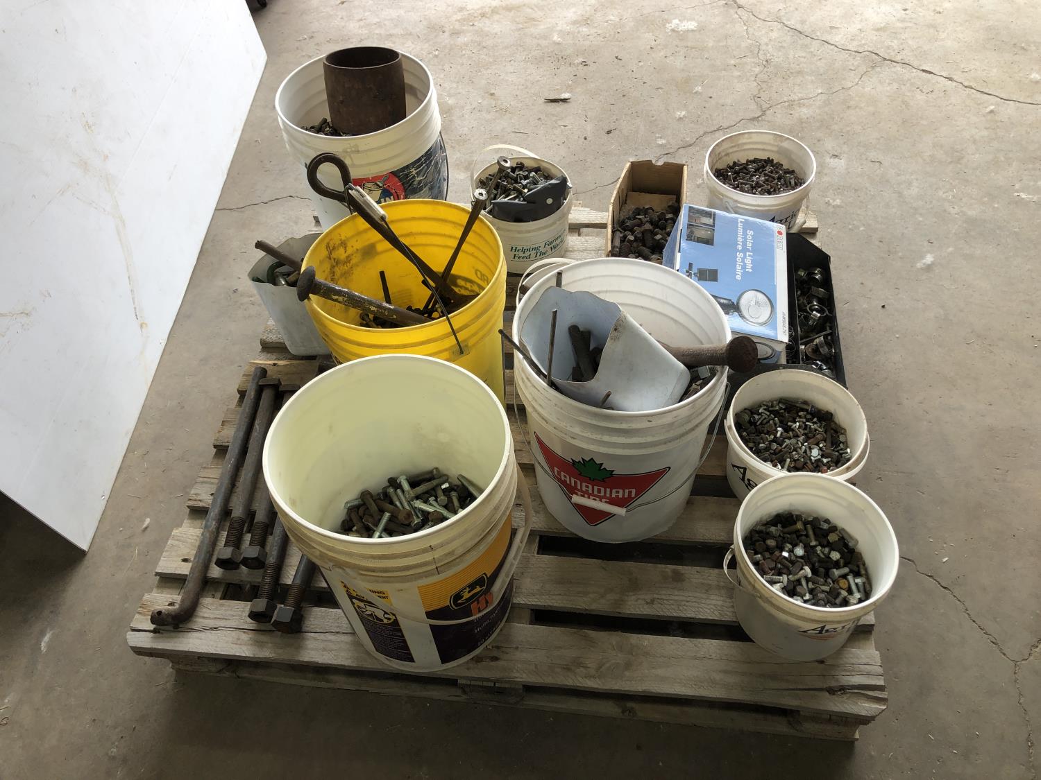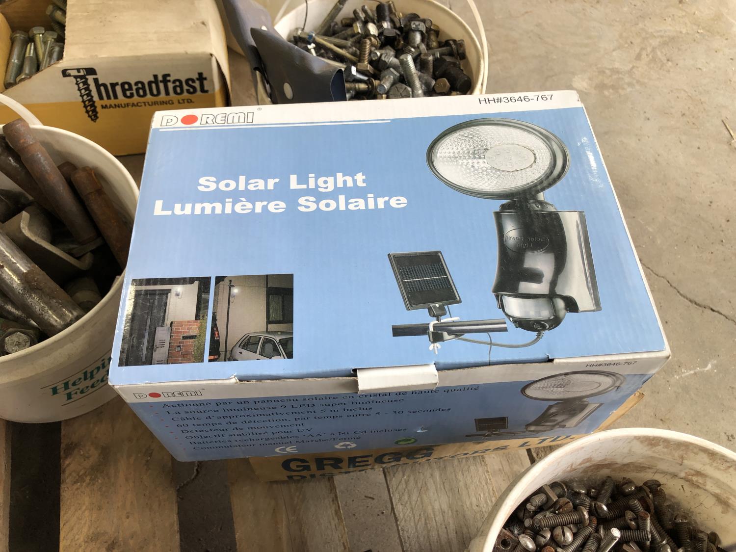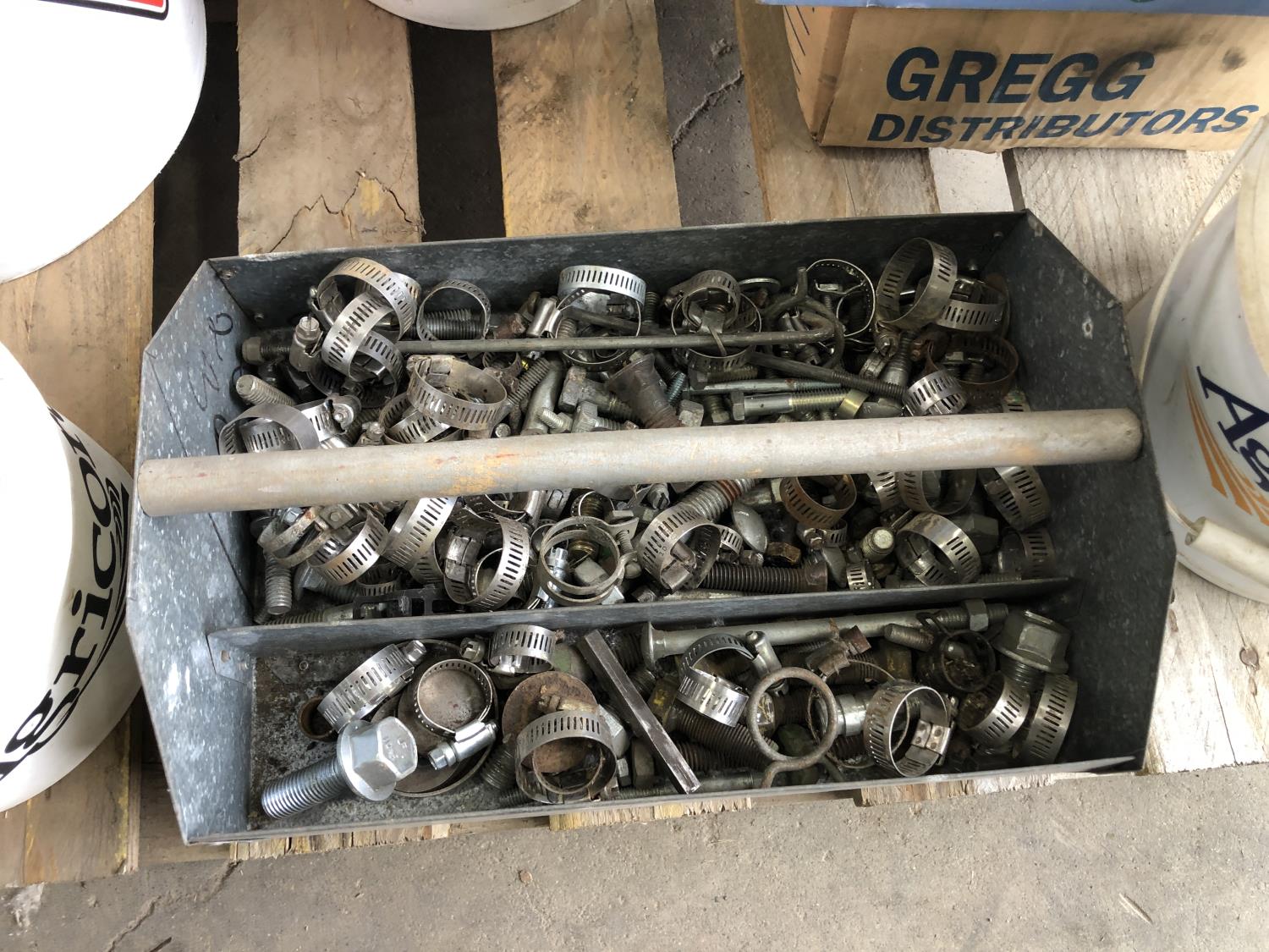 nuts, bolts, various size pins, hose clamps, solar light