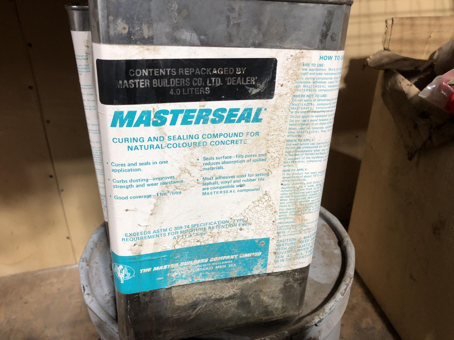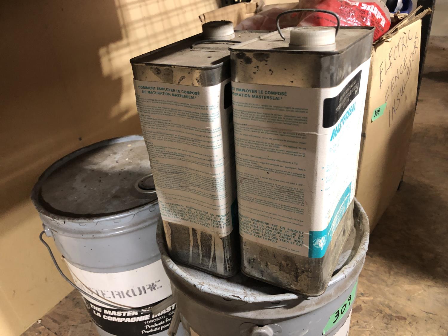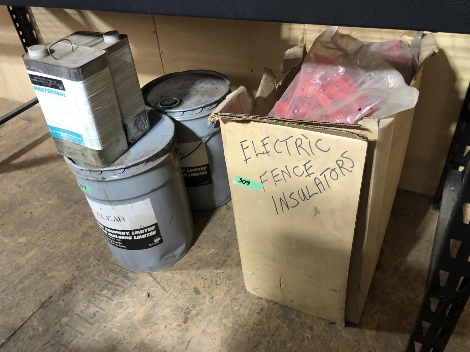 quantity of Red Snapper electric fence insulators, (2) 4 L of Masterssal curing and sealing compound, (2) keg Masterkobe clear (part used)