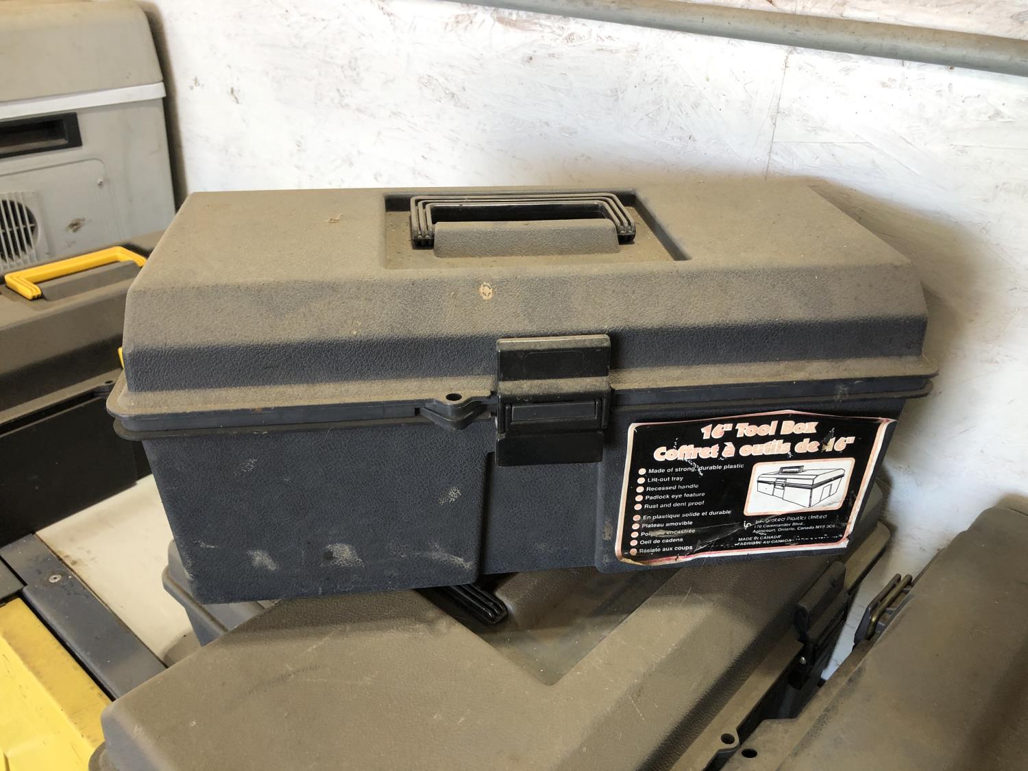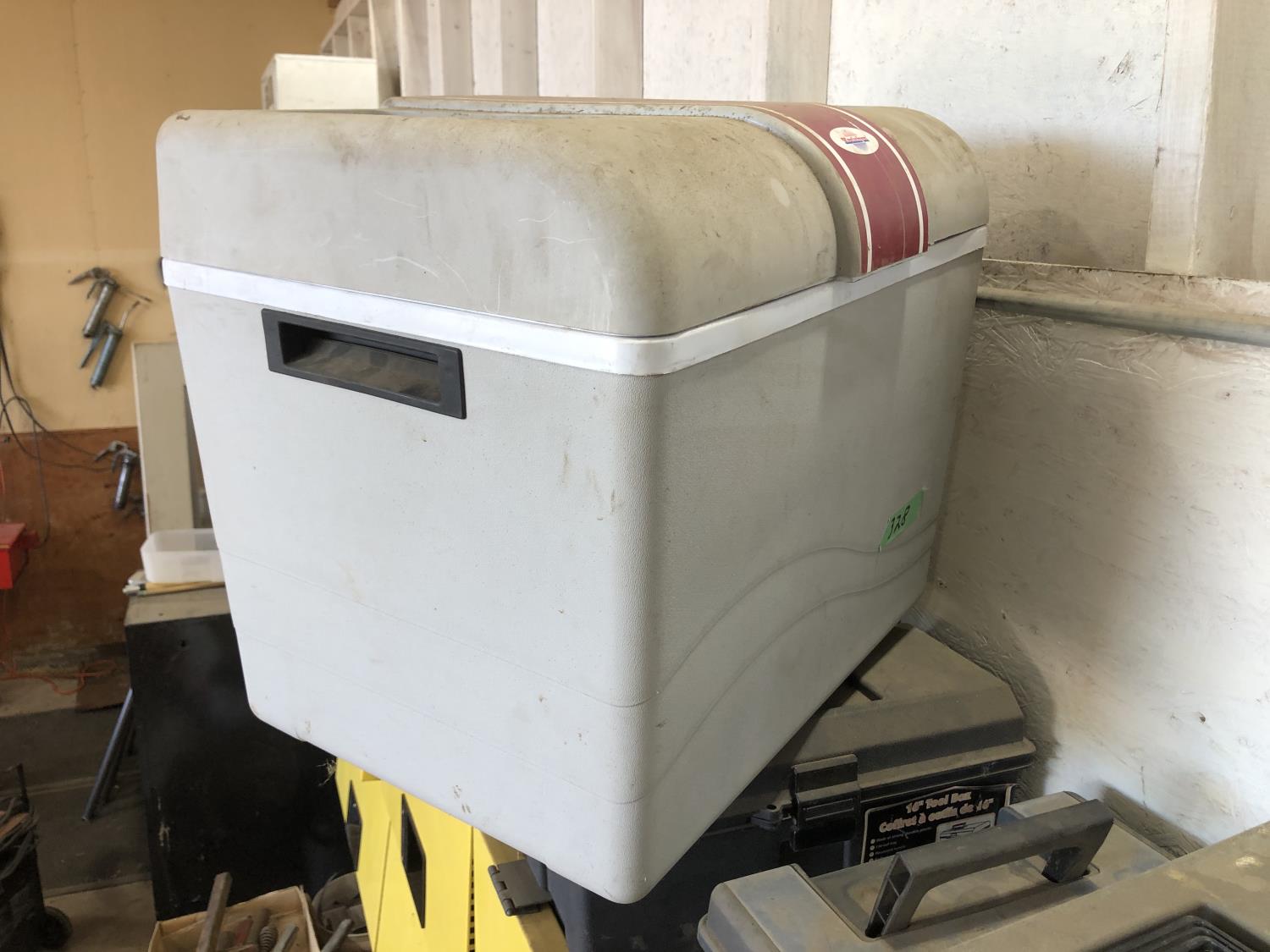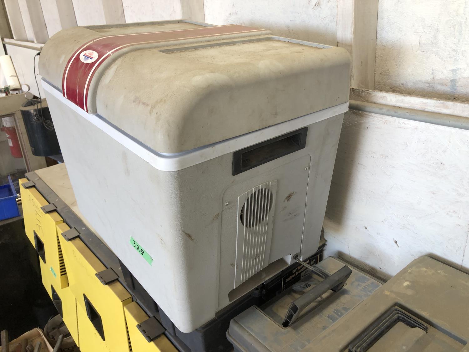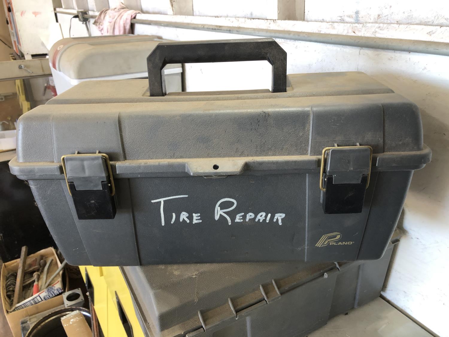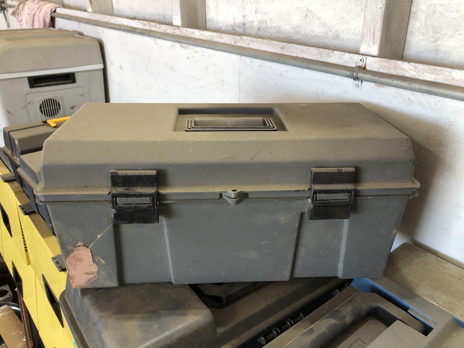 electric cooler (no cord), (7) empty tool boxes, tire repair kit, quantity of electric fence insulators