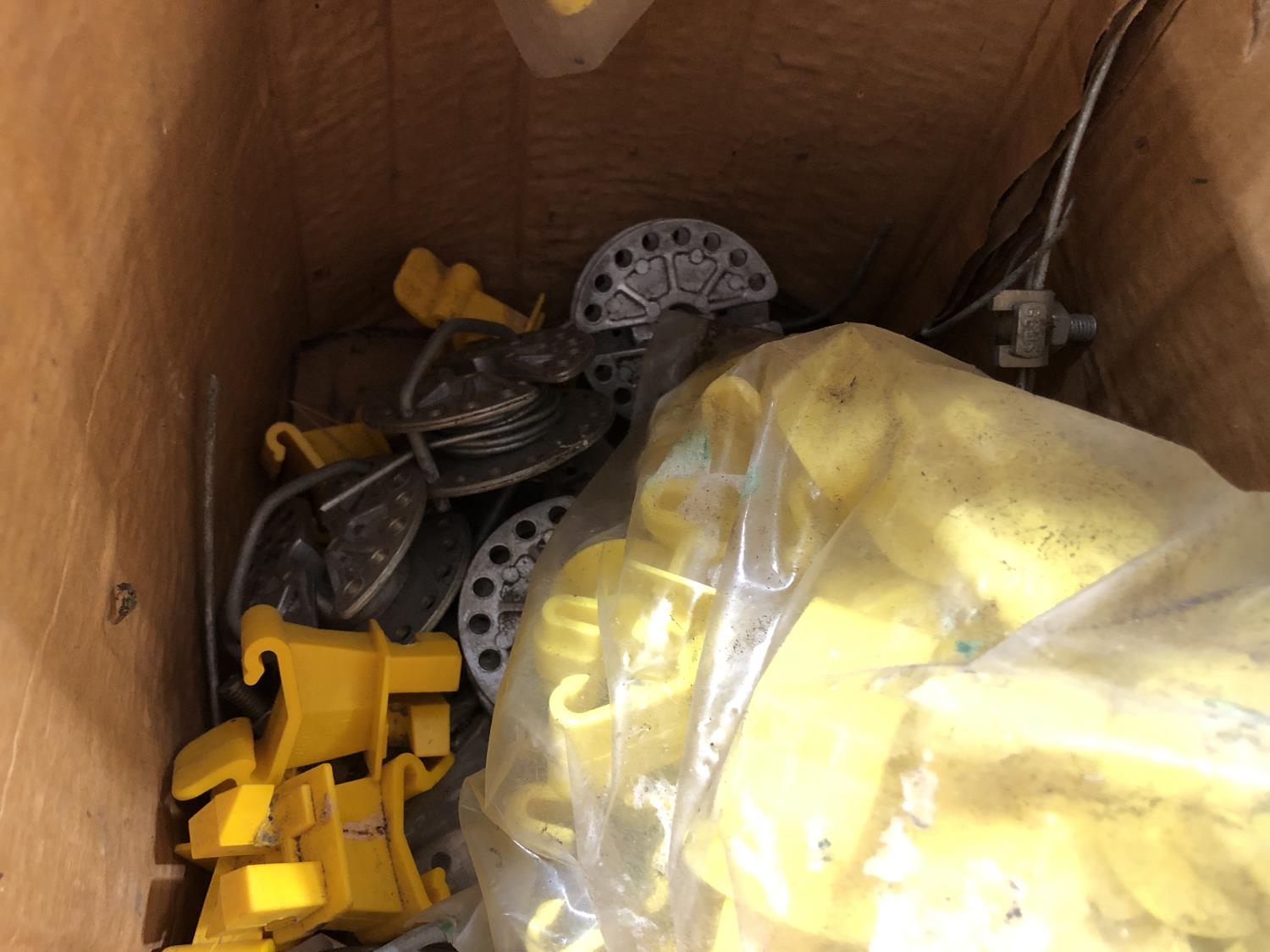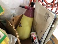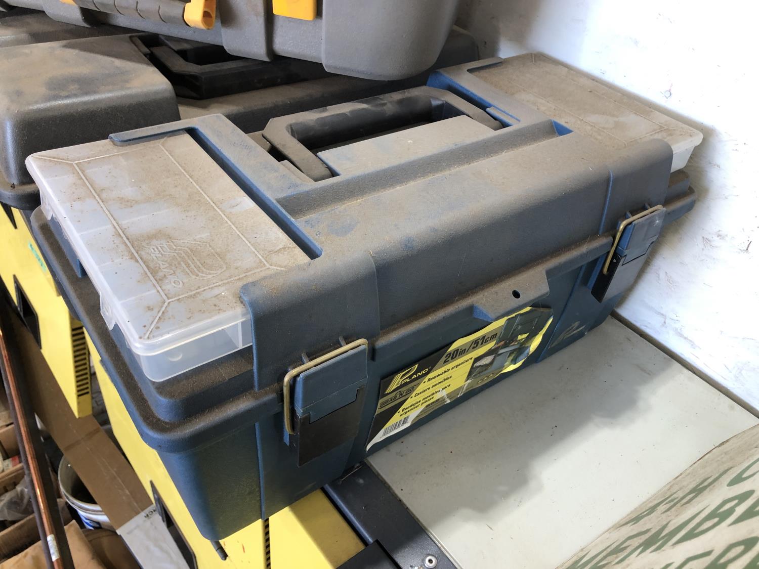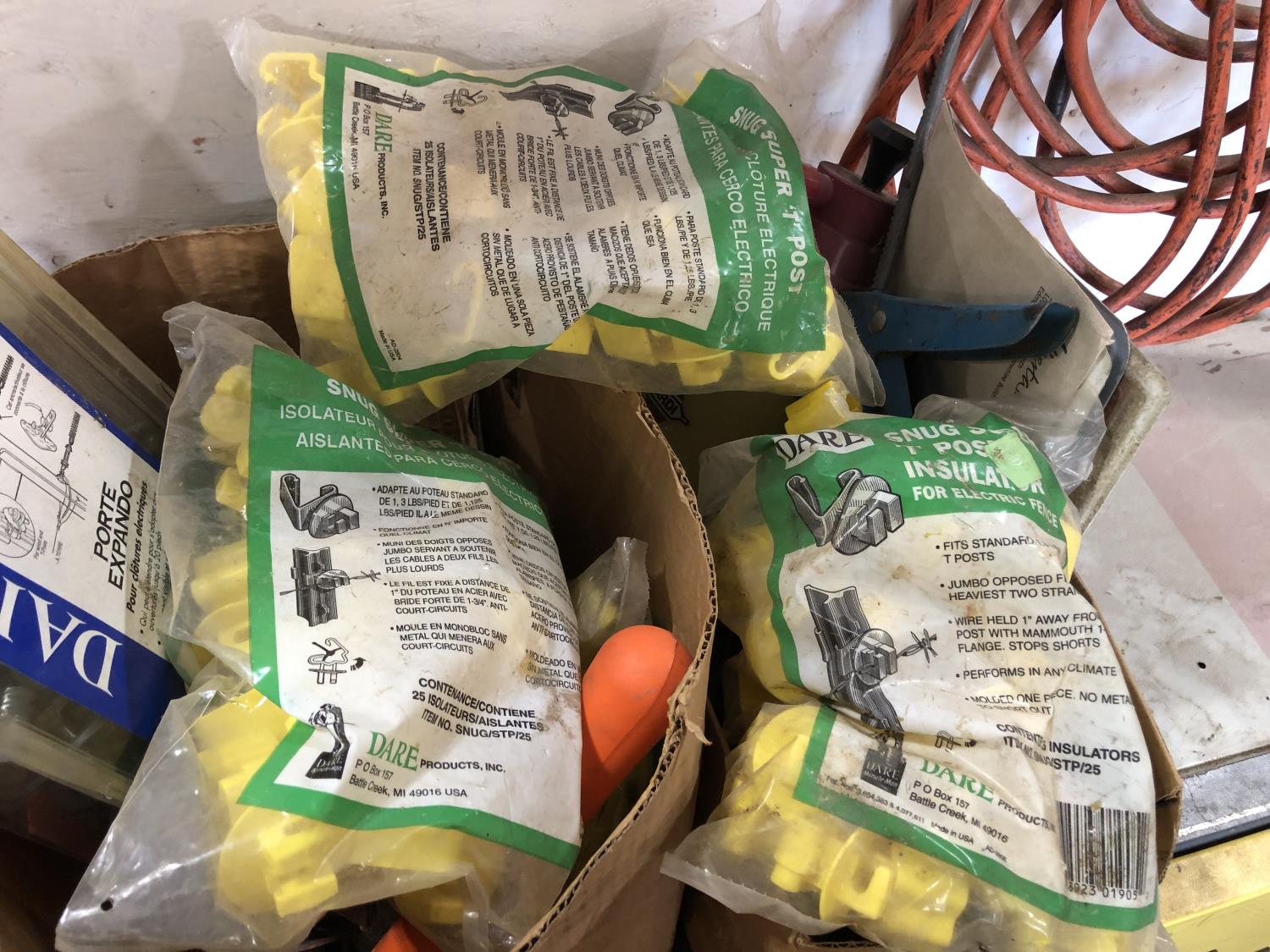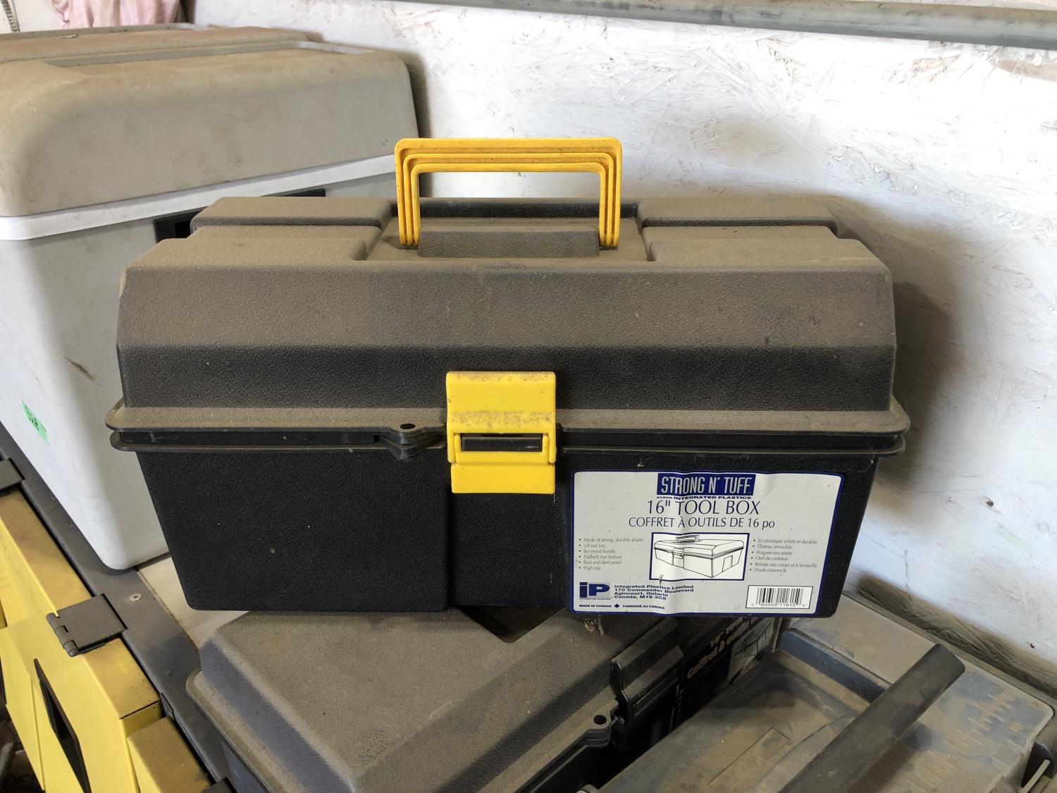 electric cooler (no cord), (7) empty tool boxes, tire repair kit, quantity of electric fence insulators