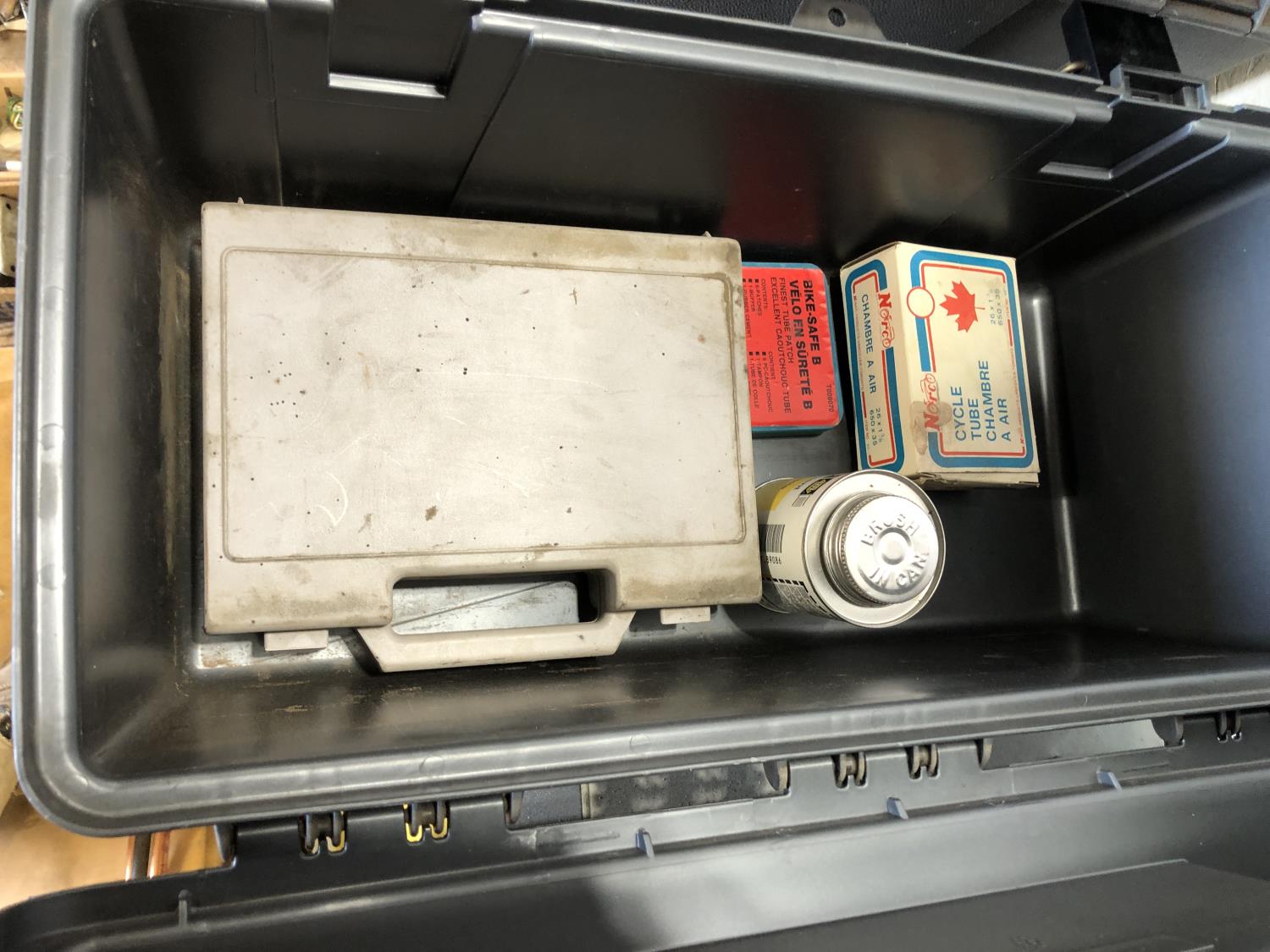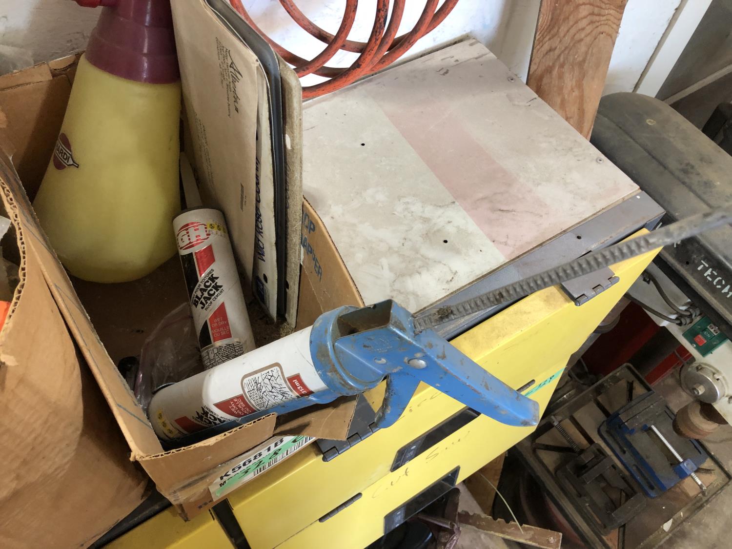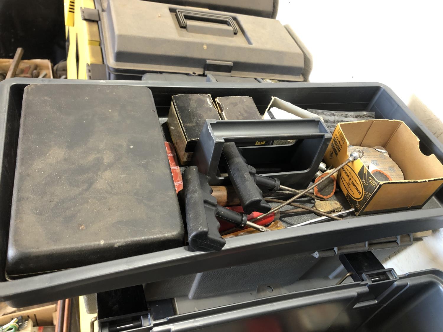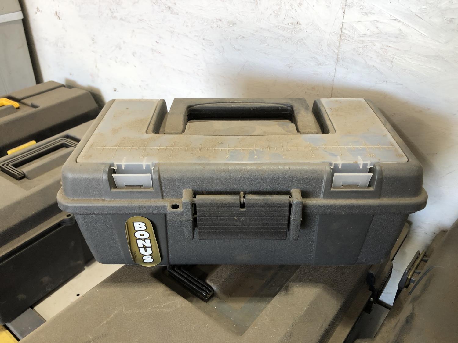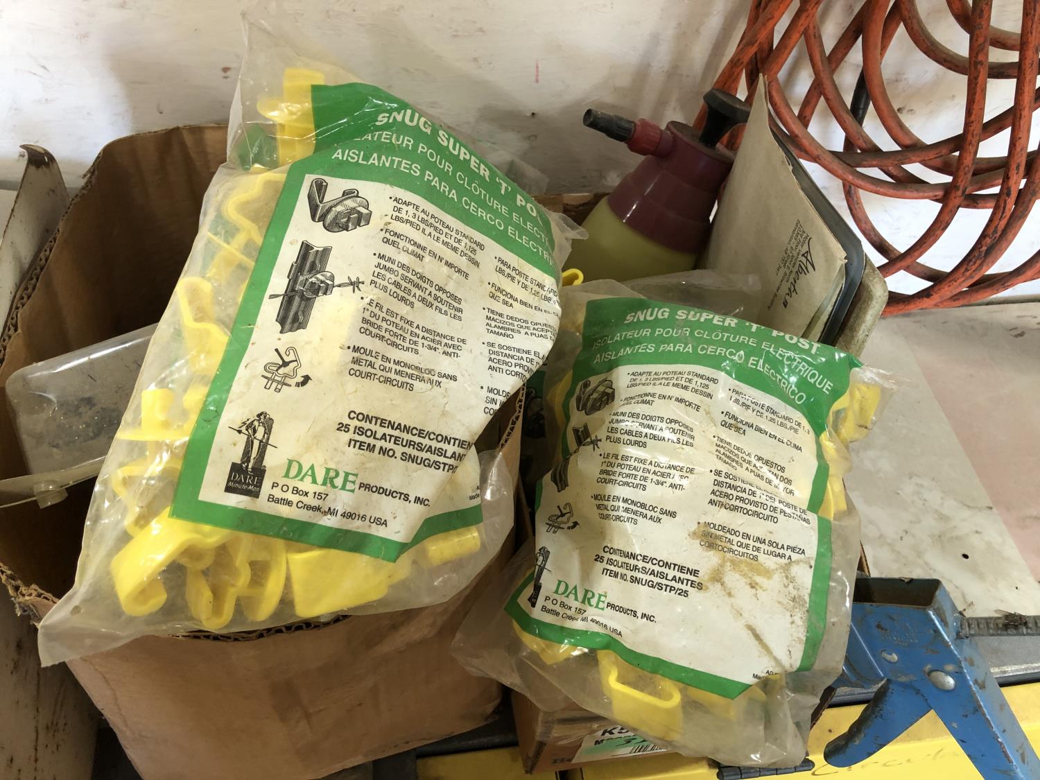 electric cooler (no cord), (7) empty tool boxes, tire repair kit, quantity of electric fence insulators