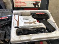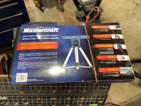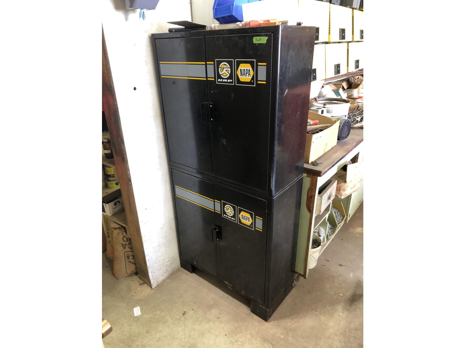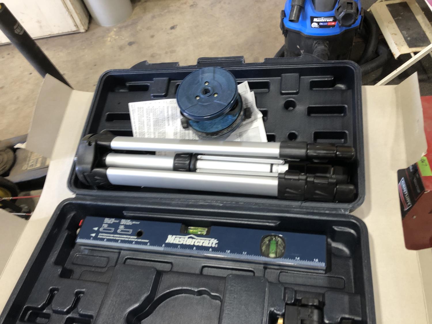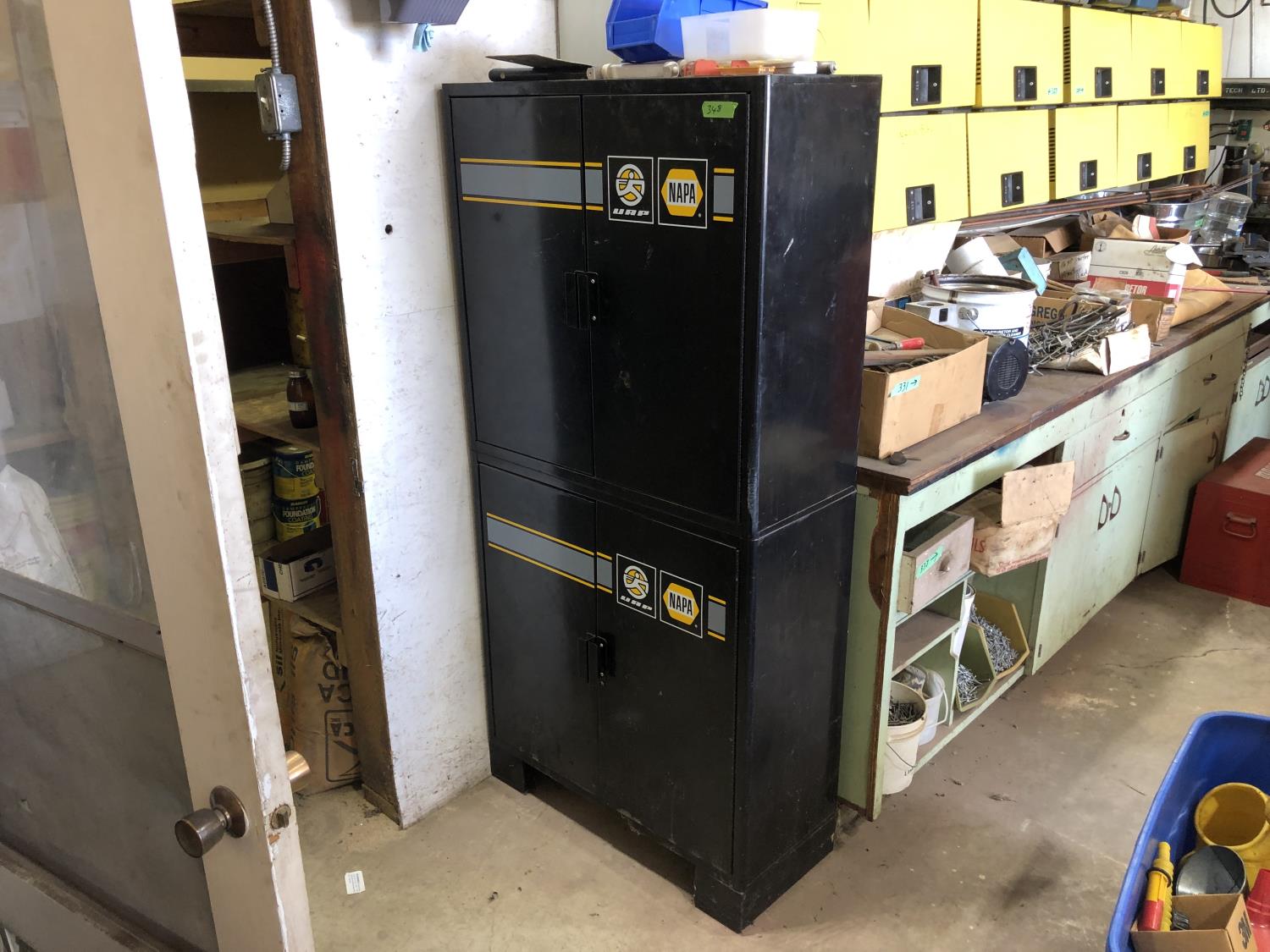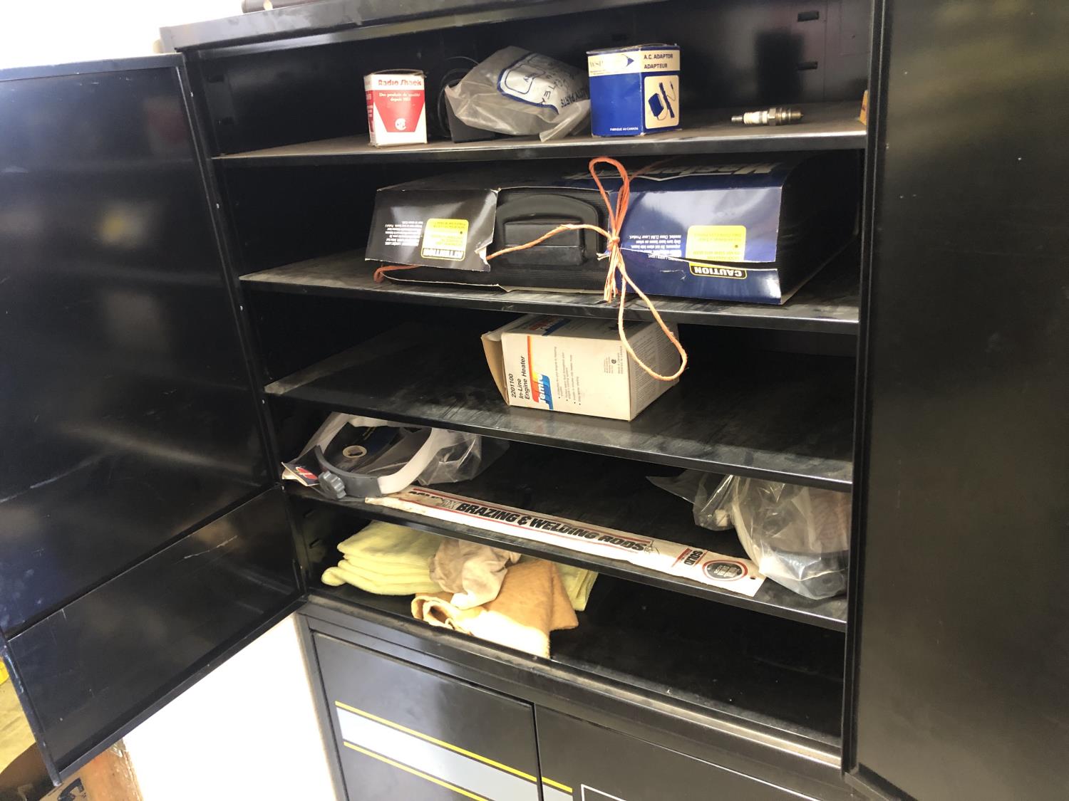 Napa Storage cabinet 32 inch w x 14 inch d x 66 inch h, Mastercraft laser level with adjustable tripod (unused), Tempro in line engine heater (unused), Weller 100/140 watt electric solder gun, Weller D550 240/325 watt electric solder gun in case