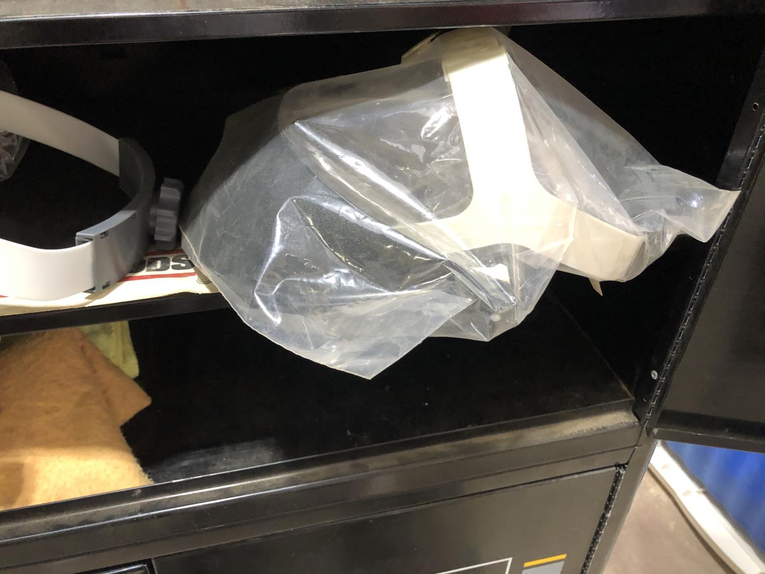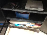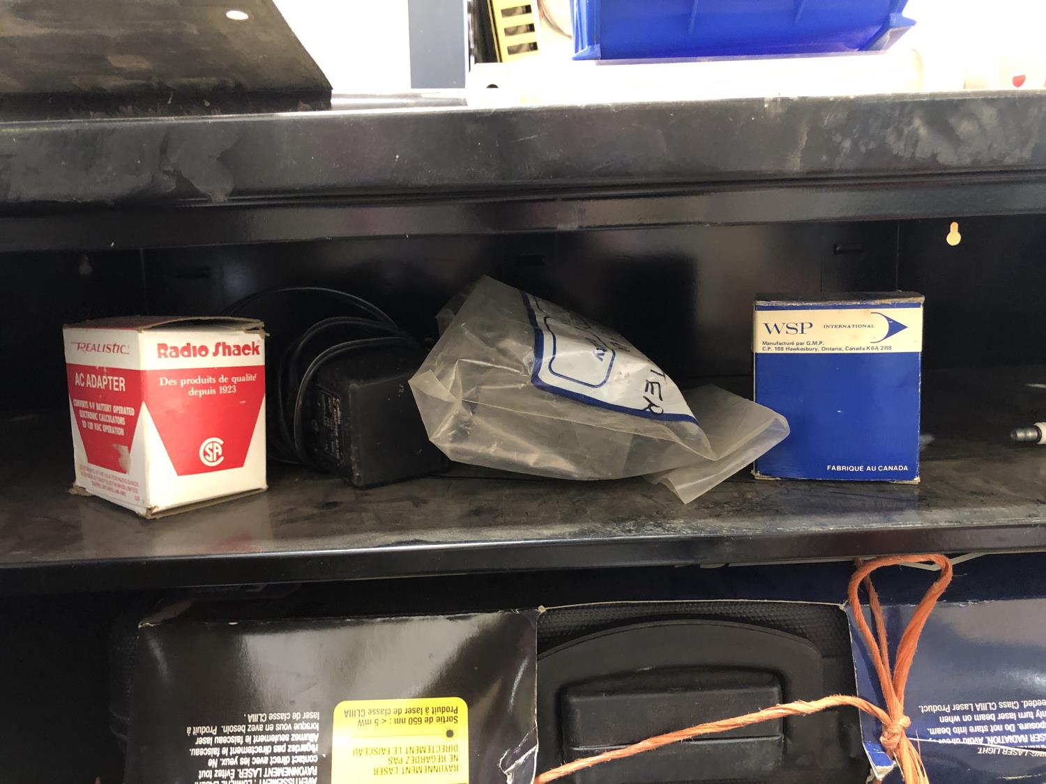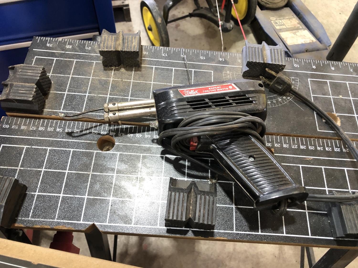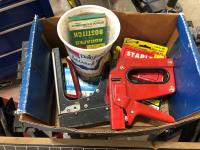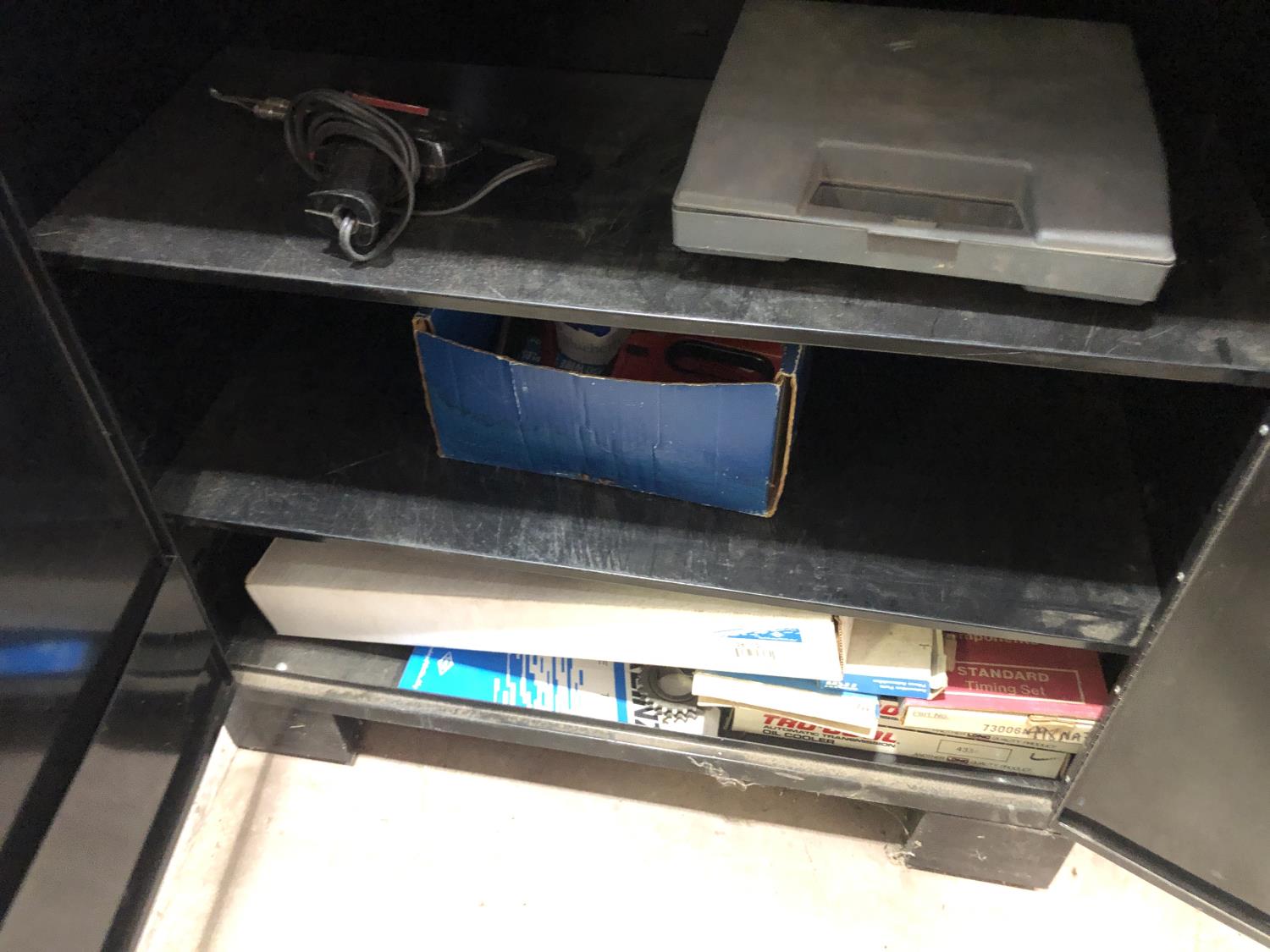 Napa Storage cabinet 32 inch w x 14 inch d x 66 inch h, Mastercraft laser level with adjustable tripod (unused), Tempro in line engine heater (unused), Weller 100/140 watt electric solder gun, Weller D550 240/325 watt electric solder gun in case