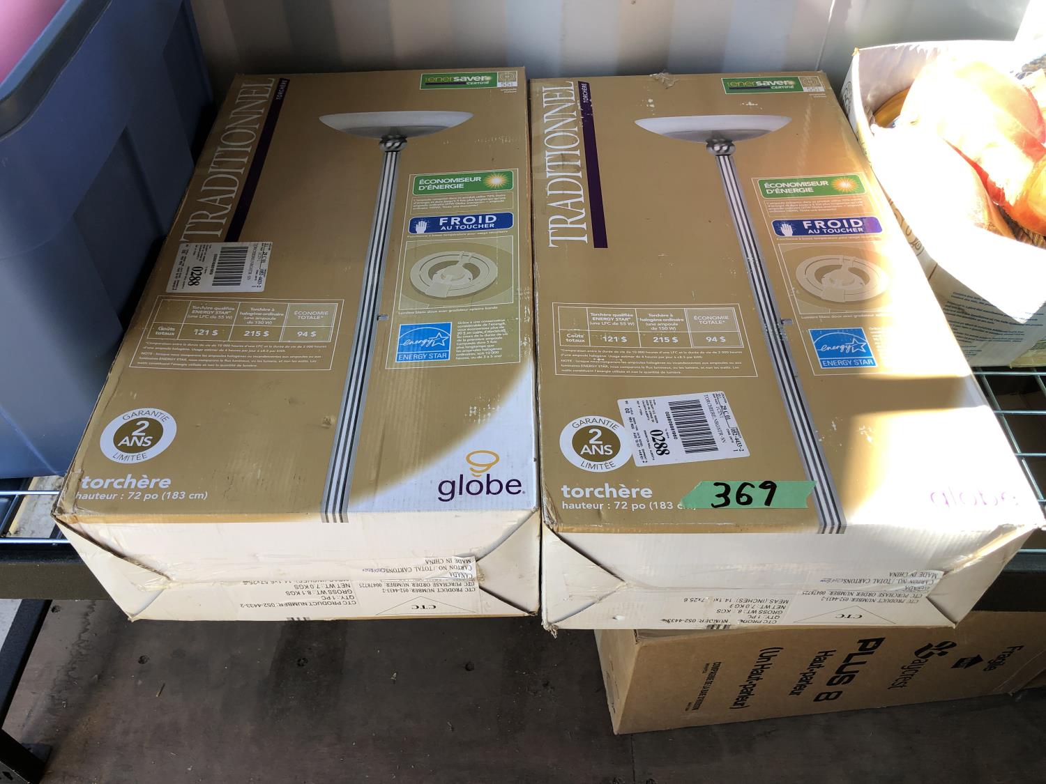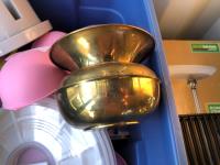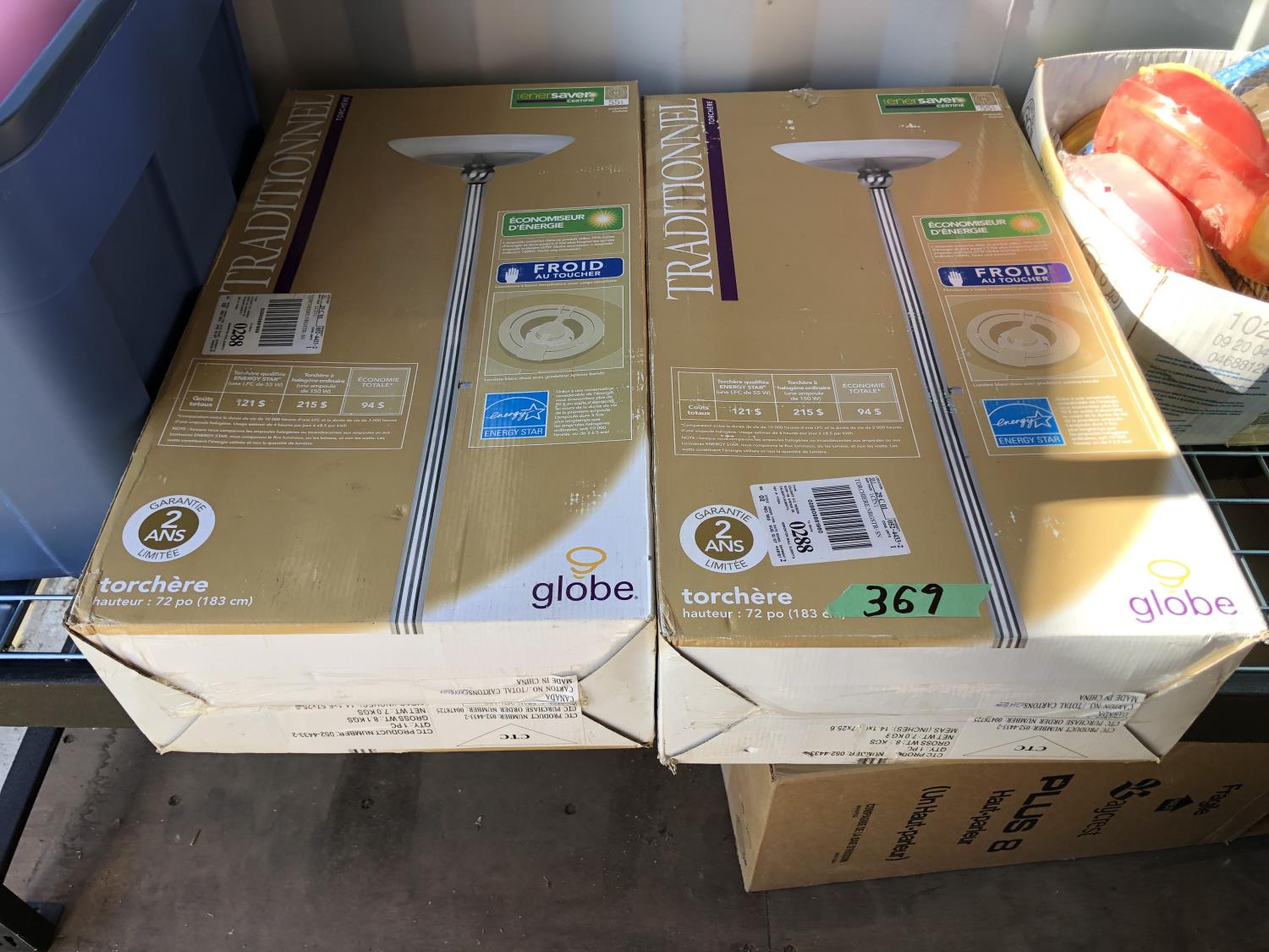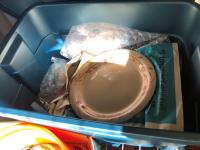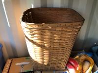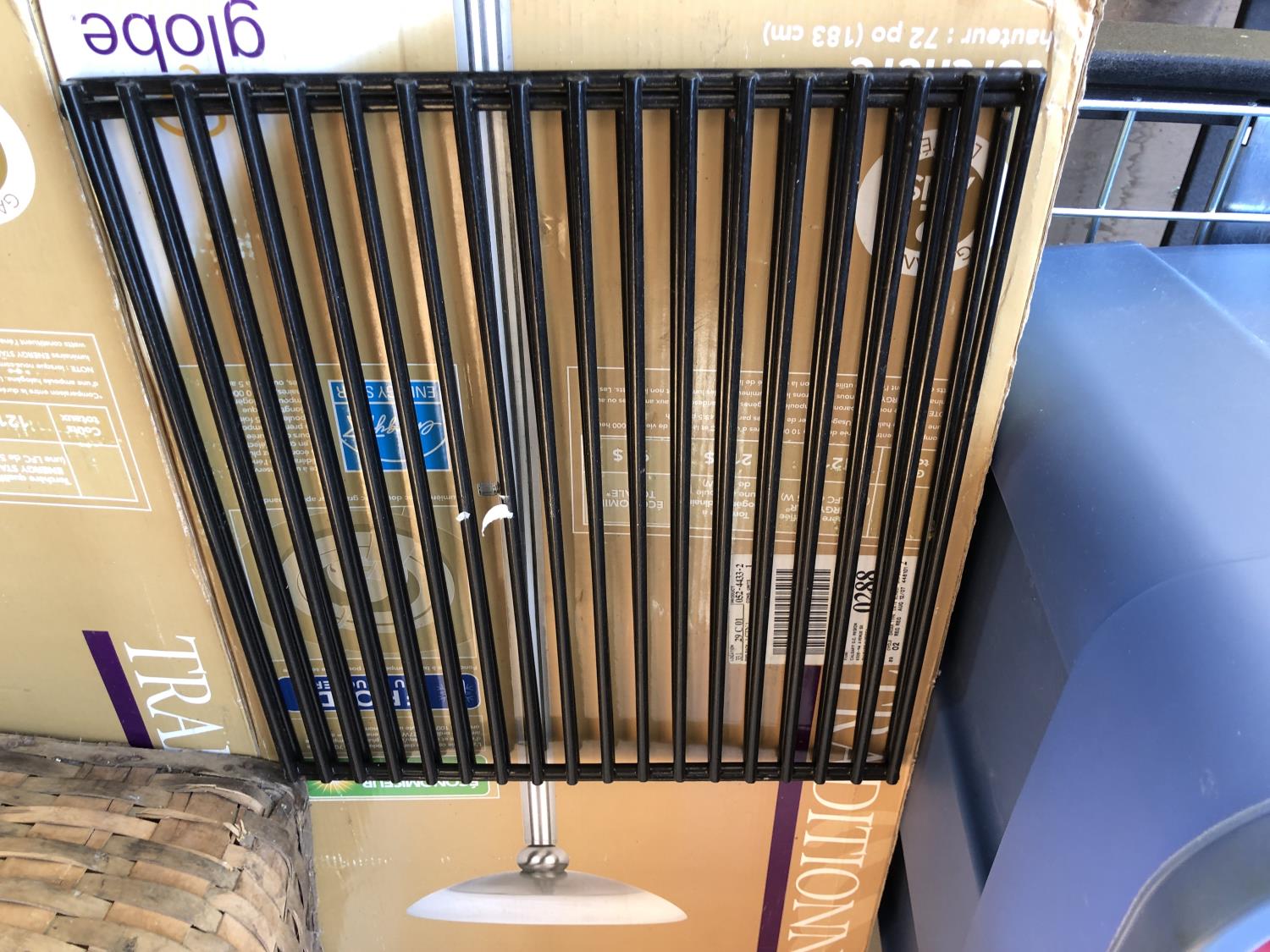 16 inch x 19 inch x 24 inch high wicker basket, (2) 72 inch high up-lights (unused), (2) wire grills 13 inch x 14 inch, (3) unused swing seats, quantity of dishes, miscellaneous houseware