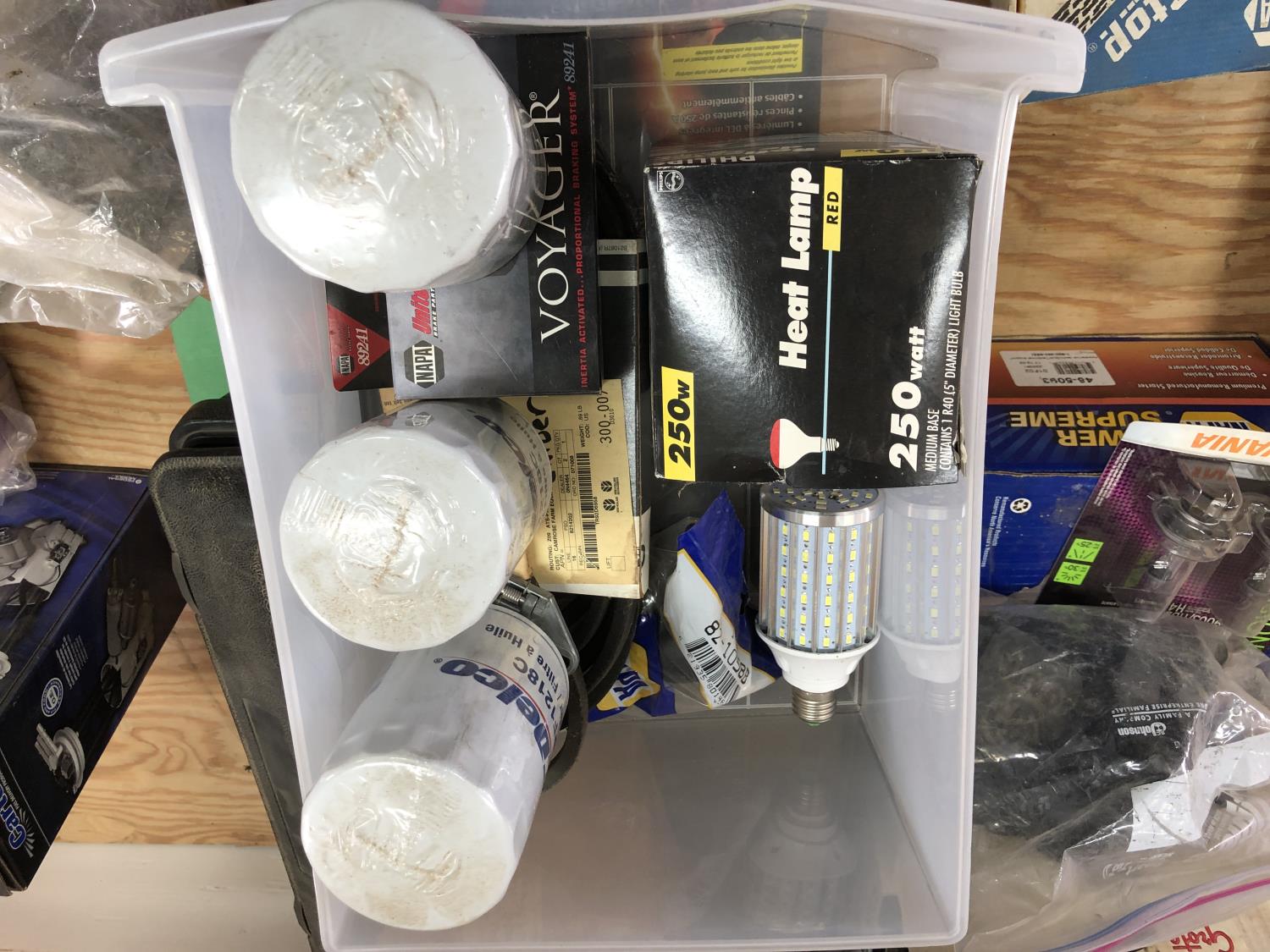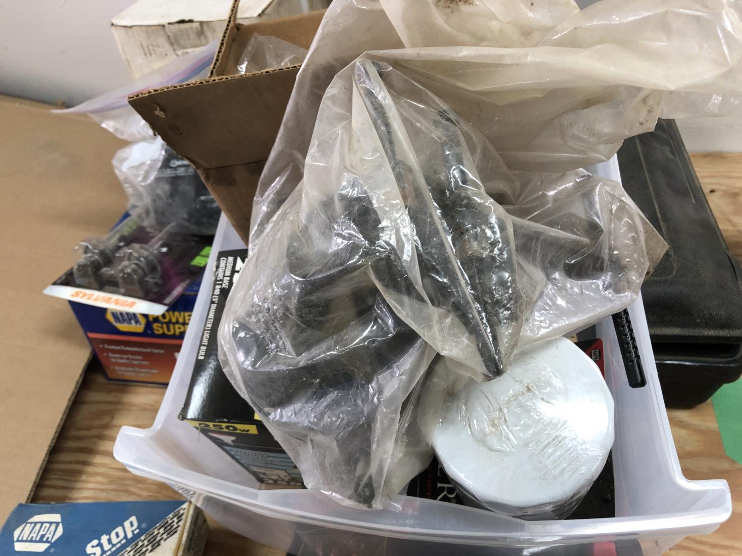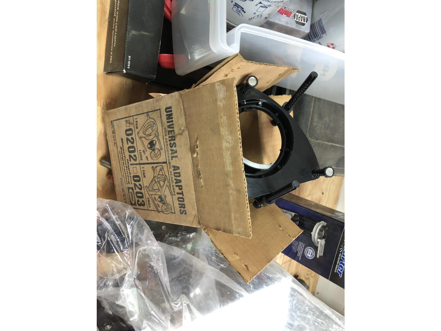 selection of floor mats, set of Eliminator booster cables (unused), (4) sponges (unused), vehicle hood protector, Carter fuel pump (unused), NAPA starting motor (unused), Premium alternator, (2) amber dome rotating lights, Safety Stop brake set (unused), (2) 9003/HB2 H4 headlamp bulbs, headlight aiming service kit, miscellaneous bulbs/lamps & filters