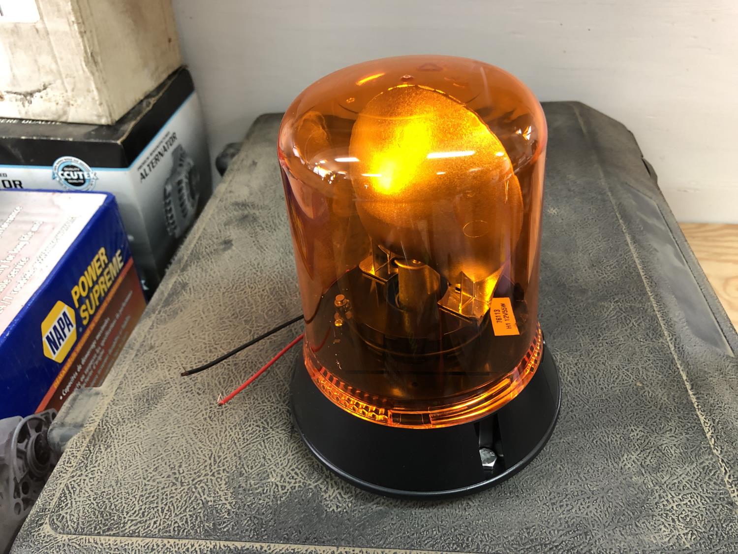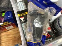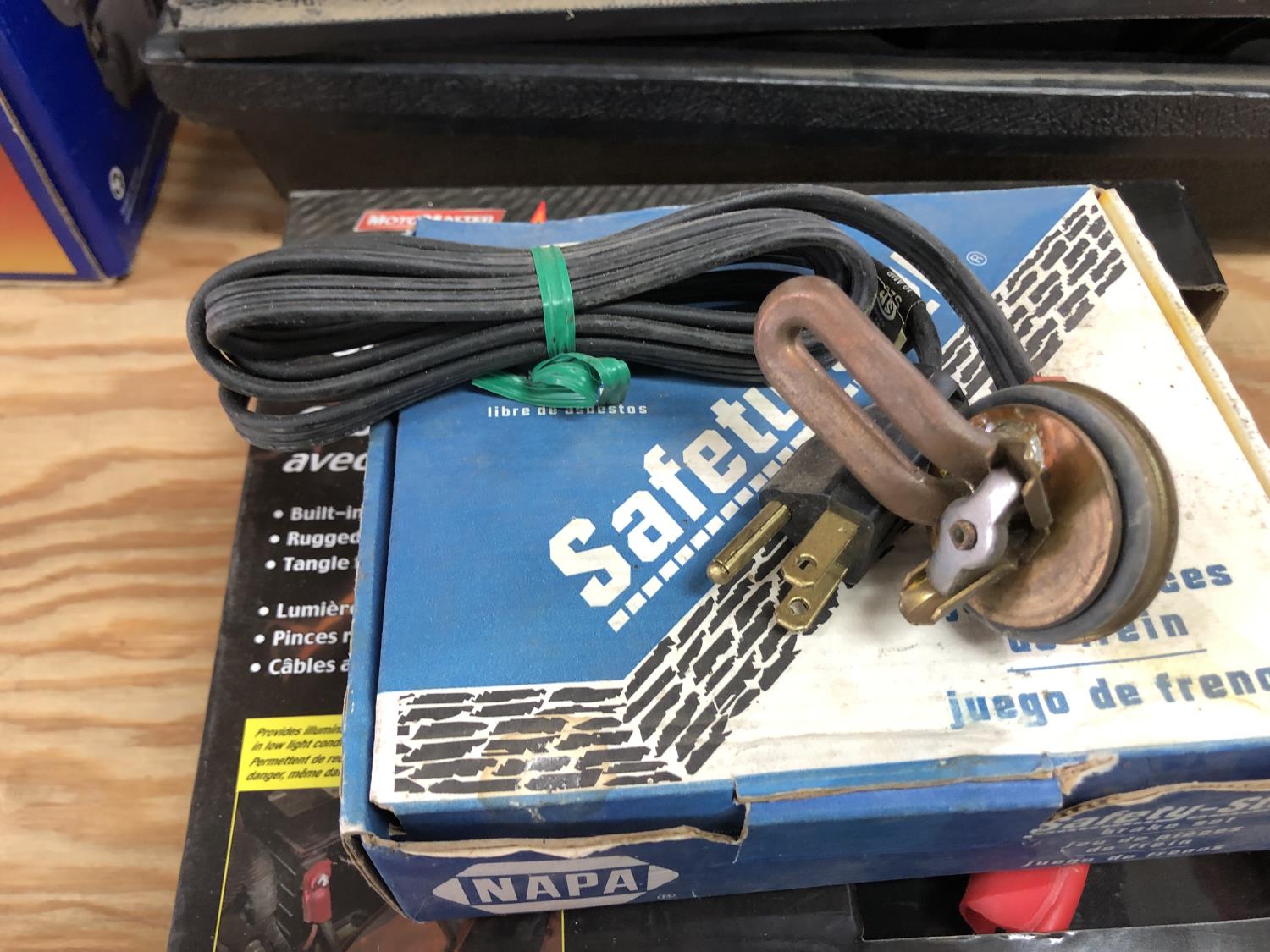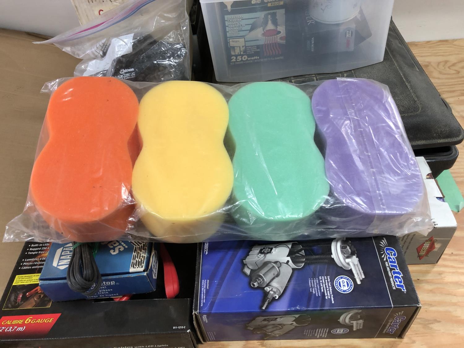 selection of floor mats, set of Eliminator booster cables (unused), (4) sponges (unused), vehicle hood protector, Carter fuel pump (unused), NAPA starting motor (unused), Premium alternator, (2) amber dome rotating lights, Safety Stop brake set (unused), (2) 9003/HB2 H4 headlamp bulbs, headlight aiming service kit, miscellaneous bulbs/lamps & filters