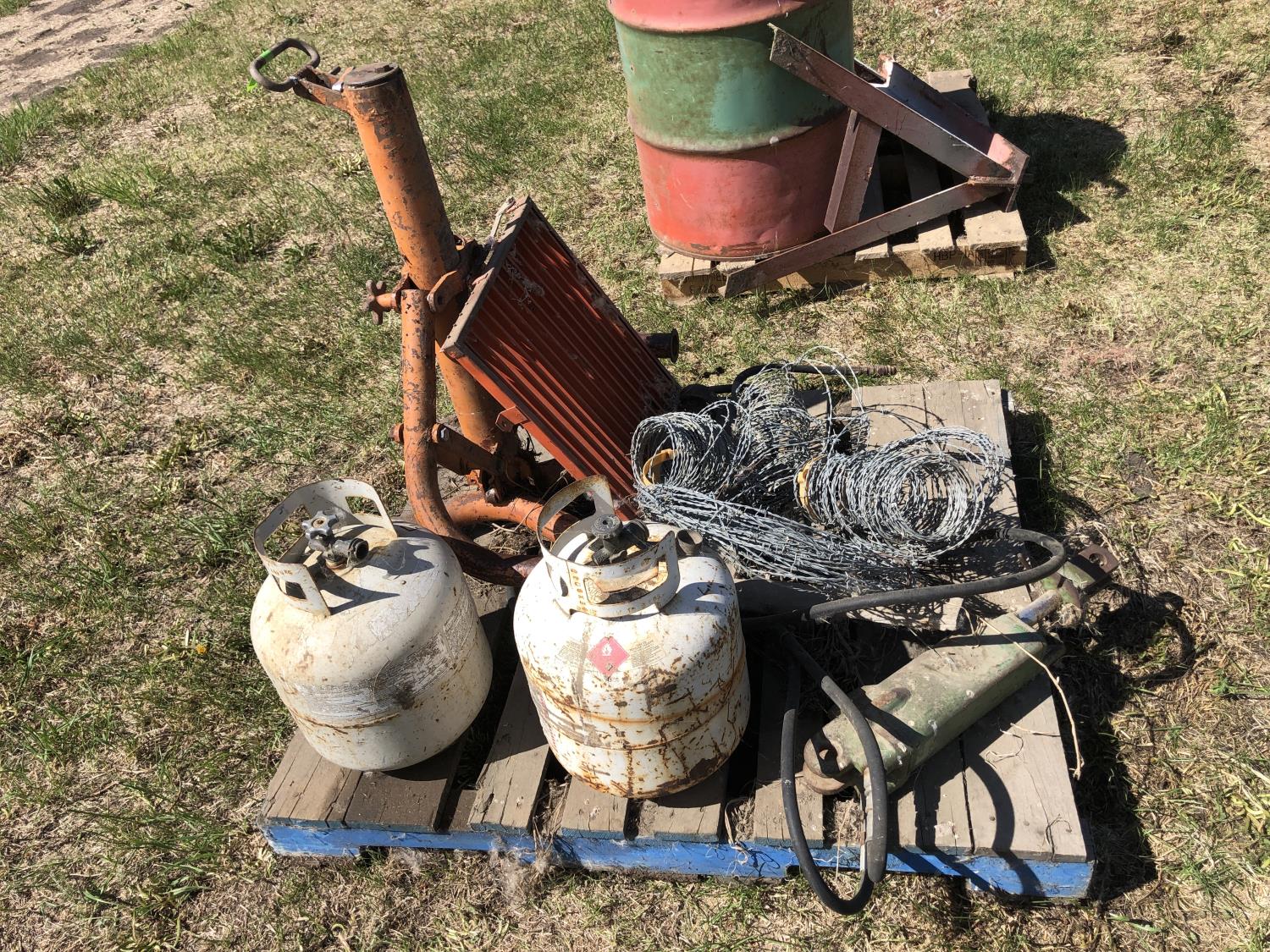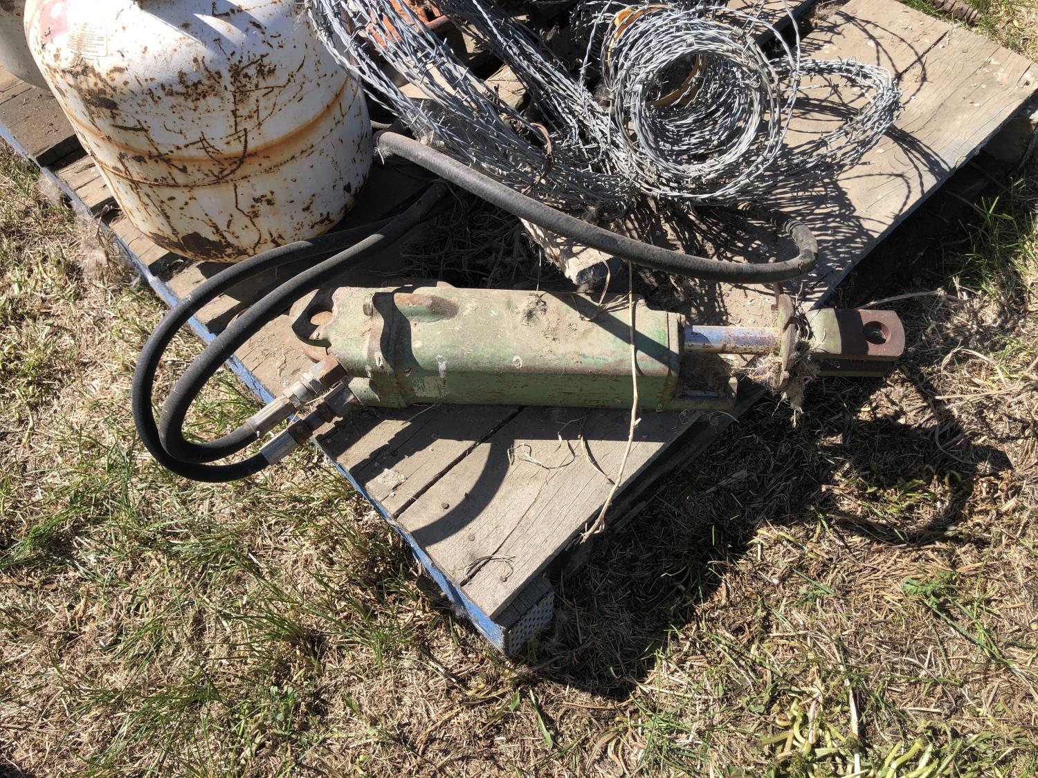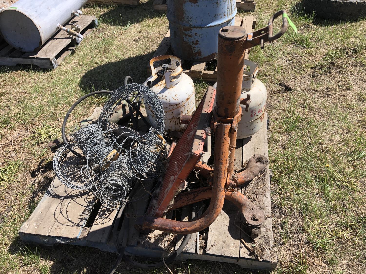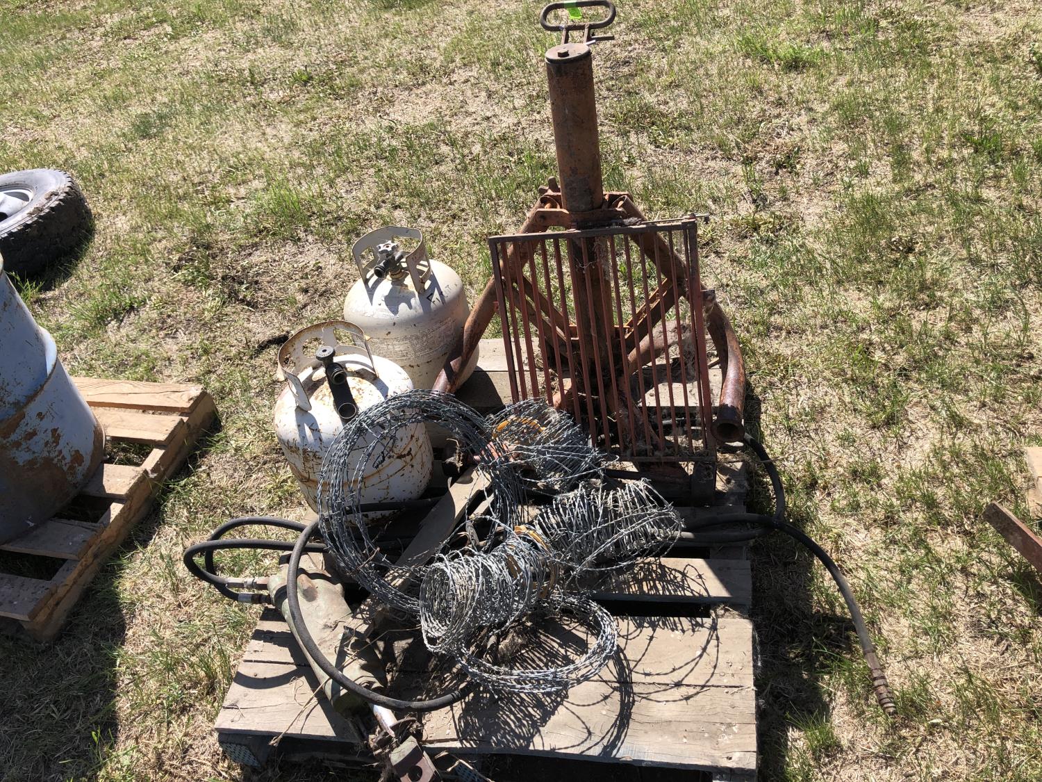 bumper jack, (2) empty propane bottles, quantity of barb wire, louver vent 22 inch x 17 inch, hydraulic piston 12 inch casing