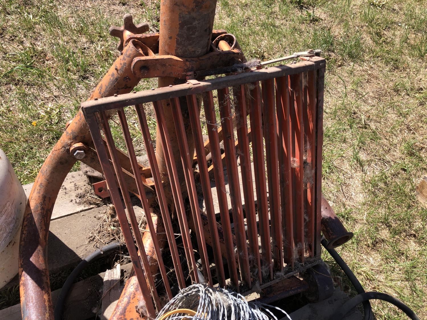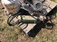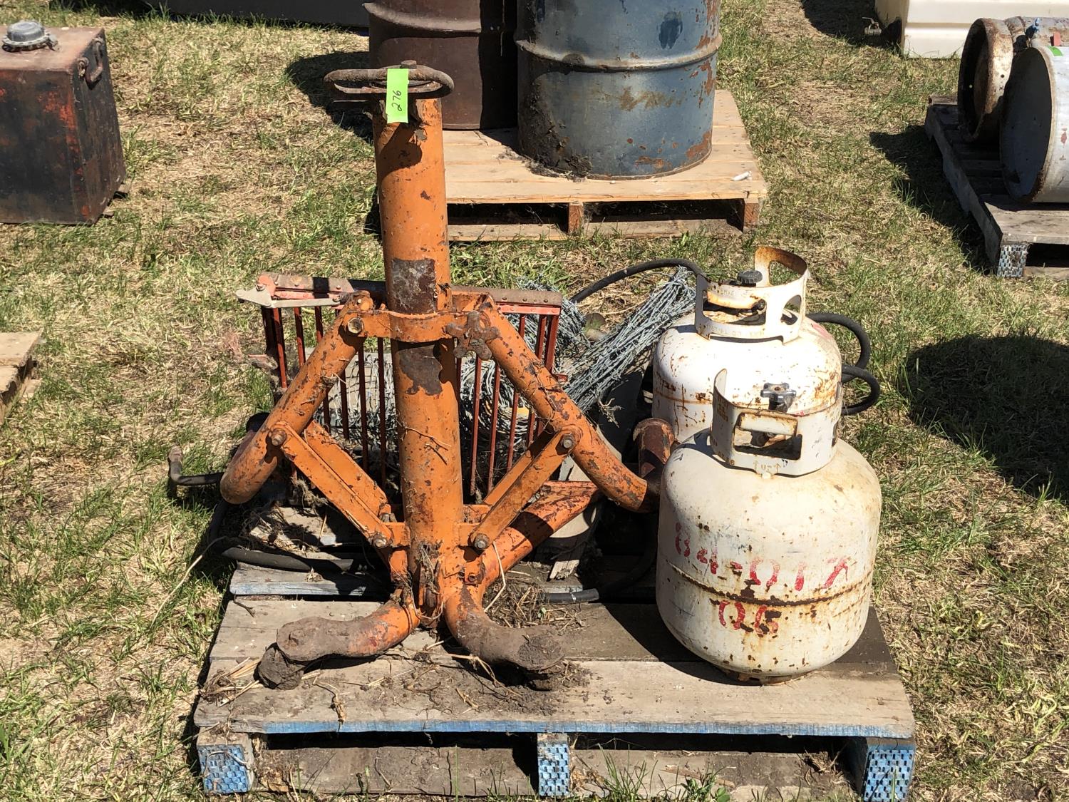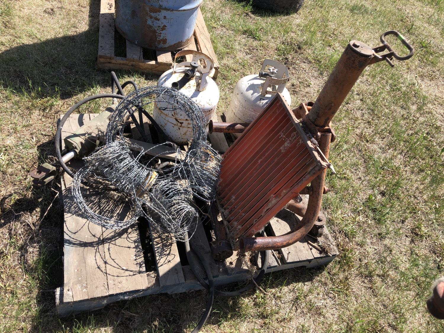 bumper jack, (2) empty propane bottles, quantity of barb wire, louver vent 22 inch x 17 inch, hydraulic piston 12 inch casing