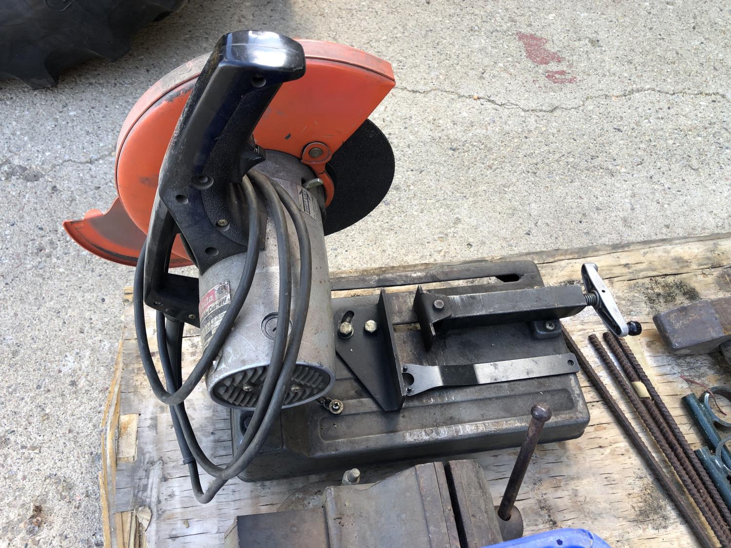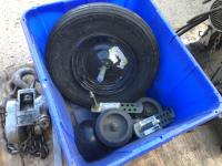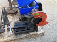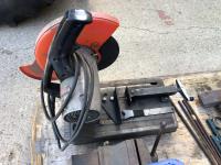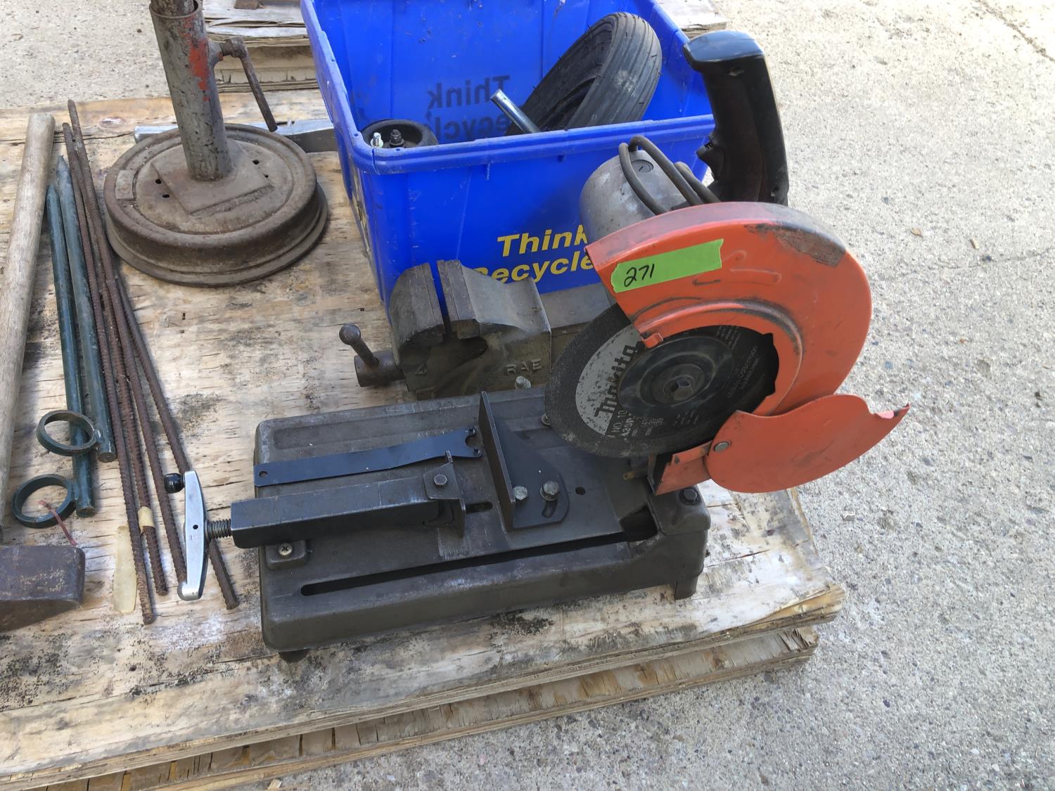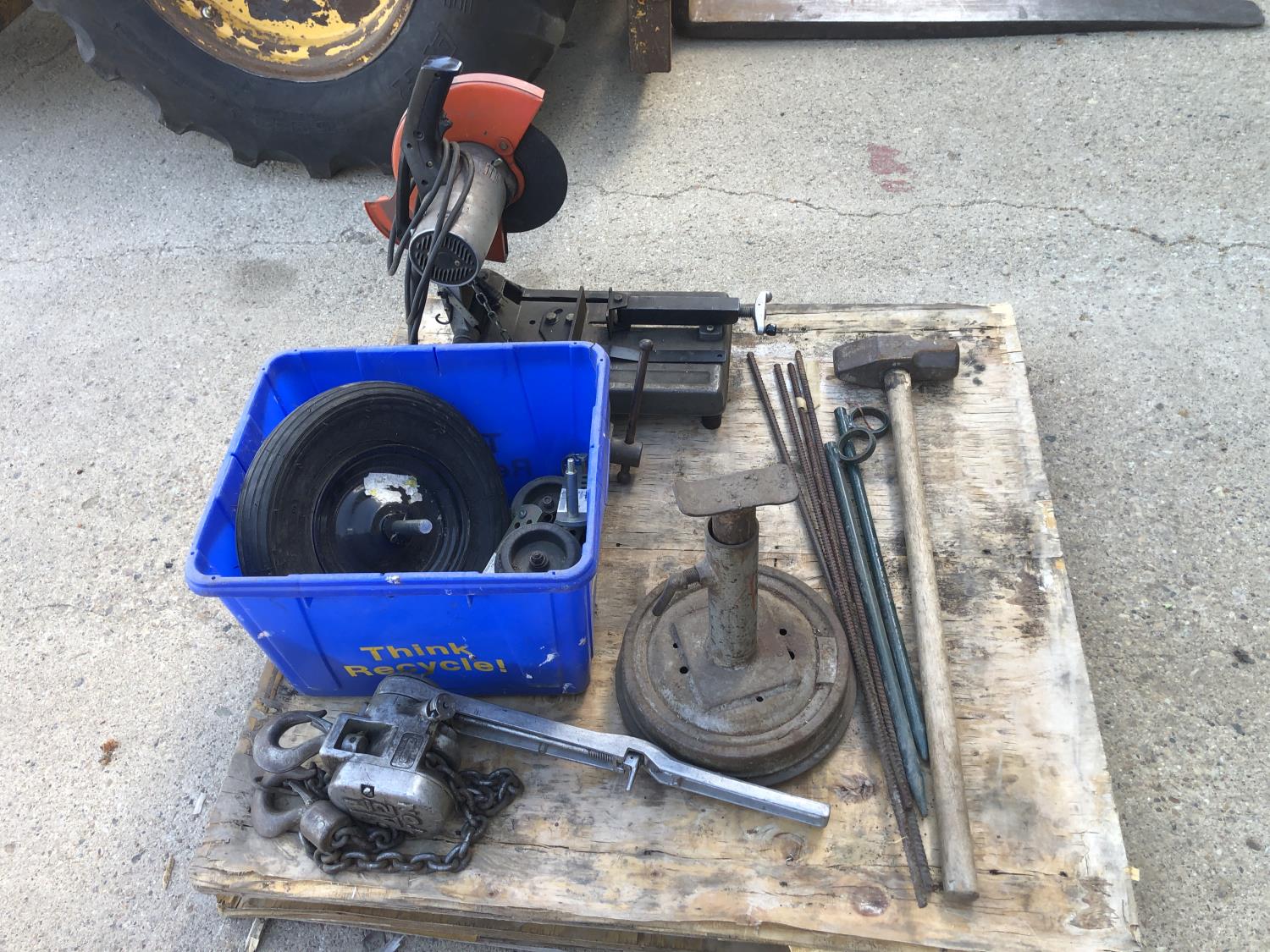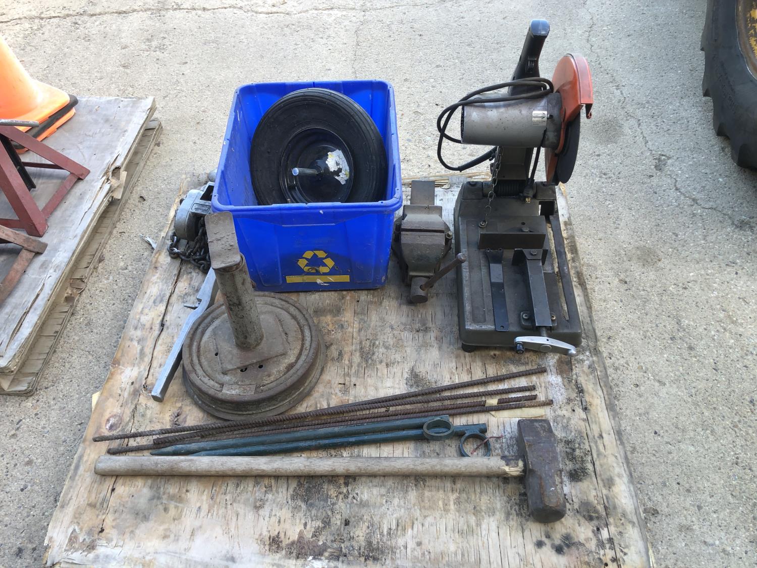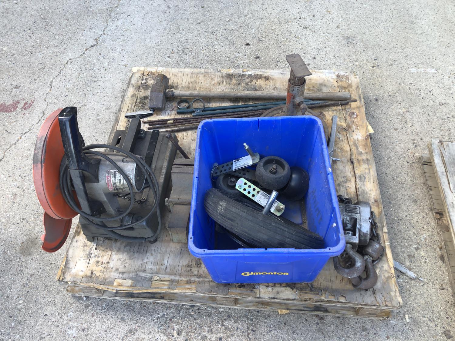 Makita 12 inch portable cut off saw, 4 inch bench vise, sledge hammer, (2) 2 ft stakes, (4) pieces of rebar, shop built axle stand, (4) dolly wheels, wheel barrow wheel, 1-1/2 ton hand crank winch