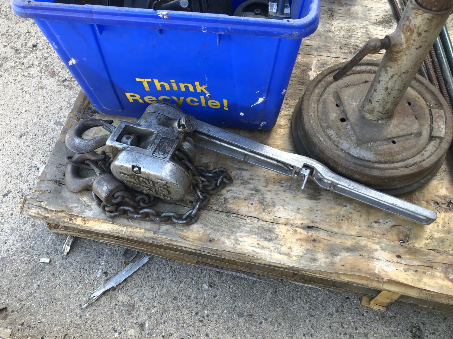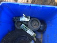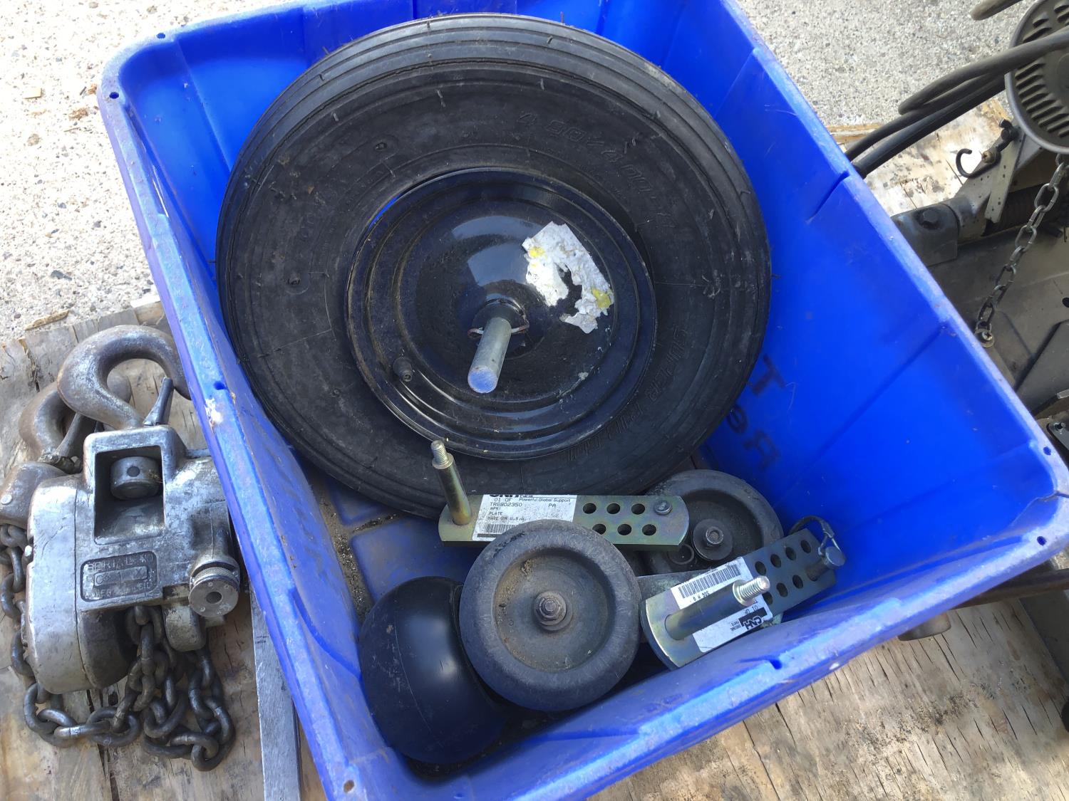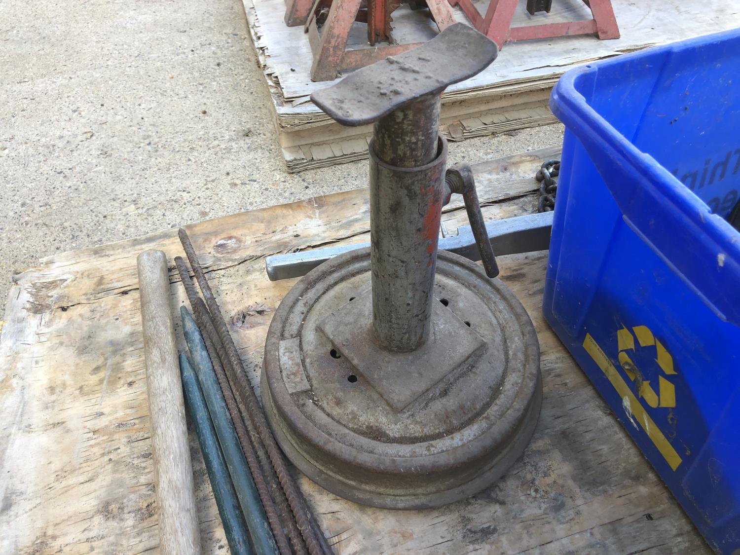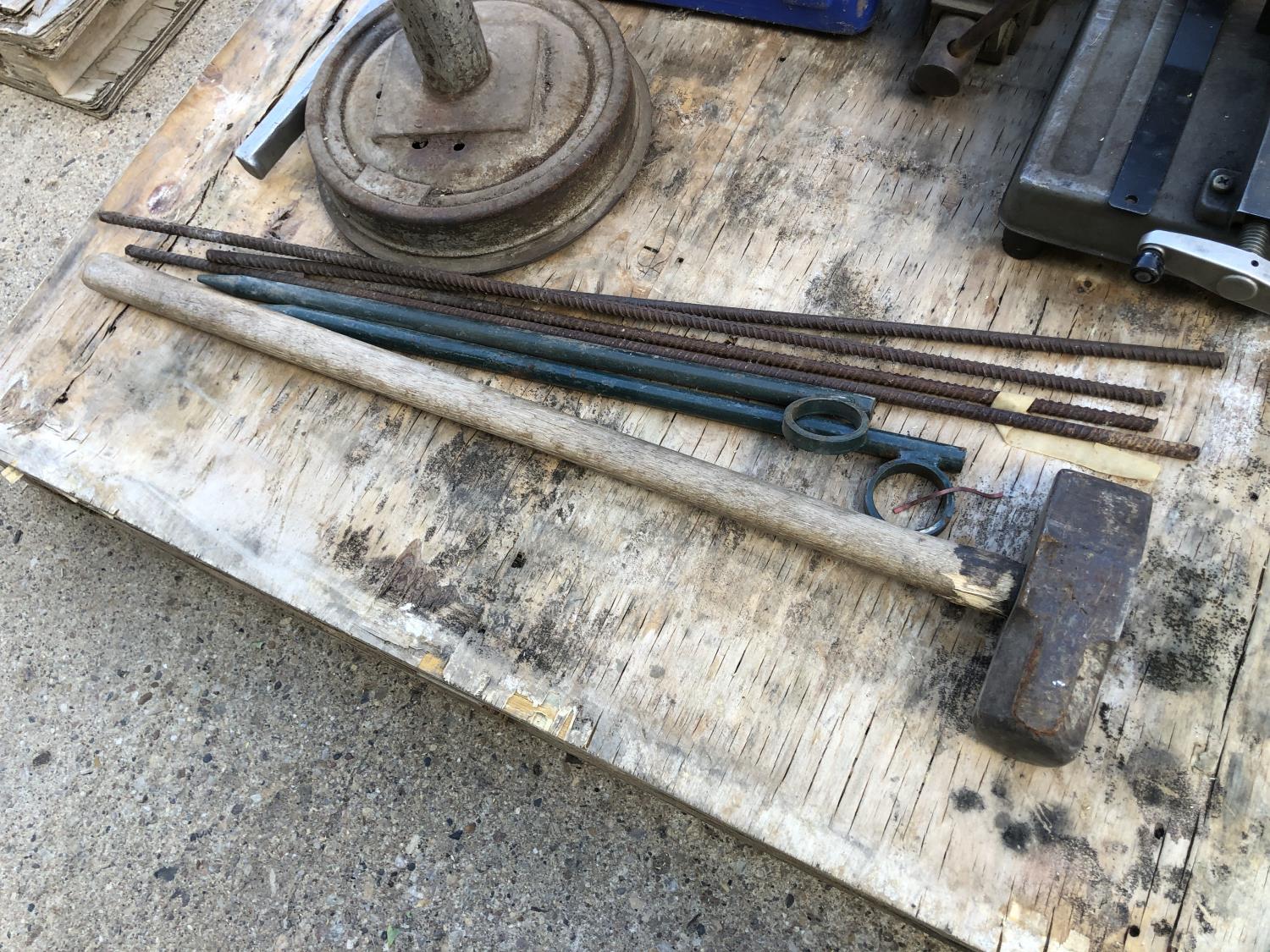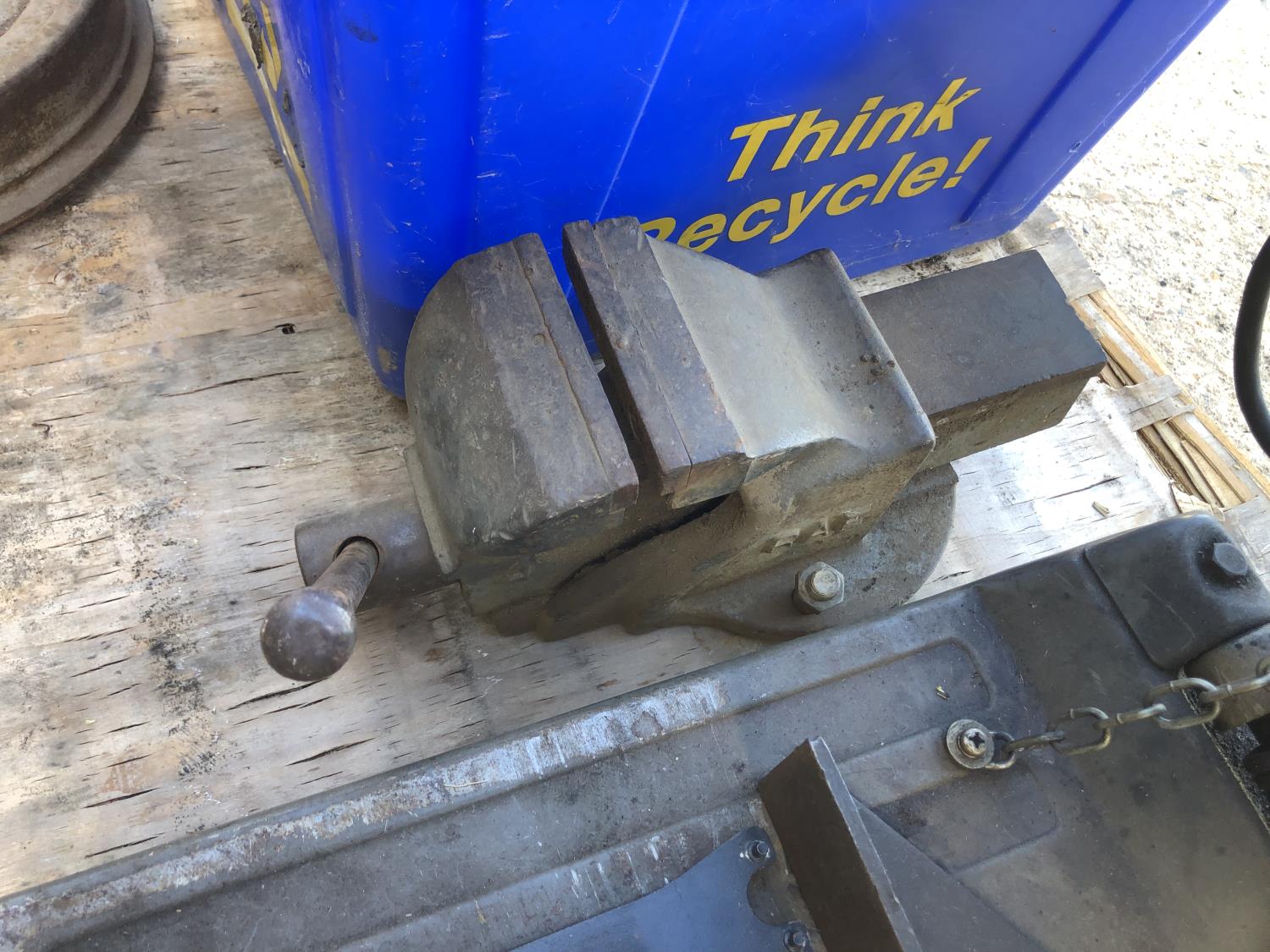 Makita 12 inch portable cut off saw, 4 inch bench vise, sledge hammer, (2) 2 ft stakes, (4) pieces of rebar, shop built axle stand, (4) dolly wheels, wheel barrow wheel, 1-1/2 ton hand crank winch