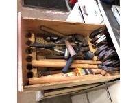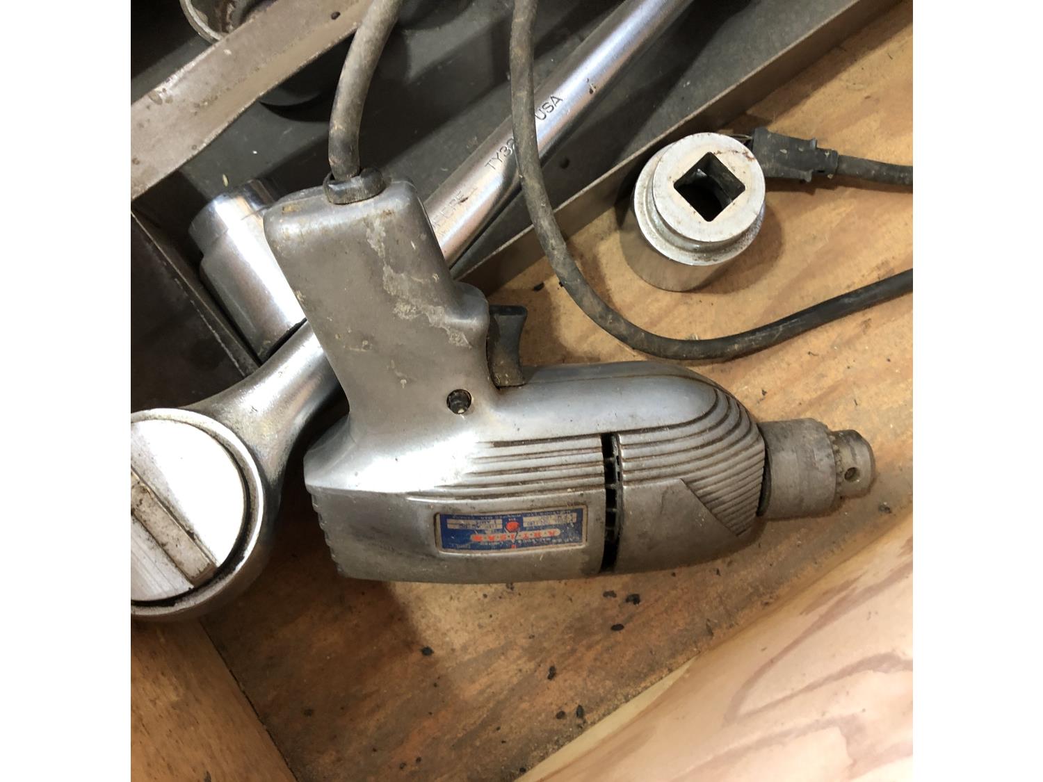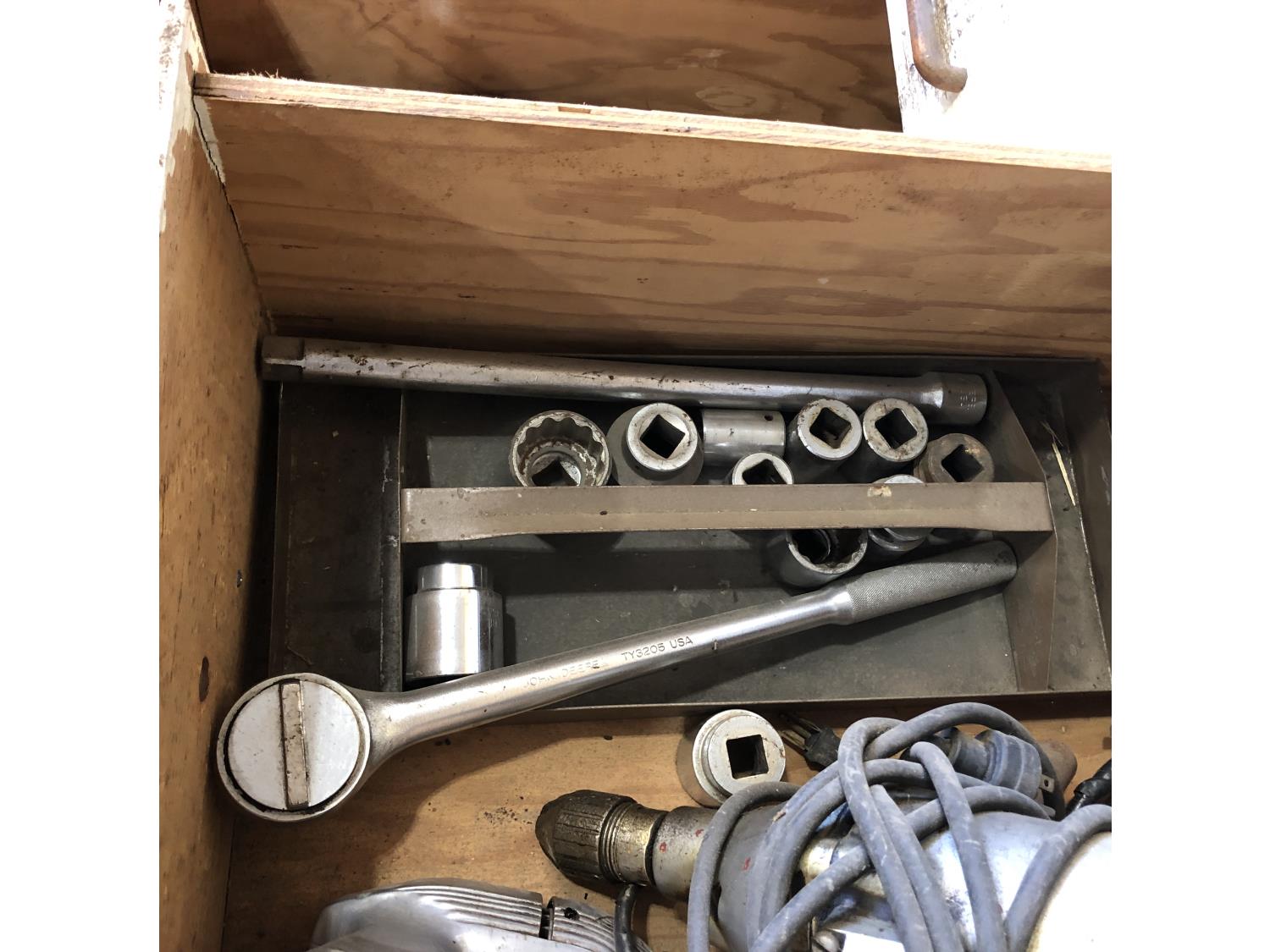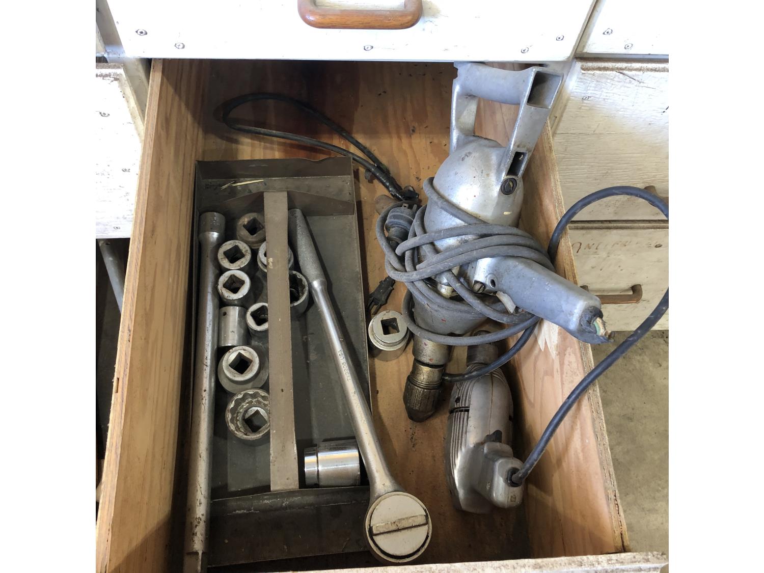 3/4 inch drive socket set, various hand saws, 3/4 inch ratchet extension and sockets, Artisan electric drill, various size shackles, Home utility 1/2 inch electric drill, various hammers **Note: drawers not included