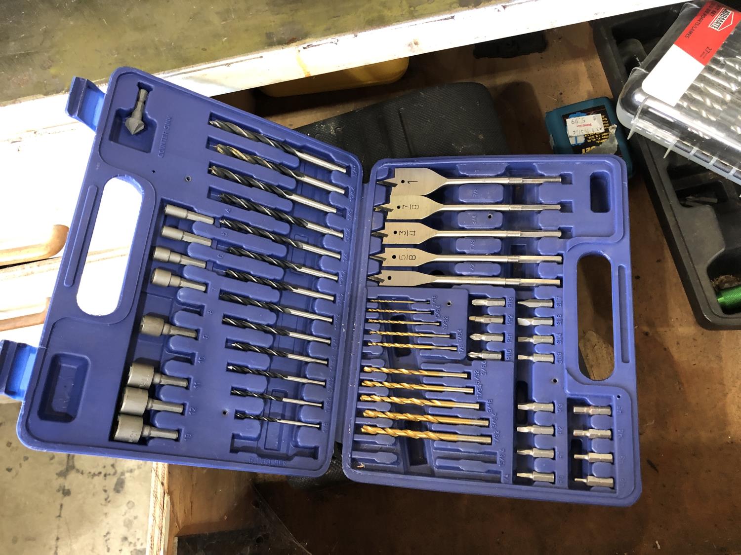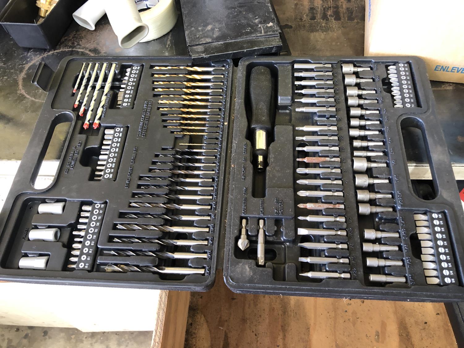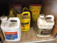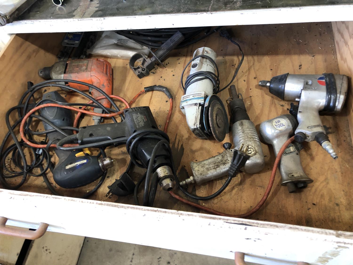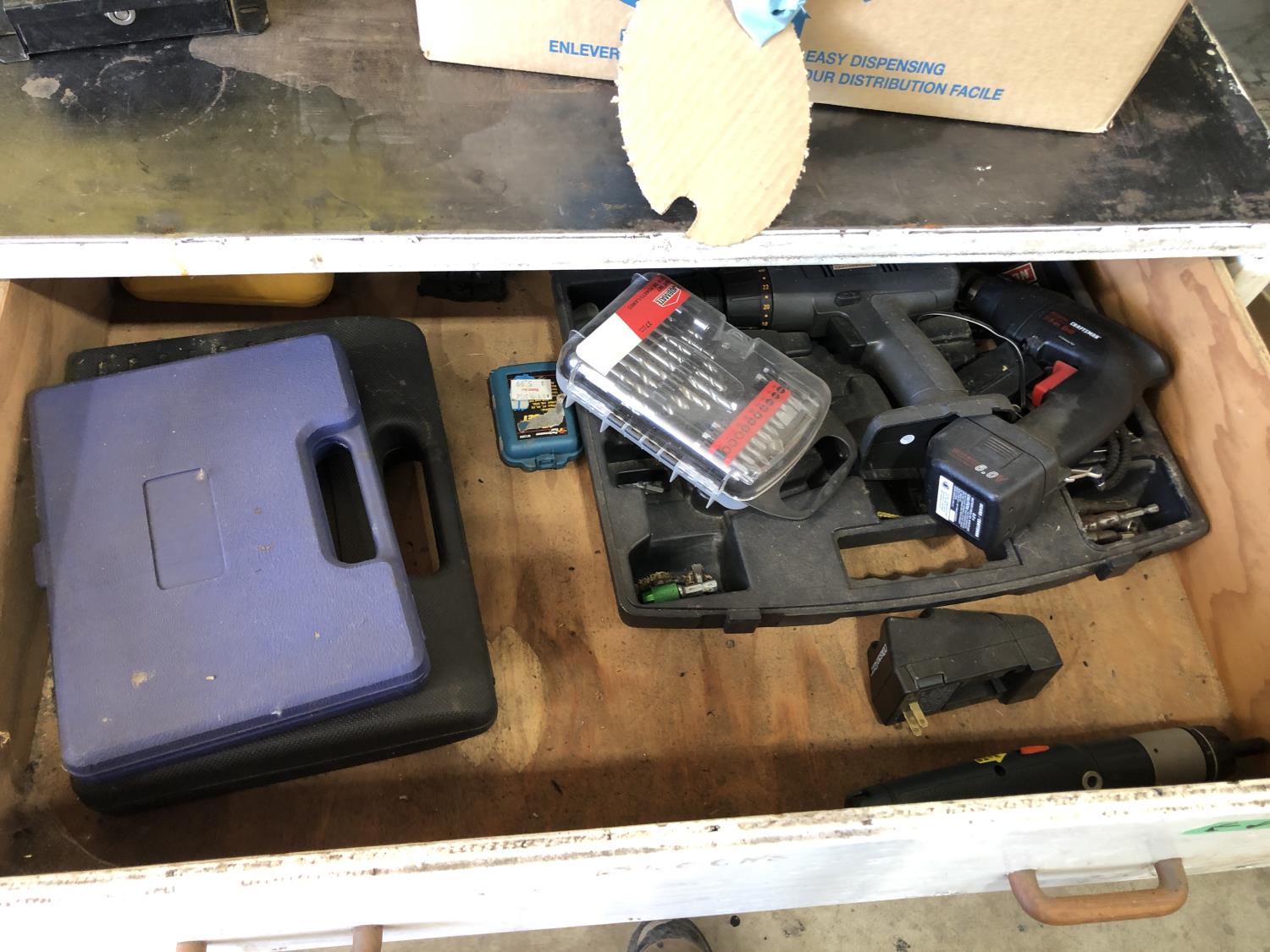 various electric and air tools, (3) drill/tool sets, 1/4 inch drive socket set, Ryobi SS180 speed saw (unused), Craftsman 3/8 inch cordless drill, Black & Decker 2 position cordless screw driver, Craftsman 14.4 cordless drill (battery missing), 20 L Petro-Canada type F transmission fluid, (2) 10 L Prestone diesel antifreeze, 9.46 Cool-Guard antifreeze Shell SP RAX HD oil, (12) 1L Duron XL engine oil, 20 L Shell SRS 2000, 20 L Harmony AW68 (part used) ** Note: drawers not included **
